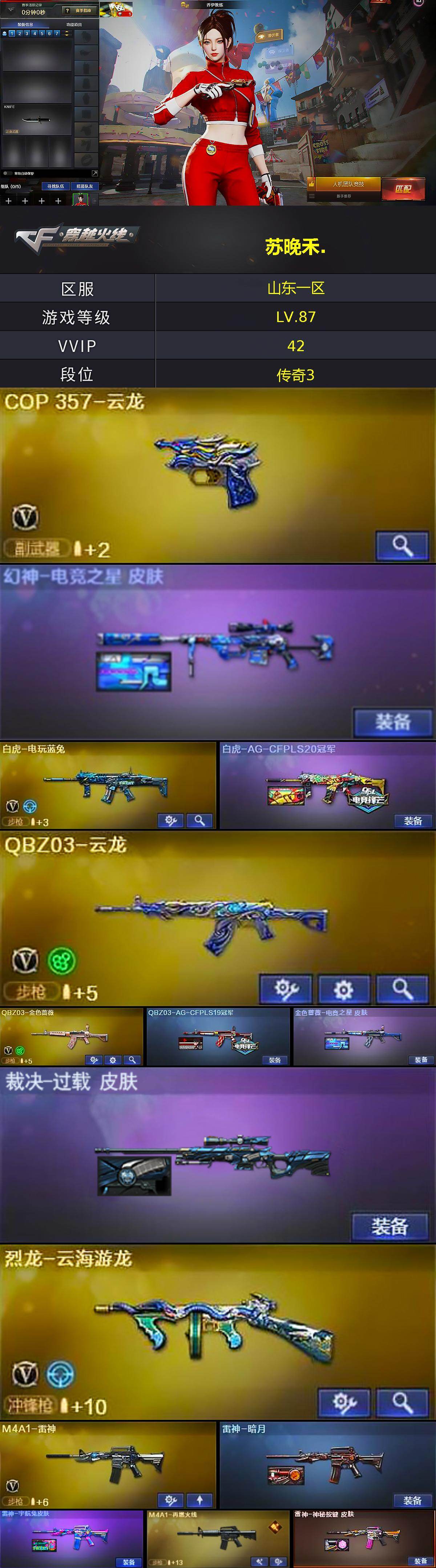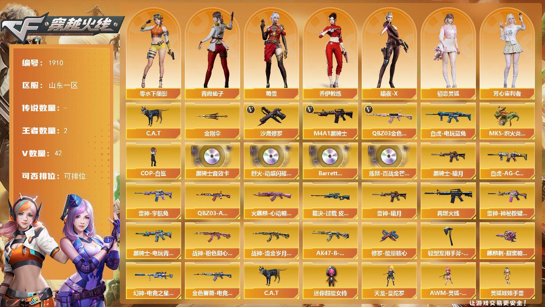 [16335672]山东一区-49V-2王者武器数-0炫金武器数 【热门武器】:QBZ03-金色蔷薇,白虎-电玩蓝兔,C.A.T,M4A1-黑骑士,MK5-炽火炎龙,COP-白鲨,沙鹰-修罗,金刚伞 【音效卡】:烈火-动感闪耀 音效卡,M4A1-黑骑士音效卡,Barrett-碧霄极光音效卡,炼狱-百战金芒-庆典舞曲音效卡 【皮肤】:幻神-电竞之星 皮肤,白虎-AG-CFPLS20冠军,QBZ03-AG-CFPLS19冠军,金色蔷薇-电竞之星 皮肤,裁决-过载 皮肤,雷神-暗月,雷神-宇航兔皮肤,M4A1-再燃火线,雷神-神秘按键 皮肤,火麒麟-心动糖果,黑骑士-暗月,黑骑士-电玩青兔皮肤,战神-粉色甜心皮肤,战神-流金岁月皮肤,AK47-B-常胜将军-刘备*2,修罗-能量核心,轻型军用手斧-再燃火线,麒麟刺-甜蜜糖果 皮肤 【角色】:乔伊教练,暗夜-X,初恋灵狐,芳心审判者,飞虎队-X,风暴女,虎妞,嘉年华灵狐,娟娟,兰-新年限定,兰妹妹,零-水下丽影,龙儿,麻雀,潘多拉-甜心教官,青霞仙子,斯沃特-X,蜀雪,雪莉杨-摸金校尉,影武者-X,游珑儿 【人偶武器】:COP-白鲨,天龙-曼陀罗,MK5-炽火炎龙,AWM-灵狐-15周年嘉年华*2,C.A.T,深渊终结者手雷,迷你超能女侍,沙鹰-夜玫瑰,灵狐娃娃手雷 【挑战大师】:冰龙粉碎者-白马银枪,激光毁灭者III-白马银枪,神圣爆裂者-末日III 【英雄级武器】:AK47-火麒麟,M4A1-雷神,M4A1-黑骑士,AK47-机械迷城,无影-神兵利器,QBZ03-云龙,黑武士-锦绣游龙,QBZ03-金色蔷薇,烈火-动感闪耀,王者之势-觉醒版,AK-47-猩红传说*2,王者之城-觉醒版,白虎-电玩蓝兔,AWM-天龙,Barrett-毁灭,Barrett-朱雀,炼狱-百战金芒,烈龙-云海游龙,沙鹰-修罗,COP 357-云龙,天神-动感闪耀,屠龙,麒麟刺,屠龙-动感闪耀,麒麟刺-百战金芒,高爆手雷-神工天巧,手雷-动感闪耀,高爆手雷-云龙*2,闪光弹-云龙,烟雾弹-神工天巧,烟雾弹-云龙,M4A1-赤狱骑士,M4A1-苍鸣雷神,Barrett-碧霄极光 【道具】:AG战队炫彩背包,BS战队炫彩背包,CFS限定背包,WE炫彩背包,云山科技背包,冰冰企鹅背包,百战金芒炫彩背包,超级背包,黄金曼提柯尔的背包,女皇终结者-魔龙之吻,救世主-黑桃战神,