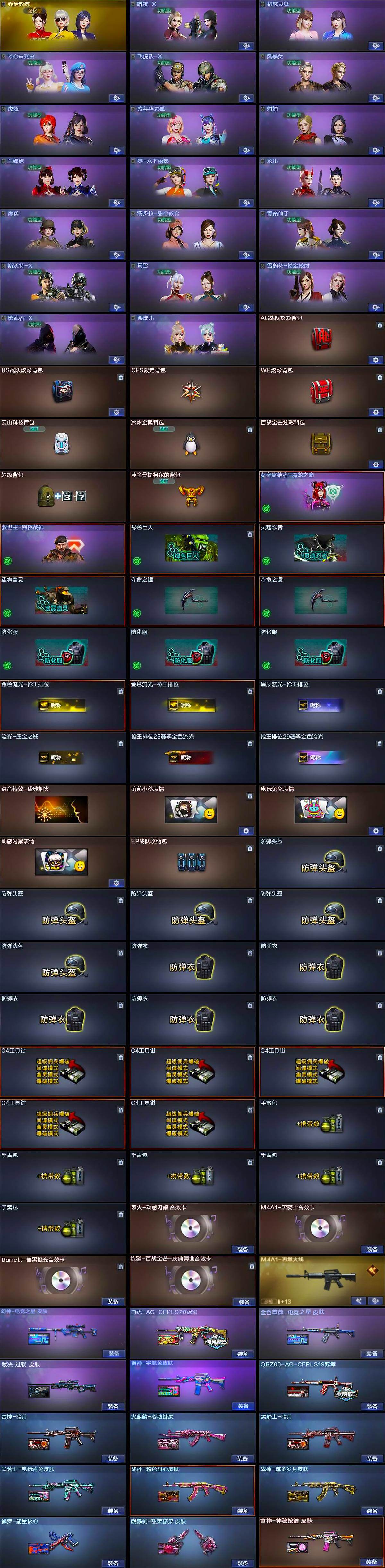 【道具】:AG战队炫彩背包,BS战队炫彩背包,CFS限定背包,WE炫彩背包,云山科技背包,冰冰企鹅背包,百战金芒炫彩背包,超级背包,黄金曼提柯尔的背包,女皇终结者-魔龙之吻,救世主-黑桃战神,