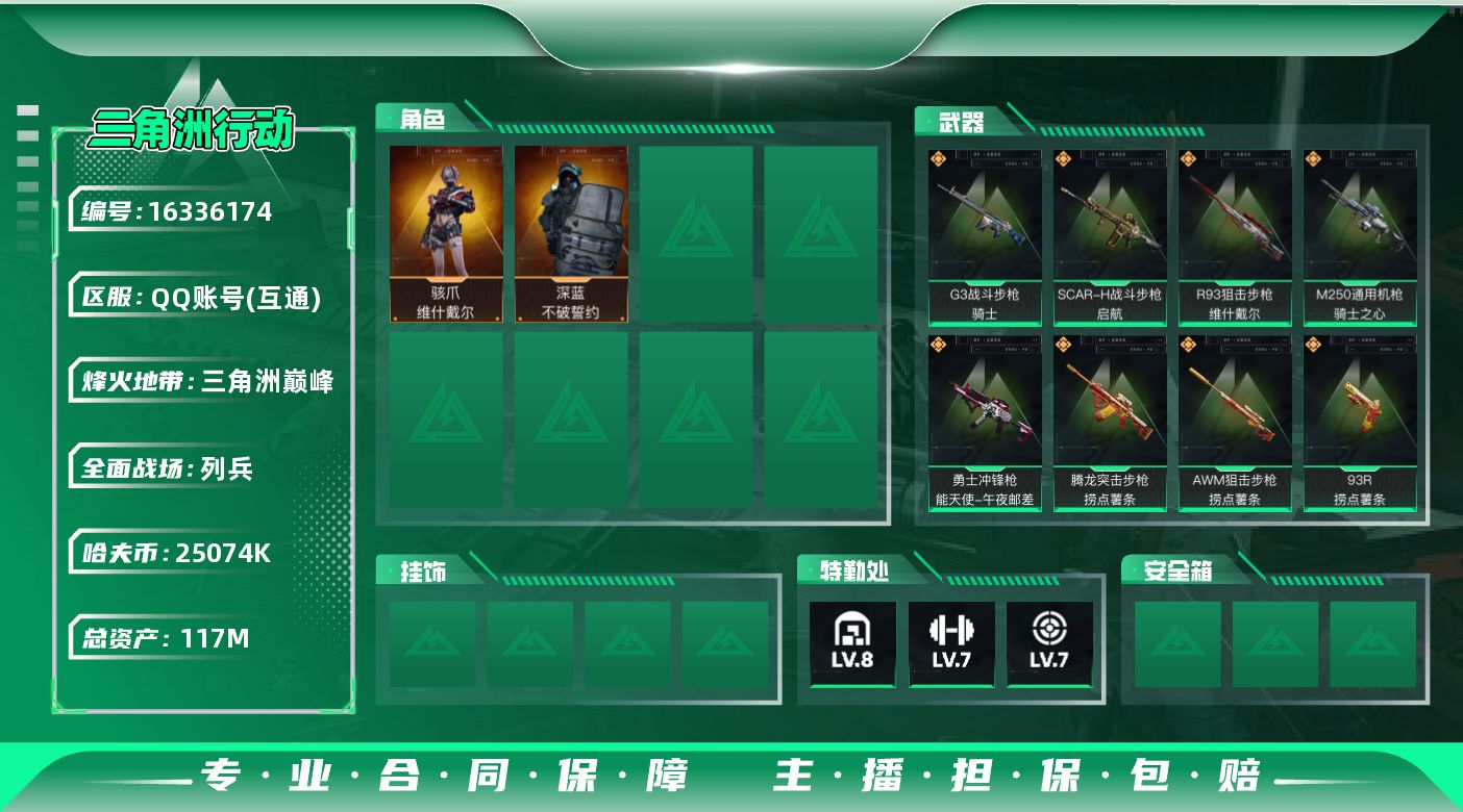 [16336174]【特价出售/店主推荐】117m总资产-25074k哈伏币-60烽火等级-三角洲巅峰-9战场等级-列兵 【干员外观】:骇爪-维什戴尔,深蓝-不破誓约 【近战皮肤】:近战-黑鹰 【传说外观】:M4A1突击步枪-阿米娅,SCAR-H战斗步枪-启航,G3战斗步枪-骑士,CAR-15突击步枪-阿米娅,腾龙突击步枪-捞点薯条,勇士冲锋枪-能天使-午夜邮差,M250通用机枪-骑士之心,R93狙击步枪-维什戴尔,AWM狙击步枪-捞点薯条,93R-捞点薯条 【史诗外观】:ASh-12战斗步枪-无极限,M16A4突击步枪-竞赛选手,腾龙突击步枪-猎鳄行动,K437突击步枪-守护者,MP5冲锋枪-战术竞备,MP5冲锋枪-竞技风,SR-3M紧凑突击步枪-战术竞备,勇士冲锋枪-工业狂潮,MP7冲锋枪-守护者,Mini-14射手步枪-守护者,SVD狙击步枪-阿萨拉工艺,M14射手步枪-工业狂潮,SV-98狙击步枪-林中猎手,AWM狙击步枪-无极限,复合弓-守护者 【稀有外观】:PTR-32突击步枪-花岗岩,AKM突击步枪-战术演练,AKM突击步枪-肃杀,QBZ95-1突击步枪-公平竞技,M7战斗步枪-捣蛋鬼,SCAR-H战斗步枪-荣耀列队,SCAR-H战斗步枪-黄昏,G3战斗步枪-战术演练,G3战斗步枪-主宰,K437突击步枪-生存指令,MK47突击步枪-精英联盟,MP5冲锋枪-弄臣,MP5冲锋枪-虎啸,MP5冲锋枪-哈夫克卫队,P90冲锋枪-黄昏,Vector冲锋枪-先锋,UZI冲锋枪-亚特兰蒂斯,SMG-45-行动开启,SMG-45冲锋枪-幻影结构,勇士冲锋枪-冰天雪地,MP7冲锋枪-钢铁之躯,M1014霰弹枪-幻影结构,S12K霰弹枪-战术演练,M250通用机枪-前沿科技,QJB201轻机枪-黄昏,QJB201轻机枪-哈夫克卫队,Mini-14射手步枪-荣耀列队,SKS射手步枪-弄臣,SR-25射手步枪-开拓,SR-9射手步枪-街头涂鸦,SV-98狙击步枪-星链科技,SV-98狙击步枪-哈夫克航天,SV-98狙击步枪-精英联盟,G18-星链科技,G18-哈夫克航天 【普通外观】:勇士冲锋枪-旧工业,M4A1突击步枪-粉色涂装,M4A1突击步枪-高雅黑,QBZ95-1突击步枪-高雅黑,QBZ95-1突击步枪-海浪,QBZ95-1突击步枪-三角洲力量,QBZ95-1突击步枪-海色,QBZ1
