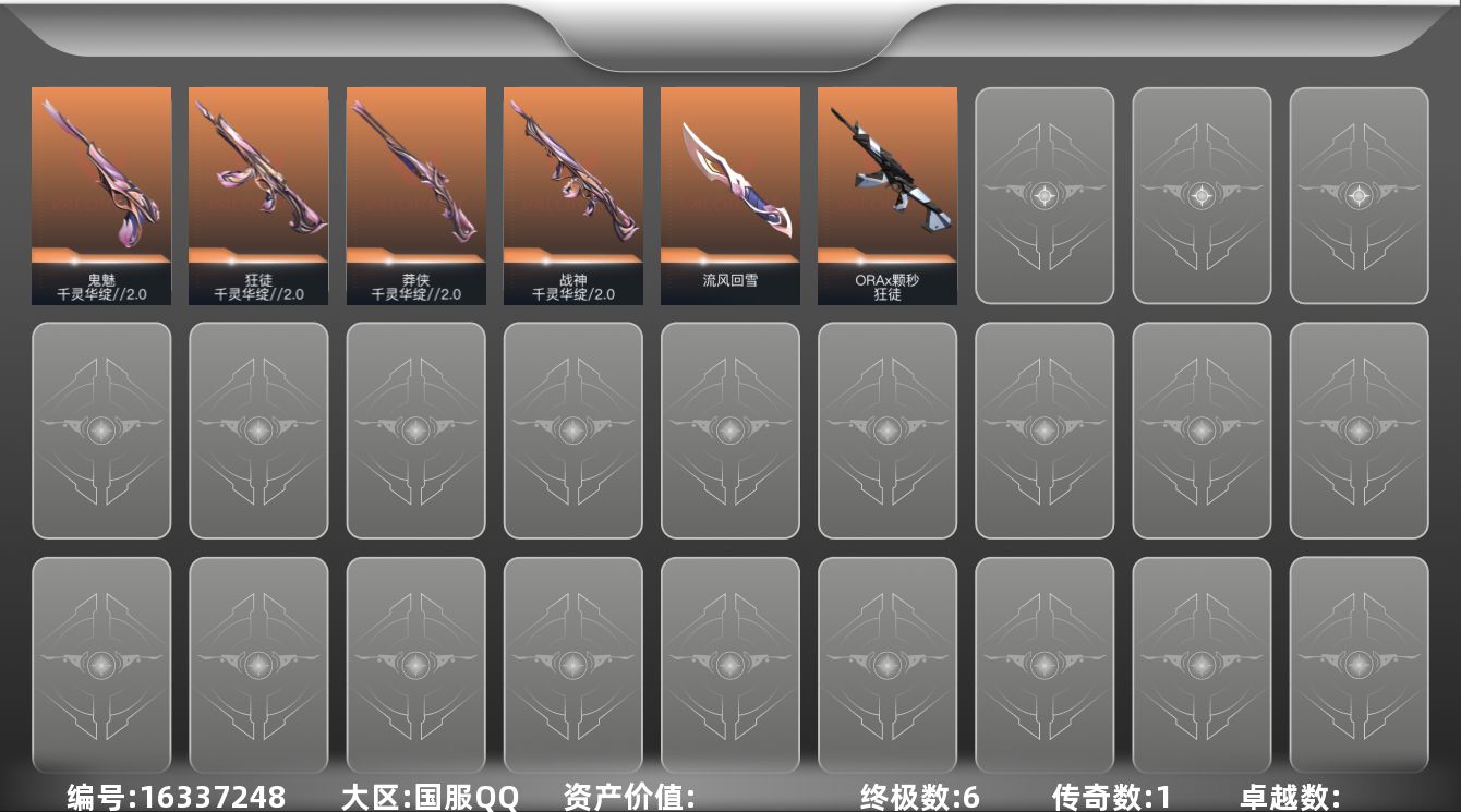 - [11687868]总资产:132.7M 3传说枪械 哈夫币:76.480K 进阶安全箱(9.17到期) 可二次 可修改实名 烽火地带段位:铂金 全面战场段位:无段位 传说武器皮肤:CAR-15突击步枪-阿米娅,复合弓-黑-天际线,勇士冲锋枪-能天使-午夜邮差 史诗武器皮肤:M16A4突击步枪-竞赛选手,AKM突击步枪-林中猎手,M1014霰弹枪-林中猎手,SV-98狙击步枪-林中猎手,SV-98狙击步枪-囚徒,SCAR-H战斗步枪-囚徒