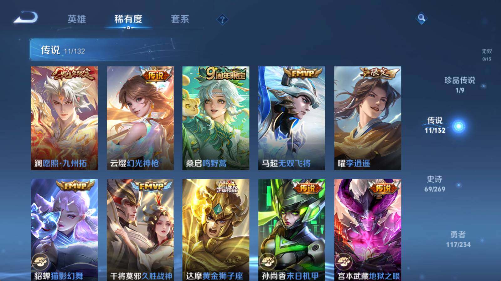 【传说皮肤】:澜愿照九州拓,云缨幻光神枪,桑启鸣野蒿,马超无双飞将,曜李逍遥 ,貂蝉猫影幻舞,干将莫邪久胜战神,达摩黄金狮子座,孙尚香末日机甲,宫本武藏地狱之眼,孙悟空地狱火