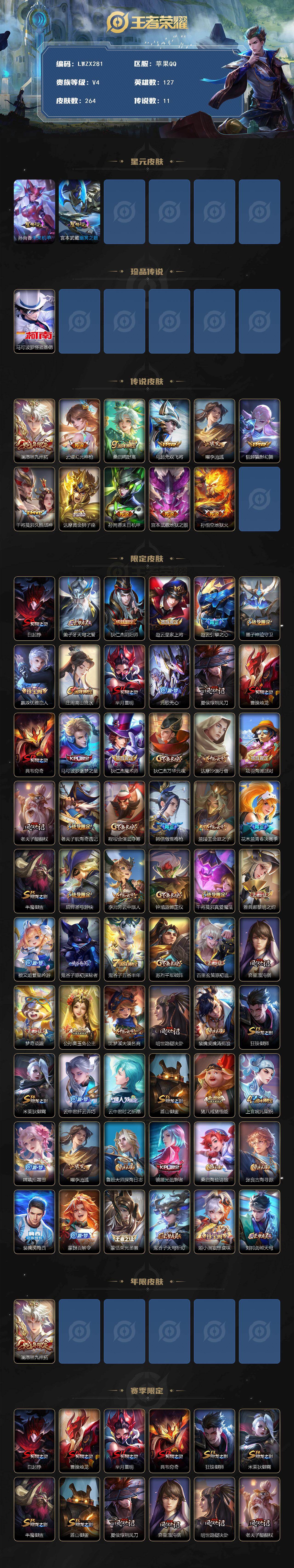 [16337318]可二次【特价出售/店主推荐】苹果Q-V4-最强王者段位-127英雄-264皮肤-1珍品传说-11传说-69史诗-2星元