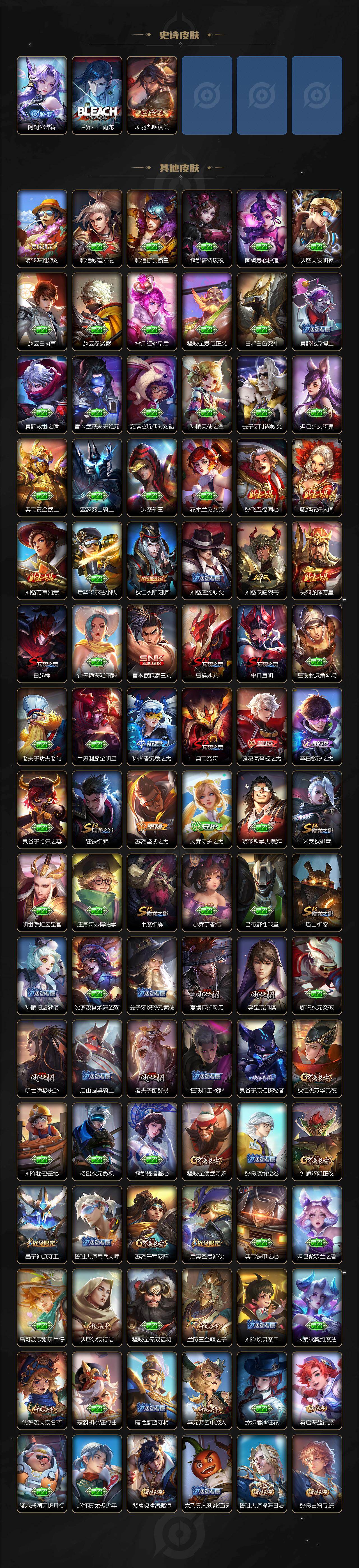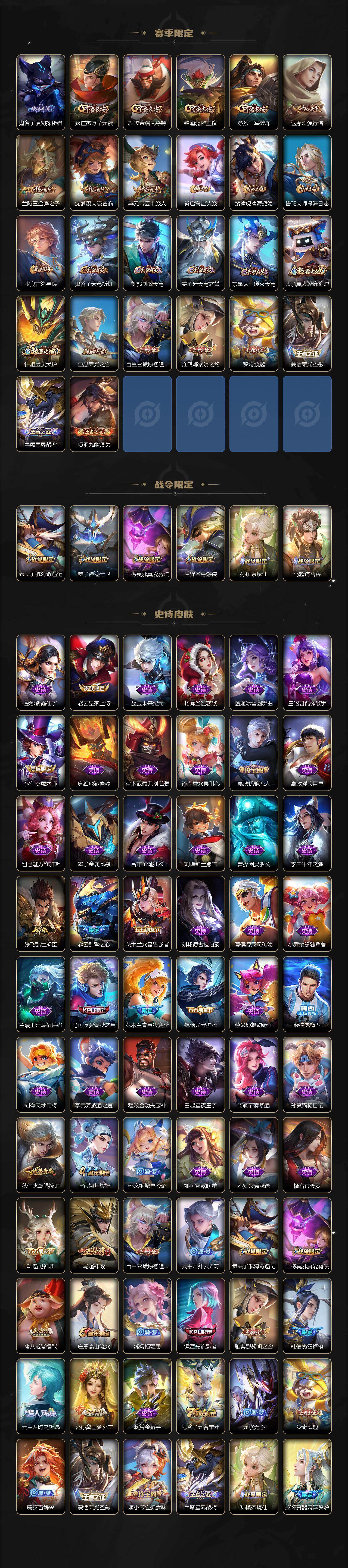 【赛季限定】:白起狰,曹操烛龙,芈月重明,典韦穷奇,狂铁御狮,米莱狄御霄,牛魔御旌,盾山御銮,夏侯惇朔风刀,弈星混沌棋,明世隐疑决卦,老夫子醍醐杖,鬼谷子原初探秘者,狄仁杰万华元夜,程咬金演武夺筹,钟馗驱傩正仪,苏烈千军破阵,达摩沙漠行僧,兰陵王金庭之子,沈梦溪大漠名商,李元芳云中旅人,桑启海盐诗旅,裴擒虎擒涛扼浪,鲁班大师探海日志,张良古海寻踪,鬼谷子天穹祈灯,刘邦剑破天穹,姜子牙天穹之誓,东皇太一噬灭天穹,太乙真人谧流熔炉,钟馗虚灵犬护,亚瑟荣光之誓,百里玄策原初追逐者,雅典娜黎明之约,梦奇顽趣,蒙恬荣光圣徽,牛魔星界战将,项羽九幽镇关