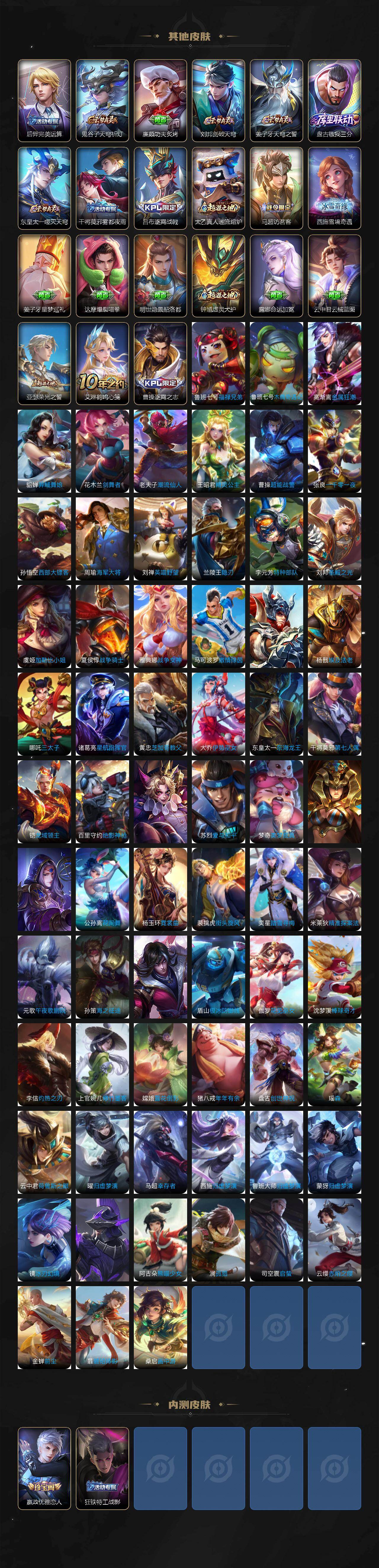 【限定皮肤】:白起狰,姜子牙天穹之誓,狄仁杰阴阳师,赵云皇家上将,赵云引擎之心,墨子神迹守卫,嬴政优雅恋人,庄周高山流水,芈月重明,元歌无心,夏侯惇朔风刀,曹操烛龙,典韦穷奇,马可波罗逐梦之星,狄仁杰魔术师,狄仁杰万华元夜,达摩沙漠行僧,项羽海滩派对,老夫子醍醐杖,老夫子航海奇遇记,程咬金演武夺筹,韩信傲雪梅枪,兰陵王金庭之子,花木兰青春决赛季,牛魔御旌,后羿圣弓游侠,李元芳云中旅人,钟馗驱傩正仪,干将莫邪真爱魔法,雅典娜黎明之约,蔡文姬繁星吟游,鬼谷子原初探秘者,鬼谷子五谷丰年,苏烈千军破阵,百里玄策原初追逐者,弈星混沌棋,梦奇顽趣,公孙离玉兔公主,沈梦溪大漠名商,明世隐疑决卦,裴擒虎擒涛扼浪,狂铁御狮,米莱狄御霄,云中君纤云弄巧,云中君时之祈愿,盾山御銮,猪八戒猪悟能,上官婉儿梁祝,嫦娥拒霜思,曜李逍遥 ,鲁班大师探海日志,镜匿光追影者,桑启海盐诗旅,张良古海寻踪,裴擒虎梅西,蒙犽百解令,蒙恬荣光圣徽,鬼谷子天穹祈灯,姬小满妄想食味,刘邦剑破天穹