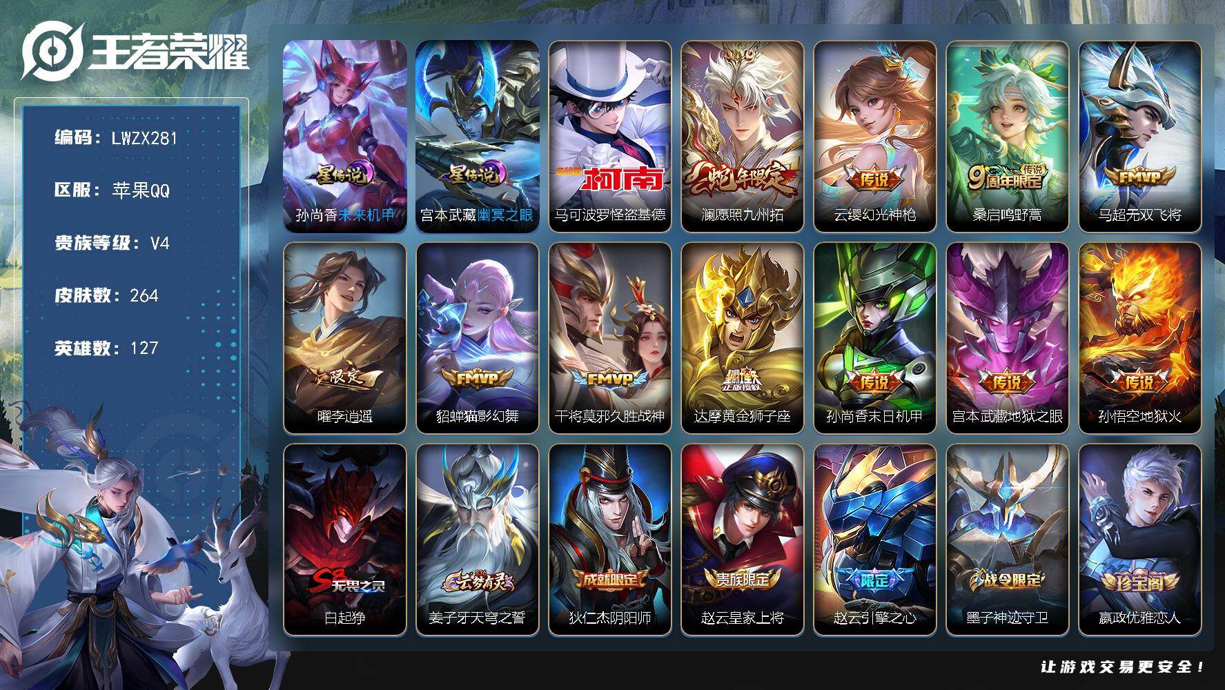 [16337318]可二次【特价出售/店主推荐】苹果Q-V4-最强王者段位-127英雄-264皮肤-1珍品传说-11传说-69史诗-2星元 【珍品传说】:马可波罗怪盗基德 【传说皮肤】:澜愿照九州拓,云缨幻光神枪,桑启鸣野蒿,马超无双飞将,曜李逍遥 ,貂蝉猫影幻舞,干将莫邪久胜战神,达摩黄金狮子座,孙尚香末日机甲,宫本武藏地狱之眼,孙悟空地狱火 【限定皮肤】:白起狰,姜子牙天穹之誓,狄仁杰阴阳师,赵云皇家上将,赵云引擎之心,墨子神迹守卫,嬴政优雅恋人,庄周高山流水,芈月重明,元歌无心,夏侯惇朔风刀,曹操烛龙,典韦穷奇,马可波罗逐梦之星,狄仁杰魔术师,狄仁杰万华元夜,达摩沙漠行僧,项羽海滩派对,老夫子醍醐杖,老夫子航海奇遇记,程咬金演武夺筹,韩信傲雪梅枪,兰陵王金庭之子,花木兰青春决赛季,牛魔御旌,后羿圣弓游侠,李元芳云中旅人,钟馗驱傩正仪,干将莫邪真爱魔法,雅典娜黎明之约,蔡文姬繁星吟游,鬼谷子原初探秘者,鬼谷子五谷丰年,苏烈千军破阵,百里玄策原初追逐者,弈星混沌棋,梦奇顽趣,公孙离玉兔公主,沈梦溪大漠名商,明世隐疑决卦,裴擒虎擒涛扼浪,狂铁御狮,米莱狄御霄,云中君纤云弄巧,云中君时之祈愿,盾山御銮,猪八戒猪悟能,上官婉儿梁祝,嫦娥拒霜思,曜李逍遥 ,鲁班大师探海日志,镜匿光追影者,桑启海盐诗旅,张良古海寻踪,裴擒虎梅西,蒙犽百解令,蒙恬荣光圣徽,鬼谷子天穹祈灯,姬小满妄想食味,刘邦剑破天穹 【年限皮肤】:澜愿照九州拓 【赛季限定】:白起狰,曹操烛龙,芈月重明,典韦穷奇,狂铁御狮,米莱狄御霄,牛魔御旌,盾山御銮,夏侯惇朔风刀,弈星混沌棋,明世隐疑决卦,老夫子醍醐杖,鬼谷子原初探秘者,狄仁杰万华元夜,程咬金演武夺筹,钟馗驱傩正仪,苏烈千军破阵,达摩沙漠行僧,兰陵王金庭之子,沈梦溪大漠名商,李元芳云中旅人,桑启海盐诗旅,裴擒虎擒涛扼浪,鲁班大师探海日志,张良古海寻踪,鬼谷子天穹祈灯,刘邦剑破天穹,姜子牙天穹之誓,东皇太一噬灭天穹,太乙真人谧流熔炉,钟馗虚灵犬护,亚瑟荣光之誓,百里玄策原初追逐者,雅典娜黎明之约,梦奇顽趣,蒙恬荣光圣徽,牛魔星界战将,项羽九幽镇关 【战令限定】:老夫子航海奇遇记,墨子神迹守卫,干将莫邪真爱魔法,后羿圣弓游侠,孙膑茶境仙,马超访茗客 【史诗皮肤】:露娜紫霞仙子,赵云皇家上将,赵云未来纪元,貂蝉圣诞恋歌,甄姬冰雪圆舞曲,王昭君偶像歌手,狄仁杰魔术师,廉颇地狱岩魂