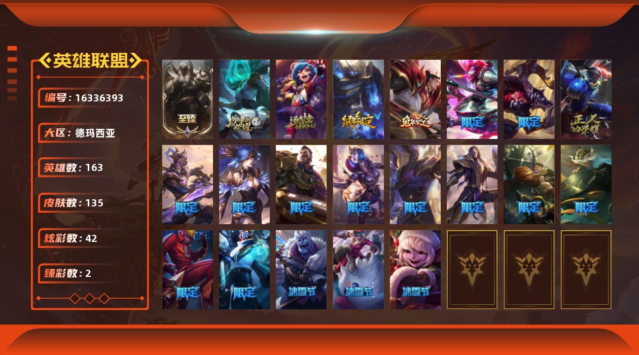 [16336393]【店主推荐捡漏号!可直接换绑】未定级段位-163英雄-135皮肤-42炫彩--3神话-24限定-14传说-27史诗