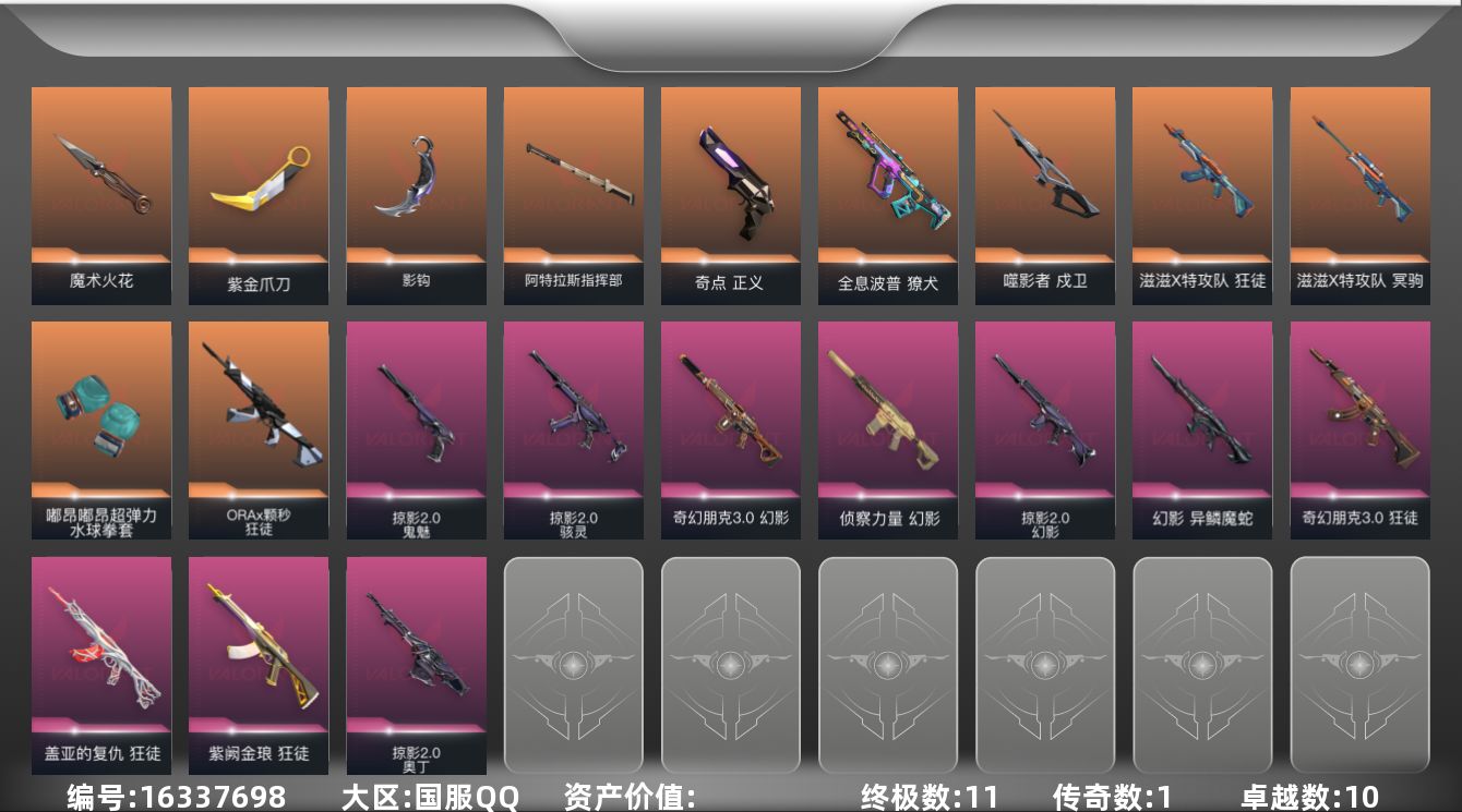 [16337698]【套装】:滋滋X特攻队套装,掠影//2.0套装 【英雄】:幻棱,炼狱,维斯,暮蝶,捷风,雷兹,幽影,不死鸟,贤者,猎枭,蝰蛇,零,芮娜,尚勃勒,霓虹,盖可 【近战武器】:近战武器-魔术火花,近战武器-嘟昂嘟昂超弹力水球拳套,近战武器-影钩,近战武器-紫金爪刀,近战武器-阿特拉斯指挥部 甩棍,近战武器-魔术火花 【狂徒】:狂徒-滋滋X特攻队,狂徒-ORA x 颗秒,狂徒-盖亚的复仇,狂徒-紫阙金琅,狂徒-奇幻朋克//3.0 【幻影】:幻影-侦察力量,幻影-异鳞魔蛇,幻影-掠影//2.0,幻影-奇幻朋克//3.0 【戍卫】:戍卫-噬影者 【獠犬】:獠犬-全息波普 【冥驹】:冥驹-滋滋X特攻队 【奥丁】:奥丁-掠影//2.0 【骇灵】:骇灵-掠影//2.0 【正义】:正义-奇点 【鬼魅】:鬼魅-掠影//2.0 【卡面】:无畏契约GO!第一卷:零 卡面,《双城之战》金克丝 卡面,代号红色 卡面,新兵报到 卡面,V契约 卡面,无畏契约 卡面 【喷漆】:霓光四射 喷漆,买装还是存钱 喷漆,关门放狗 喷漆,胜利属于无畏契约 喷漆,GLHF 喷漆,无畏契约 喷漆 【挂饰】:无畏契约GO!第一卷 零 挂饰,鱼骨头 挂饰,天外飞客 挂饰,无畏契约 纪念币 挂饰
