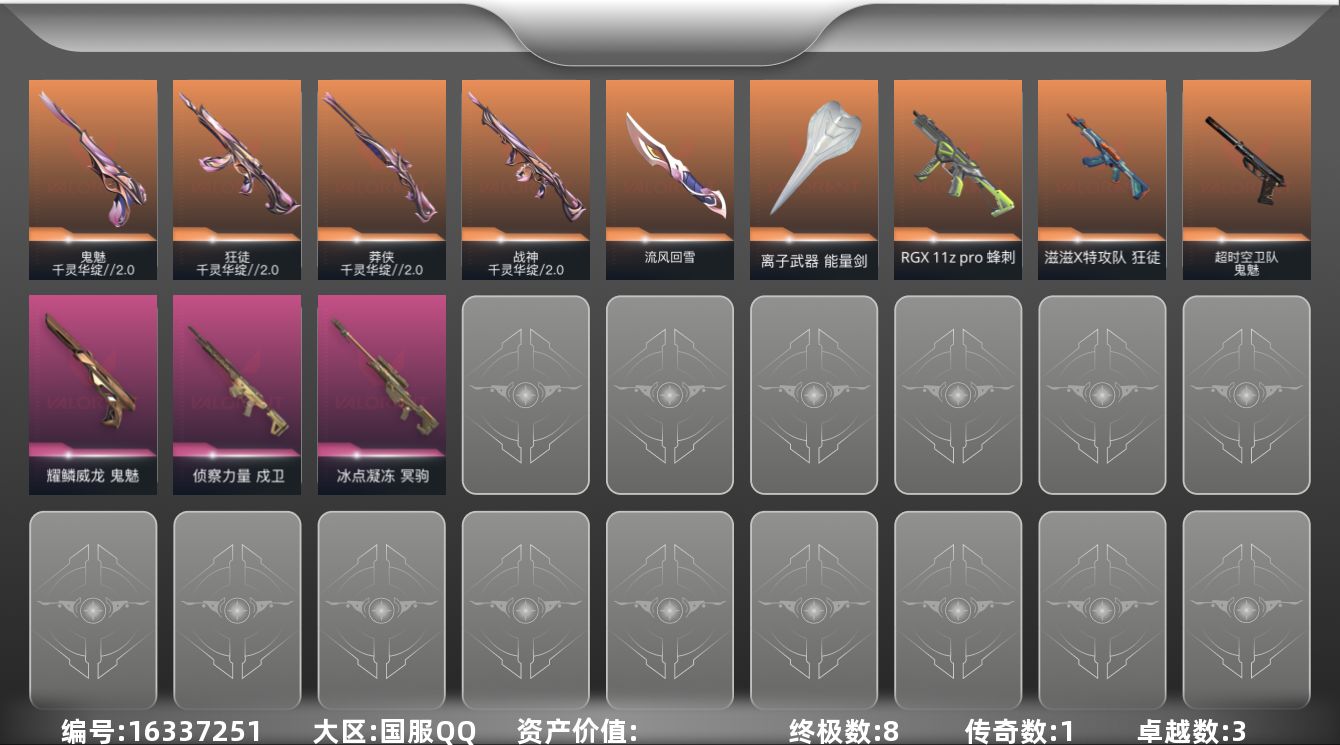 [16337251]【套装】:千灵华绽//2.0套装 【英雄】:炼狱,暮蝶,捷风,不死鸟,贤者,猎枭,芮娜 【近战武器】:近战武器-流风回雪,近战武器-离子武器 能量剑 【狂徒】:狂徒-滋滋X特攻队,狂徒-千灵华绽//2.0 【戍卫】:戍卫-侦察力量 【冥驹】:冥驹-冰点凝冻,冥驹-白日幻梦 【莽侠】:莽侠-千灵华绽//2.0 【战神】:战神-千灵华绽//2.0 【蜂刺】:蜂刺-RGX 11z Pro 【鬼魅】:鬼魅-超时空卫队,鬼魅-千灵华绽//2.0,鬼魅-耀鳞威龙 【卡面】:代号红色 卡面,新兵报到 卡面,V契约 卡面,无畏契约 卡面 【喷漆】:胜利属于无畏契约 喷漆,GLHF 喷漆,无畏契约 喷漆 【挂饰】:无畏契约 纪念币 挂饰