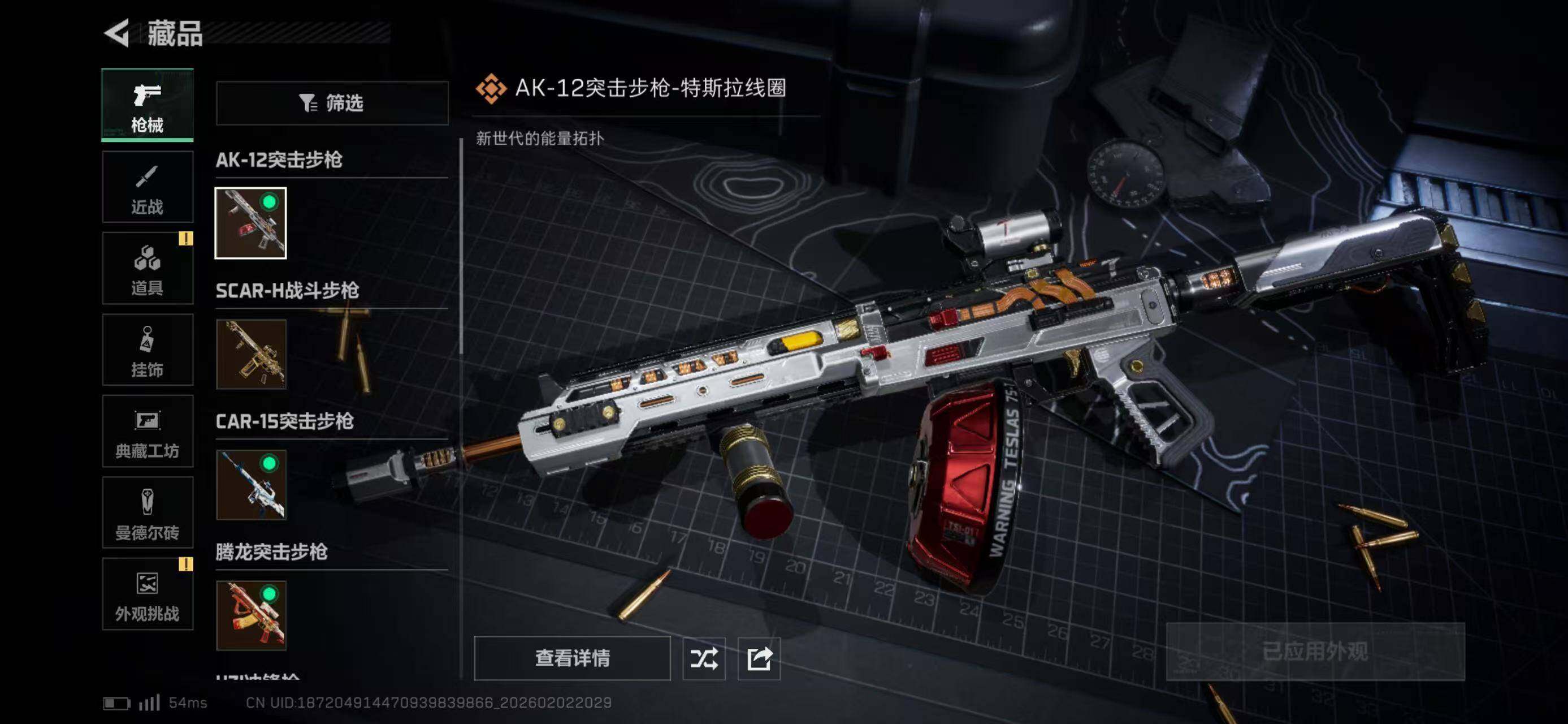 【传说外观】:AK-12突击步枪-特斯拉线圈,SCAR-H战斗步枪-启航,CAR-15突击步枪-阿米娅,腾龙突击步枪-捞点薯条,UZI冲锋枪-特斯拉线圈,SR-3M紧凑突击步枪-特斯拉线圈,勇士冲锋枪-能天使-午夜邮差,M250通用机枪-骑士之心,AWM狙击步枪-捞点薯条,93R-捞点薯条,复合弓-黑·天际线