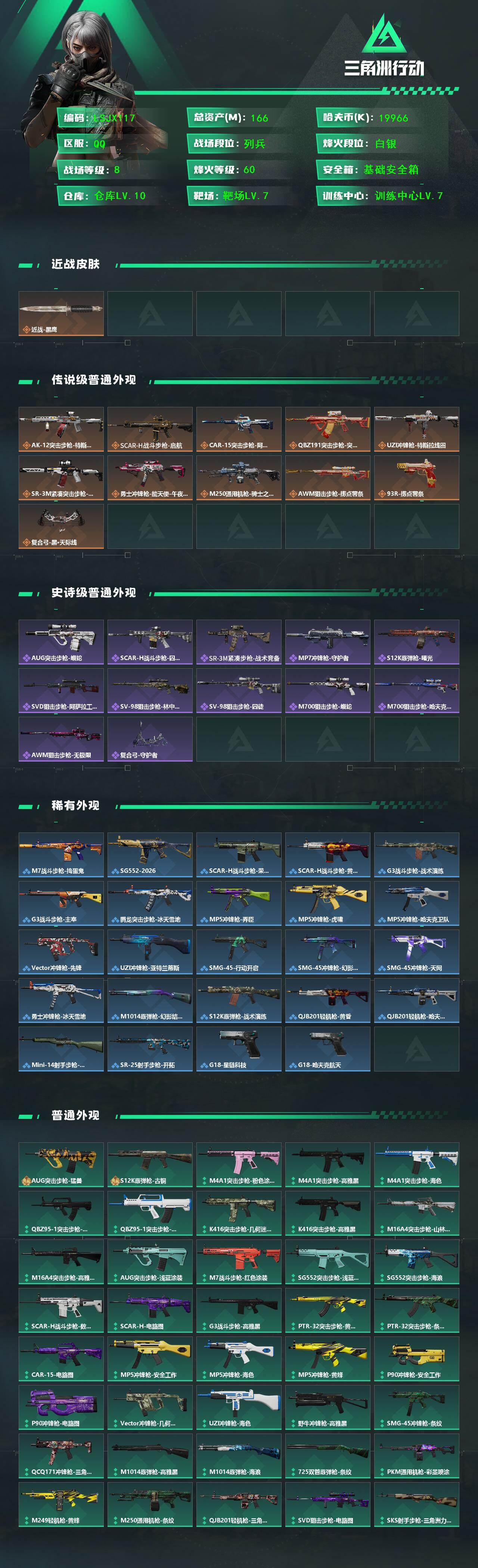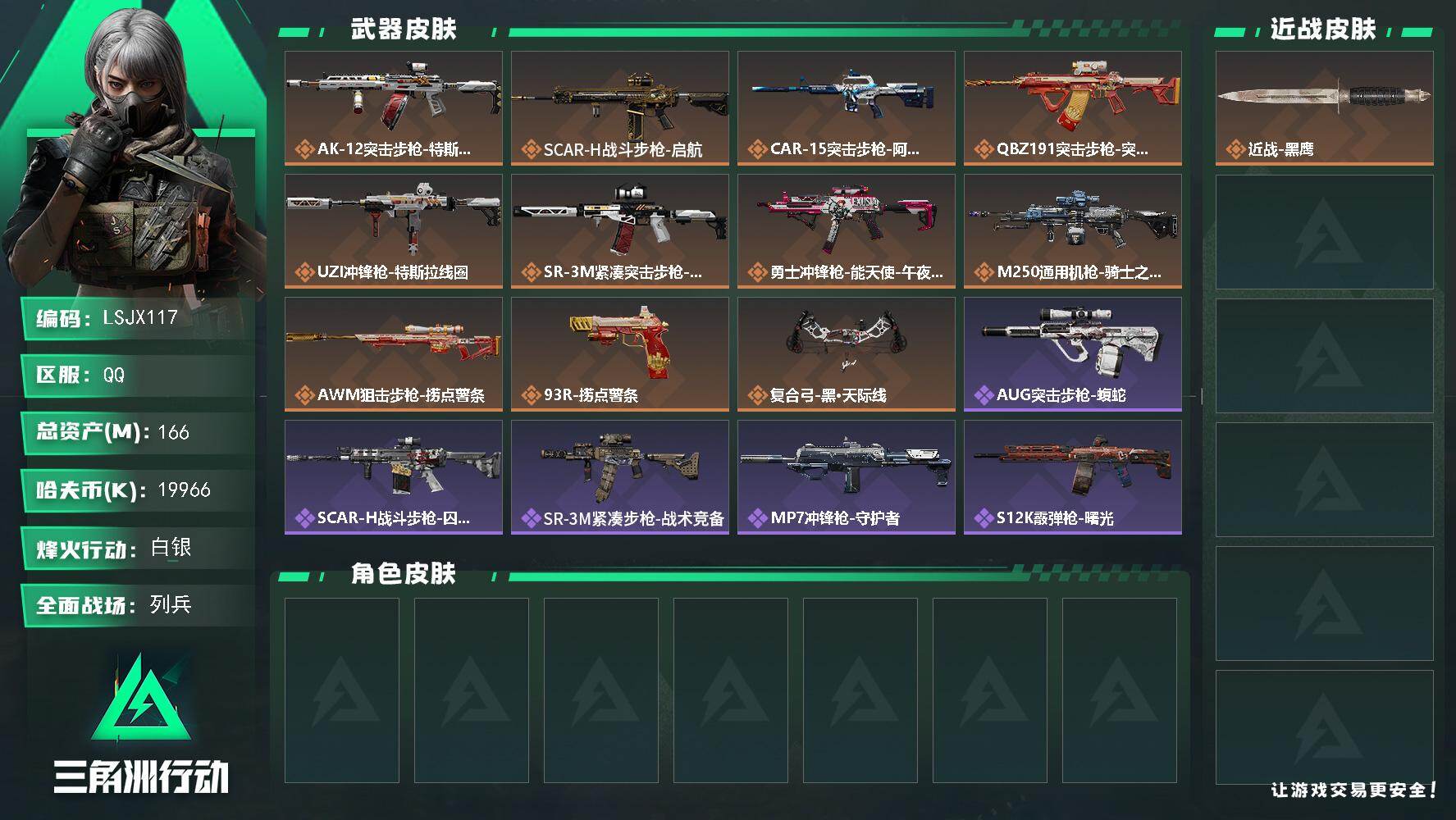 [16337321]【特价出售/店主推荐】166m总资产-19966k哈伏币-60烽火等级-白银-8战场等级-列兵 【近战皮肤】:近战-黑鹰 【传说外观】:AK-12突击步枪-特斯拉线圈,SCAR-H战斗步枪-启航,CAR-15突击步枪-阿米娅,腾龙突击步枪-捞点薯条,UZI冲锋枪-特斯拉线圈,SR-3M紧凑突击步枪-特斯拉线圈,勇士冲锋枪-能天使-午夜邮差,M250通用机枪-骑士之心,AWM狙击步枪-捞点薯条,93R-捞点薯条,复合弓-黑·天际线 【史诗外观】:AUG突击步枪-蝮蛇,SCAR-H战斗步枪-囚徒,SR-3M紧凑突击步枪-战术竞备,MP7冲锋枪-守护者,S12K霰弹枪-曙光,SVD狙击步枪-阿萨拉工艺,SV-98狙击步枪-林中猎手,SV-98狙击步枪-囚徒,M700狙击步枪-蝮蛇,M700狙击步枪-哈夫克警备,AWM狙击步枪-无极限,复合弓-守护者 【稀有外观】:M7战斗步枪-捣蛋鬼,SG552突击步枪-2026,SCAR-H战斗步枪-荣耀列队,SCAR-H战斗步枪-黄昏,G3战斗步枪-战术演练,G3战斗步枪-主宰,腾龙突击步枪-冰天雪地,MP5冲锋枪-弄臣,MP5冲锋枪-虎啸,MP5冲锋枪-哈夫克卫队,Vector冲锋枪-先锋,UZI冲锋枪-亚特兰蒂斯,SMG-45-行动开启,SMG-45冲锋枪-幻影结构,SMG-45冲锋枪-天网,勇士冲锋枪-冰天雪地,M1014霰弹枪-幻影结构,S12K霰弹枪-战术演练,QJB201轻机枪-黄昏,QJB201轻机枪-哈夫克卫队,Mini-14射手步枪-荣耀列队,SR-25射手步枪-开拓,G18-星链科技,G18-哈夫克航天 【普通外观】:AUG突击步枪-猛兽,S12K霰弹枪-古铜,M4A1突击步枪-粉色涂装,M4A1突击步枪-高雅黑,M4A1突击步枪-海色,QBZ95-1突击步枪-高雅黑,QBZ95-1突击步枪-海色,QBZ95-1突击步枪-2026,K416突击步枪-几何迷彩,K416突击步枪-高雅黑,M16A4突击步枪-山林猎人,M16A4突击步枪-高雅黑,AUG突击步枪-浅蓝涂装,M7战斗步枪-红色涂装,SG552突击步枪-浅蓝涂装,SG552突击步枪-海浪,SCAR-H战斗步枪-数码迷彩,SCAR-H战斗步枪-电路图,G3战斗步枪-高雅黑,PTR-32突击步枪-黄蜂,PTR-32突击步枪-条纹,CAR-15突击步枪-电路图,
