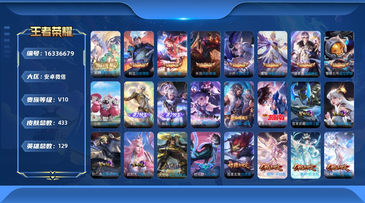 [16336679]安卓WX,hellokitty小兵!2天幕!-V10-最强王者段位-129英雄-433皮肤-7典藏皮肤-1典藏英雄-1珍品无双-2无双-3珍品传说-64传说-122史诗-4星传说! 【英雄全皮】:司马懿全皮,姜子牙全皮,孙权全皮,朵莉亚全皮,米莱狄全皮,桑启全皮,莱西奥全皮,空空儿全皮,影全皮,少司缘全皮 【荣耀典藏】:武则天英雄,小乔天鹅之梦,鲁班七号星空梦想,诸葛亮星域神启,关羽赤影疾锋,韩信弑枪猎影,虞姬神鉴启示录,瑶拾光映像 【珍品无双】:貂蝉馥梦繁花 【无双皮肤】:李白碎月剑心,韩信群星魔术团 【珍品传说】:鲁班七号江户川柯南,张飞兔狲蓬尾,安琪拉酷洛米之心 【传说皮肤】:杨戬纵目迁山,后羿神树通天,大司命死亡执政官,司马懿九山相柳,女娲愿照千秋盛,妲己愿照众生和,蔡文姬愿照福禄聚,虞姬愿照岁时盈,云缨幻光神枪,嬴政玄雷天君,王昭君映山客,桑启鸣野蒿,夏侯惇霜北刀,铠冥王哈迪斯,朵莉亚心动手记,墨子黄金天蝎座,海月金乌负日,亚连落雪白狼,吕布曦玄引,典韦战鼓燎原,孙尚香乘龙问璇玑,孙策乘龙淬吴钩,赵云乘龙铭钟鼎,澜逐花归海,艾琳觅芳踪,露娜霜月吟,孙膑小动物乐团,鲁班七号时之奇旅,宫本武藏惊梅引,马可波罗妄想实况,干将莫邪画中仙,伽罗炽翼辉光,李信山海炽霜斩,吕布怒海麟威,李白诗剑行,王昭君星穹之声,娜可露露前尘镜,马可波罗深海之息,马超无双飞将,大乔挚爱花嫁,孙策挚爱之约,蔡文姬花朝如约,孙策末日机甲,裴擒虎寅虎赤拳,赵云淬星耀世,王昭君乞巧织情,西施游龙清影,周瑜音你心动,小乔音你心动,李元芳飞鸢探春,铠绛天战甲,镜炽阳神光,虞姬启明星使,关羽武圣,曜云鹰飞将,张良黄金白羊座,达摩黄金狮子座,百里玄策白虎志,后羿黄金射手座,貂蝉仲夏夜之梦,宫本武藏地狱之眼,吕布天魔缭乱,武则天海洋之心,狄仁杰超时空战士 【限定皮肤】:白起狰,夏侯惇霜北刀,铠冥王哈迪斯,蒙犽顽岩魄,蔡文姬夏日便利店,大乔绒语心约,虞姬夏日便利店,姜子牙天穹之誓,狄仁杰阴阳师,廉颇寅虎御盾,赵云皇家上将,赵云龙胆,妲己时之奇旅,嬴政优雅恋人,鲁班七号时之奇旅,庄周高山流水,高渐离玩趣恶龙,吕布天魔缭乱,吕布御风骁将,夏侯惇朔风刀,甄姬落雪兰心,典韦岱宗,马可波罗暗影游猎,马可波罗深海之息,马可波罗山海玄木吟,马可波罗妄想实况,狄仁杰魔术师,达摩沙漠行僧,项羽海滩派对,老夫子醍醐杖,关羽