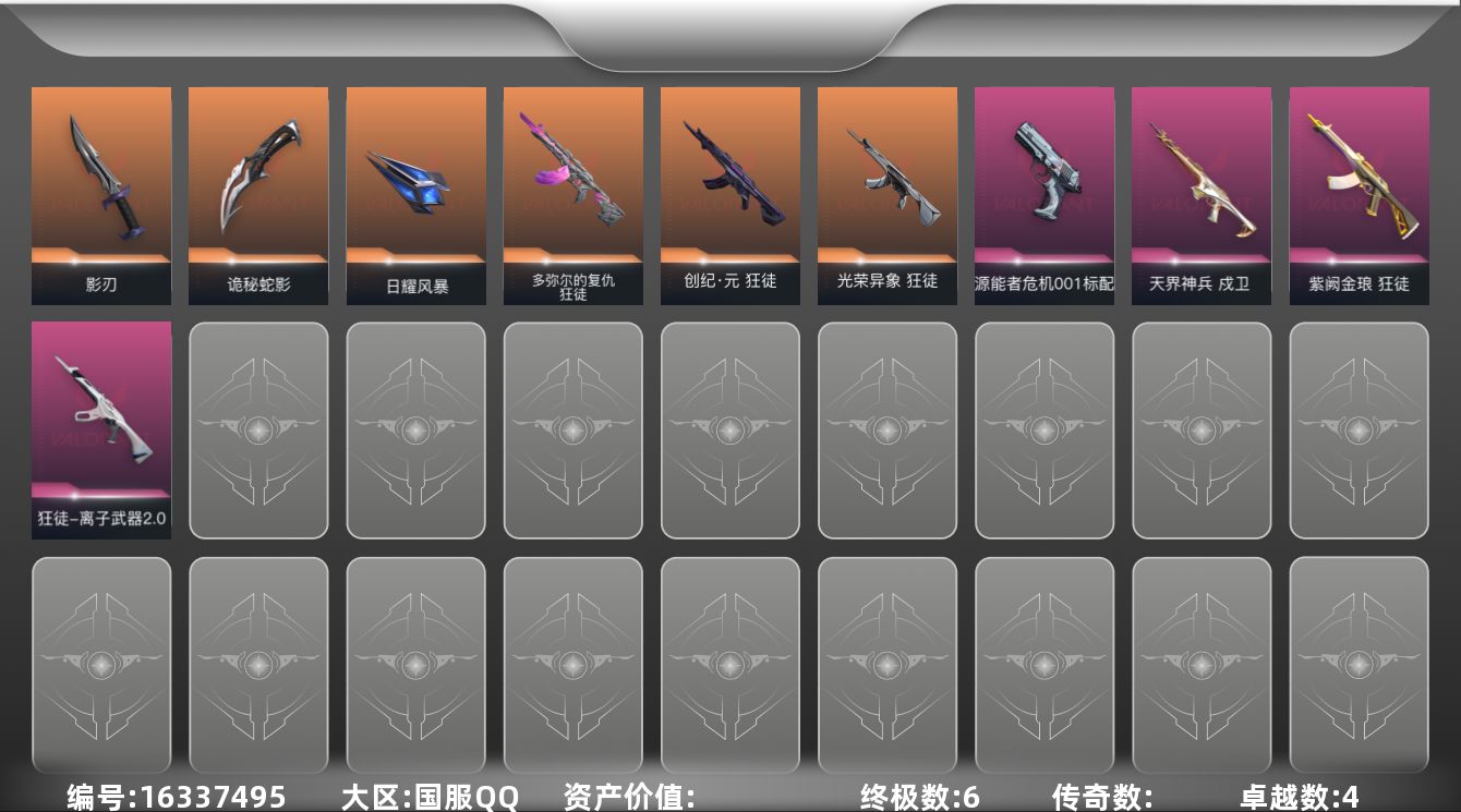 [16337495]【英雄】:幻棱,炼狱,维斯,暮蝶,钛狐,壹决,铁臂,捷风,雷兹,幽影,不死鸟,贤者,猎枭,蝰蛇,零,芮娜,奇乐,霓虹,斯凯,夜露,K/O,盖可,钢锁 【近战武器】:近战武器-影刃,近战武器-诡秘蛇影 军刀,近战武器-日耀风暴 遗器 【狂徒】:狂徒-创·纪元,狂徒-光荣异象,狂徒-多弥尔的复仇,狂徒-紫阙金琅,狂徒-离子武器//2.0,狂徒-诡秘蛇影 【幻影】:幻影-末日之翼 【戍卫】:戍卫-天界神兵,戍卫-折光棱晶 【飞将】:飞将-末日之翼 【莽侠】:莽侠-诡秘蛇影 【奥丁】:奥丁-末日之翼 【判官】:判官-诡秘蛇影 【蜂刺】:蜂刺-折光棱晶 【标配】:标配-源能者危机001,标配-折光棱晶 【正义】:正义-复古浪潮 【鬼魅】:鬼魅-诡秘蛇影 【短炮】:短炮-末日之翼 【卡面】:南瓜盛典 卡面,正义的化身 卡面,时间到 卡面,最高舞台 卡面,梦幻奶茶 卡面,零点嗅探设计图 卡面,表象之下 卡面,沙雕爆能器 卡面,无畏契约GO!第一卷:芮娜 卡面,清除名单 卡面,无畏契约GO!第一卷:零 卡面,暗枪 卡面,钢锁vs盖可 卡面,铁臂设计图 卡面,代号红色 卡面,新兵报到 卡面,V契约 卡面,无畏契约 卡面 【喷漆】:熊抱 喷漆,超级粉丝 喷漆,捷风差距 喷漆,我的刀呢? 喷漆,UWU 喷漆,新潮流 喷漆,双击点赞 喷漆,买装还是存钱 喷漆,胜利属于无畏契约 喷漆,GLHF 喷漆,无畏契约 喷漆 【挂饰】:V25第六幕:超凡 挂饰,V25第三幕:超凡 挂饰,第九季//第三幕 纪念币 挂饰,第九季//第二幕 纪念币 挂饰,袖珍捷风 挂饰,第九季//第一幕 纪念币 挂饰,第八季//第三幕 纪念币 挂饰,终章:扭结饼干 挂饰 ,瓶中信 挂饰,传世莲华 挂饰,第八季//第二幕 纪念币 挂饰 ,天外飞客 挂饰,无畏契约 纪念币 挂饰