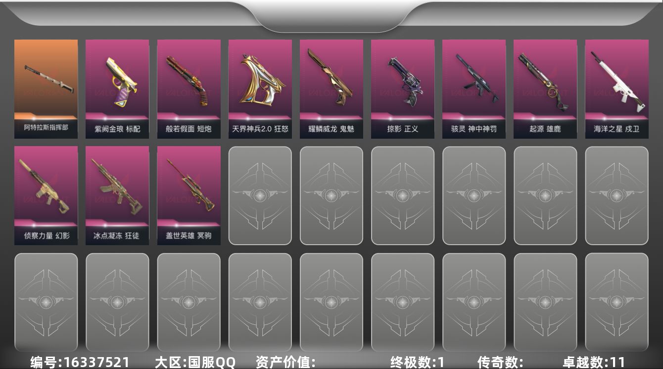 [16337521]【英雄】:幻棱,炼狱,维斯,暮蝶,钛狐,壹决,铁臂,捷风,幽影,不死鸟,贤者,猎枭,零,芮娜,奇乐,尚勃勒,霓虹,夜露,星礈,K/O,盖可,黑梦,钢锁 【近战武器】:近战武器-阿特拉斯指挥部 甩棍 【狂徒】:狂徒-冰点凝冻 【幻影】:幻影-侦察力量 【戍卫】:戍卫-海洋之星 【冥驹】:冥驹-盖世英雄 【雄鹿】:雄鹿-起源 【骇灵】:骇灵-神中神罚 【标配】:标配-紫阙金琅 【正义】:正义-掠影 【鬼魅】:鬼魅-耀鳞威龙 【狂怒】:狂怒-天界神兵//2.0 【短炮】:短炮-般若假面 【卡面】:Clutch 卡面,无畏契约GO!第一卷:零 卡面,无垠星环 卡面,钢锁vs盖可 卡面,代号红色 卡面,新兵报到 卡面,V契约 卡面,无畏契约 卡面 【喷漆】:买装还是存钱 喷漆,暴走萝莉 喷漆,胜利属于无畏契约 喷漆,GLHF 喷漆,无畏契约 喷漆 【挂饰】:天外飞客 挂饰,无畏契约 纪念币 挂饰