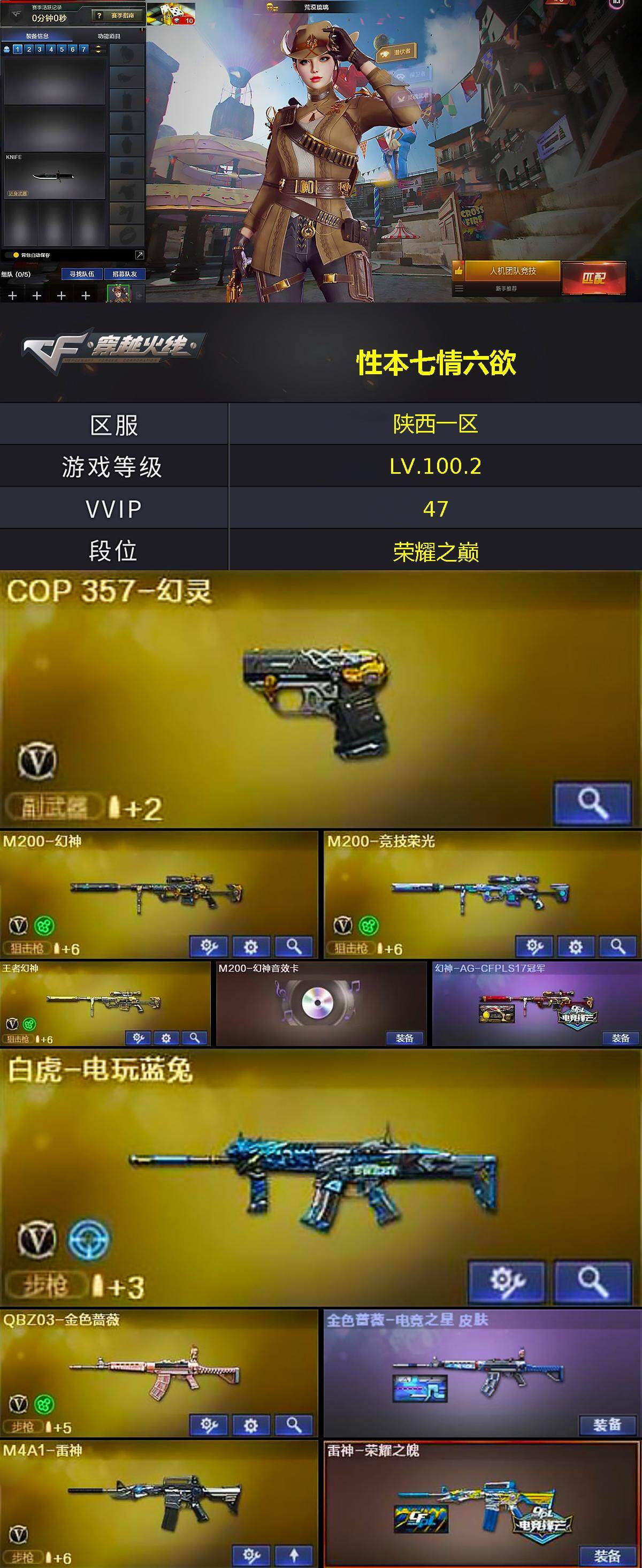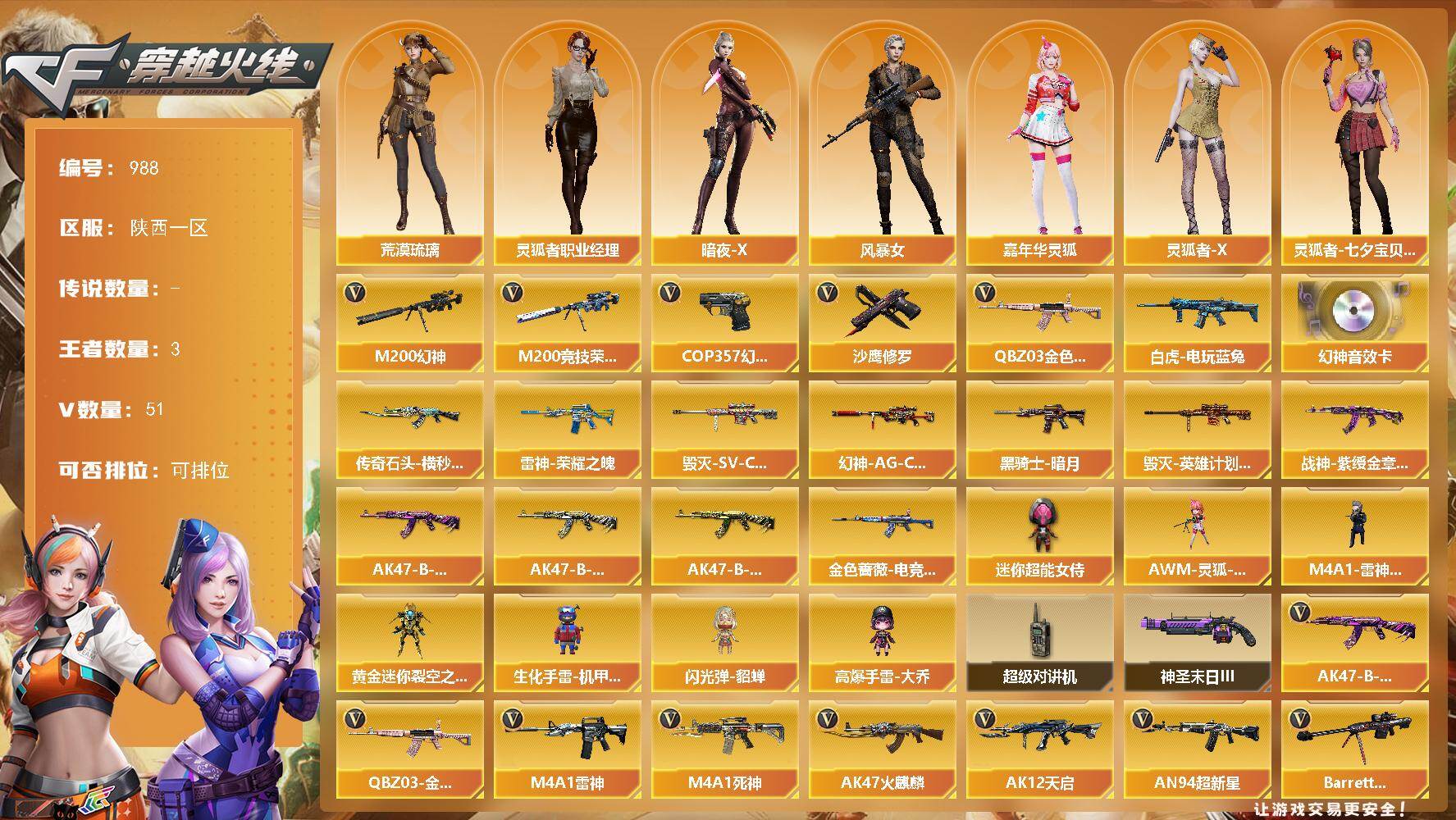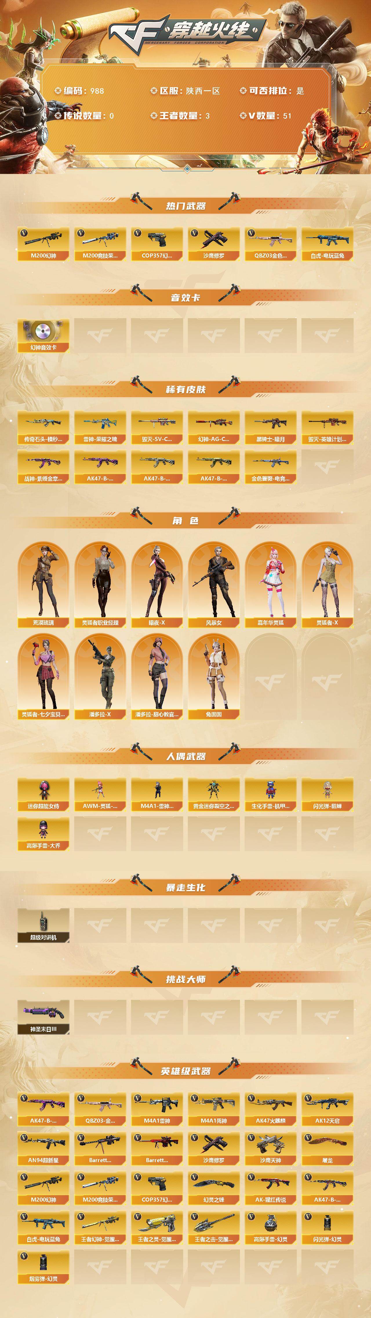 [16337516]陕西一区-51V-3王者-0炫金 【热门武器】:QBZ03-金色蔷薇,M200-幻神,M200-竞技荣光,白虎-电玩蓝兔,COP 357-幻灵,沙鹰-修罗 【音效卡】:M200-幻神音效卡 【皮肤】:幻神-AG-CFPLS17冠军,金色蔷薇-电竞之星 皮肤,雷神-荣耀之魄,传奇石头-横秒之巅,毁灭-SV-CFPLS16冠军,毁灭-英雄计划 皮肤,黑骑士-暗月,战神-紫绶金章皮肤,AK47-B-常胜将军-曹操,AK47-B-常胜将军-刘备,AK47-B-常胜将军-孙权 【角色】:荒漠琉璃,暗夜-X,风暴女,嘉年华灵狐,灵狐者-X,灵狐者-七夕宝贝,灵狐者-职业经理,潘多拉-X,潘多拉-甜心教官,兔囡囡 【人偶武器】:M4A1-雷神-精英刀锋,AWM-灵狐-15周年嘉年华,黄金迷你裂空之翼,生化手雷-机甲核心*2,闪光弹-貂蝉,高爆手雷-大乔,迷你超能女侍 【暴走生化】:超级对讲机 【挑战大师】:神圣爆裂者-末日III 【英雄级武器】:AK47-火麒麟,M4A1-雷神,M4A1-死神,AK12-天启,AN94-超新星,QBZ03-金色蔷薇,AK-47-猩红传说*2,AK47-B-战神,AK47-B-常胜将军,白虎-电玩蓝兔,Barrett-毁灭,Barrett-极光,M200-幻神,M200-竞技荣光,王者幻神-觉醒版,沙鹰-修罗,沙鹰-天神*3,COP 357-幻灵,王者之灵-觉醒版,屠龙,幻灵之锋*2,王者之击-觉醒版,高爆手雷-幻灵*5,闪光弹-幻灵*5,烟雾弹-幻灵*5 【道具】:CFS限定背包,云山科技背包,炫彩背包,超级背包,女皇终结者-魔龙之吻,绿色巨人,灵魂忍者,迷雾幽灵,夺命之镰*2,防化服*4,金色流光-枪王排位*2,星辰流光-枪王排位,枪王排位28赛季金色流光,枪王排位29赛季金色流光,电玩兔兔表情,EP战队名片,EP战队喷图,EP战队击杀图标,防弹头盔*3,防弹衣*3,C4工具钳*3,手雷包*3 【特殊枪械】: