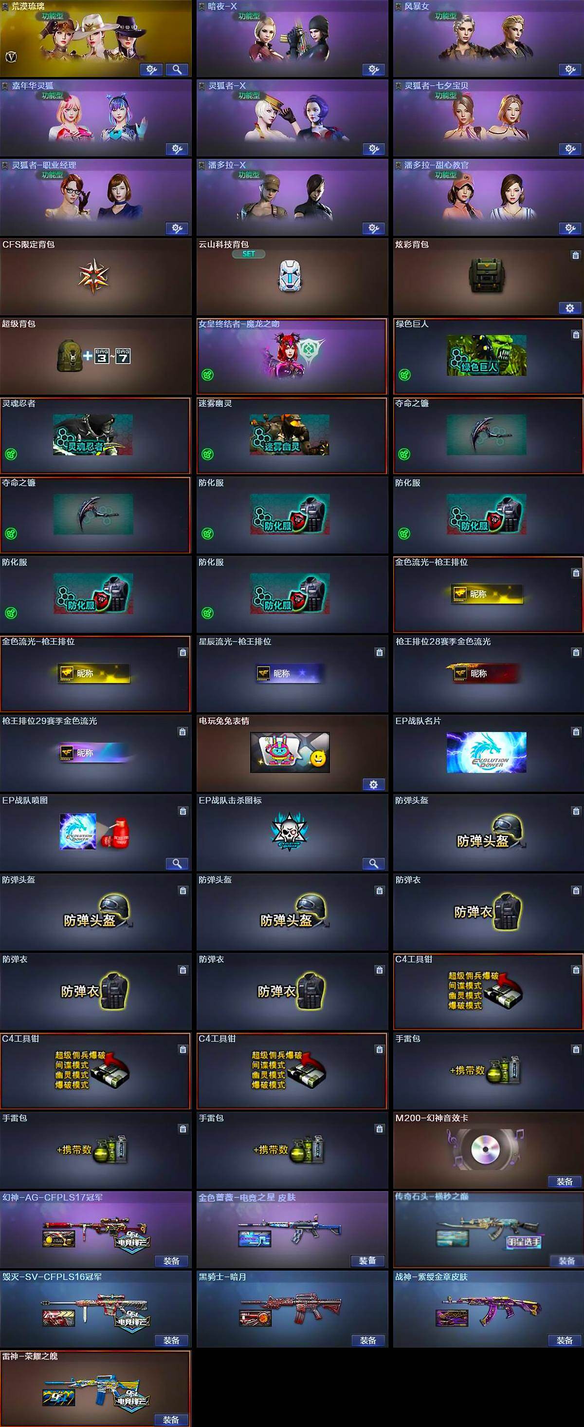 【道具】:CFS限定背包,云山科技背包,炫彩背包,超级背包,女皇终结者-魔龙之吻,绿色巨人,灵魂忍者,迷雾幽灵,夺命之镰*2,防化服*4,金色流光-枪王排位*2,星辰流光-枪王排位,枪王排位28赛季金色流光,枪王排位29赛季金色流光,电玩兔兔表情,EP战队名片,EP战队喷图,EP战队击杀图标,防弹头盔*3,防弹衣*3,C4工具钳*3,手雷包*3