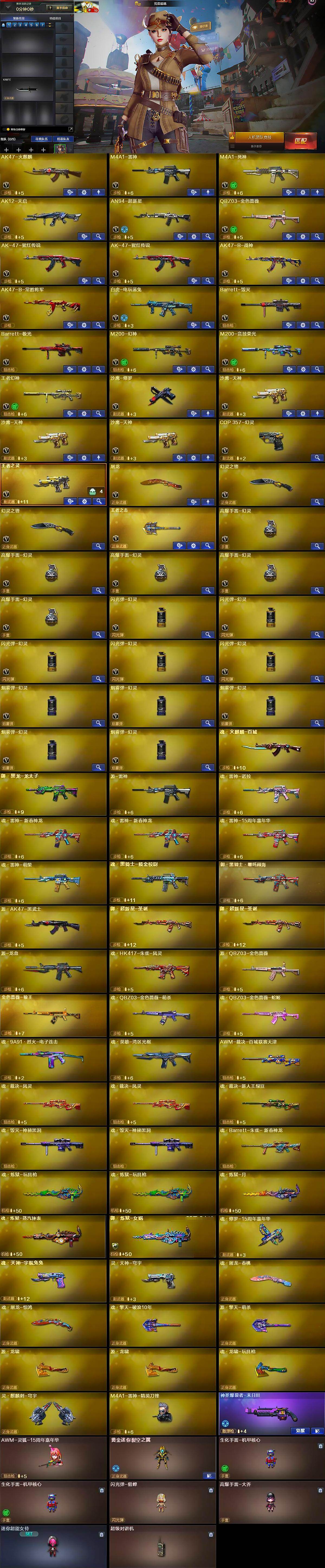 【英雄级武器】:AK47-火麒麟,M4A1-雷神,M4A1-死神,AK12-天启,AN94-超新星,QBZ03-金色蔷薇,AK-47-猩红传说*2,AK47-B-战神,AK47-B-常胜将军,白虎-电玩蓝兔,Barrett-毁灭,Barrett-极光,M200-幻神,M200-竞技荣光,王者幻神-觉醒版,沙鹰-修罗,沙鹰-天神*3,COP 357-幻灵,王者之灵-觉醒版,屠龙,幻灵之锋*2,王者之击-觉醒版,高爆手雷-幻灵*5,闪光弹-幻灵*5,烟雾弹-幻灵*5