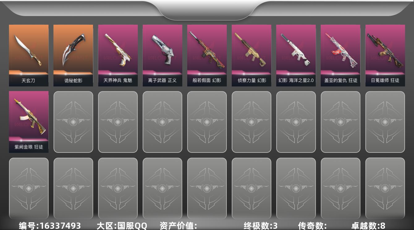 [16337493]【套装】:无畏契约季前邀请赛套装 【英雄】:幻棱,炼狱,维斯,暮蝶,钛狐,壹决,铁臂,捷风,雷兹,幽影,不死鸟,贤者,猎枭,蝰蛇,零,芮娜,奇乐,尚勃勒,霓虹,斯凯,夜露,星礈,K/O,海神,盖可,黑梦,钢锁 【近战武器】:近战武器-无畏契约季前邀请赛 悲悯之刃,近战武器-天玄刀,近战武器-诡秘蛇影 军刀 【狂徒】:狂徒-盖亚的复仇,狂徒-日冕雄师,狂徒-紫阙金琅,狂徒-诡秘蛇影 【幻影】:幻影-般若假面,幻影-侦察力量,幻影-海洋之星//2.0,幻影-末日之翼 【戍卫】:戍卫-折光棱晶 【飞将】:飞将-末日之翼 【莽侠】:莽侠-诡秘蛇影 【奥丁】:奥丁-末日之翼 【判官】:判官-诡秘蛇影 【蜂刺】:蜂刺-折光棱晶 【标配】:标配-折光棱晶 【正义】:正义-离子武器 【鬼魅】:鬼魅-天界神兵,鬼魅-诡秘蛇影,鬼魅-星云暗涌 【短炮】:短炮-末日之翼 【卡面】:《双城之战》拥抱 卡面,精灵大战 卡面,欢迎来到底城 卡面,南瓜盛典 卡面,无畏契约:暮蝶 卡面,霓帧牛蛙 卡面,梦幻奶茶 卡面,暗枪 卡面,代号红色 卡面,新兵报到 卡面,V契约 卡面,无畏契约 卡面 【喷漆】:嗨宝南瓜灯 喷漆,嘭! 喷漆,都算到了 喷漆,控场勿近 喷漆,伤心心 喷漆,捷风差距 喷漆,胜利属于无畏契约 喷漆,GLHF 喷漆,无畏契约 喷漆 【挂饰】:伞绳 挂饰,第九季//第三幕 纪念币 挂饰,第九季//第一幕 纪念币 挂饰,无畏契约 纪念币 挂饰