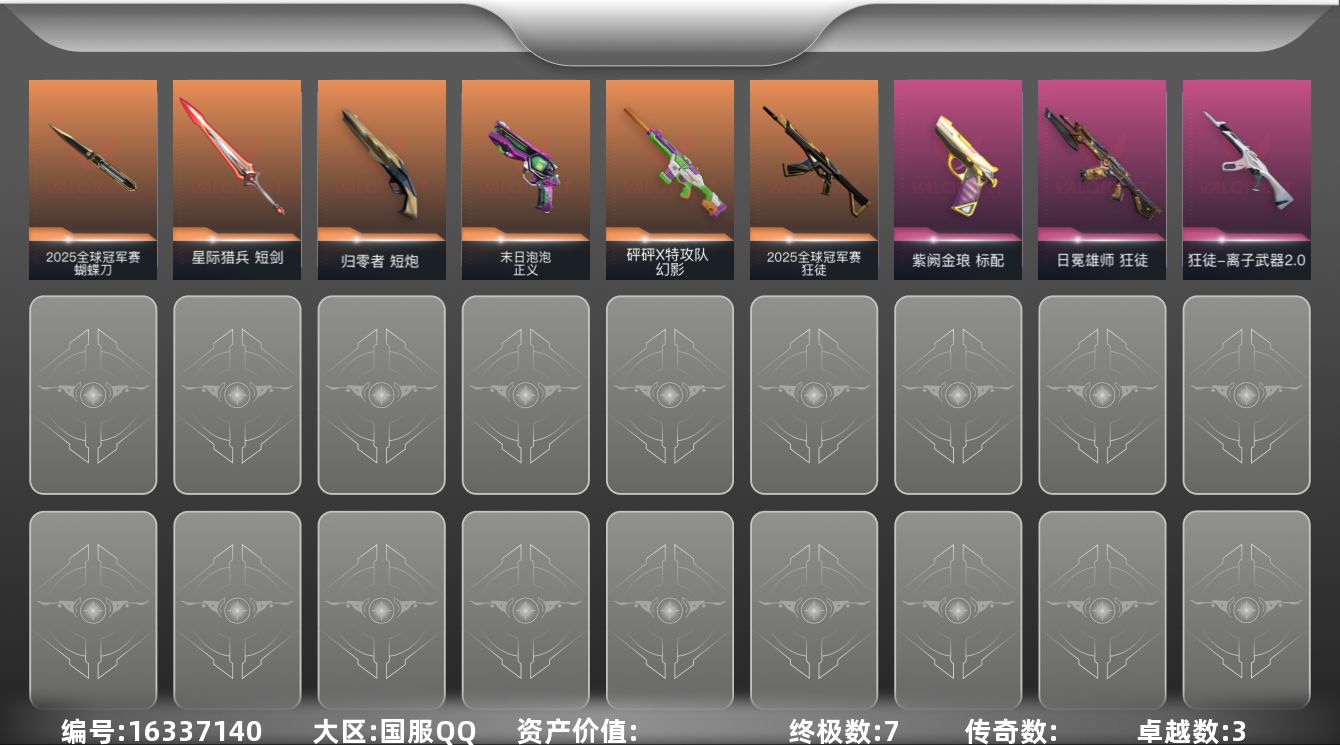 [16337140]【套装】:2025全球冠军赛套装 【英雄】:幻棱,炼狱,维斯,暮蝶,壹决,铁臂,捷风,雷兹,幽影,不死鸟,贤者,猎枭,零,芮娜,奇乐,尚勃勒,霓虹,夜露,盖可,黑梦 【近战武器】:近战武器-2025全球冠军赛 蝴蝶刀,近战武器-星际猎兵 短剑 【狂徒】:狂徒-2025全球冠军赛,狂徒-日冕雄师,狂徒-离子武器//2.0 【幻影】:幻影-砰砰X特攻队 【骇灵】:骇灵-无限竞技 【标配】:标配-紫阙金琅 【正义】:正义-末日泡泡 【短炮】:短炮-归零者 【卡面】:Clutch 卡面,无畏契约GO!第一卷:芮娜 卡面,无畏契约GO!第一卷:零 卡面,《双城之战》金克丝 卡面,钢锁vs盖可 卡面,别冒尖 卡面,代号红色 卡面,新兵报到 卡面,V契约 卡面,无畏契约 卡面 【喷漆】:霓光四射 喷漆,买装还是存钱 喷漆,关门放狗 喷漆,无畏契约GO!第一卷:贤者 喷漆,暴走萝莉 喷漆,胜利属于无畏契约 喷漆,GLHF 喷漆,无畏契约 喷漆 【挂饰】:无畏契约GO!第一卷 零 挂饰,天外飞客 挂饰,《双城之战》魄罗 挂饰,无畏契约 纪念币 挂饰