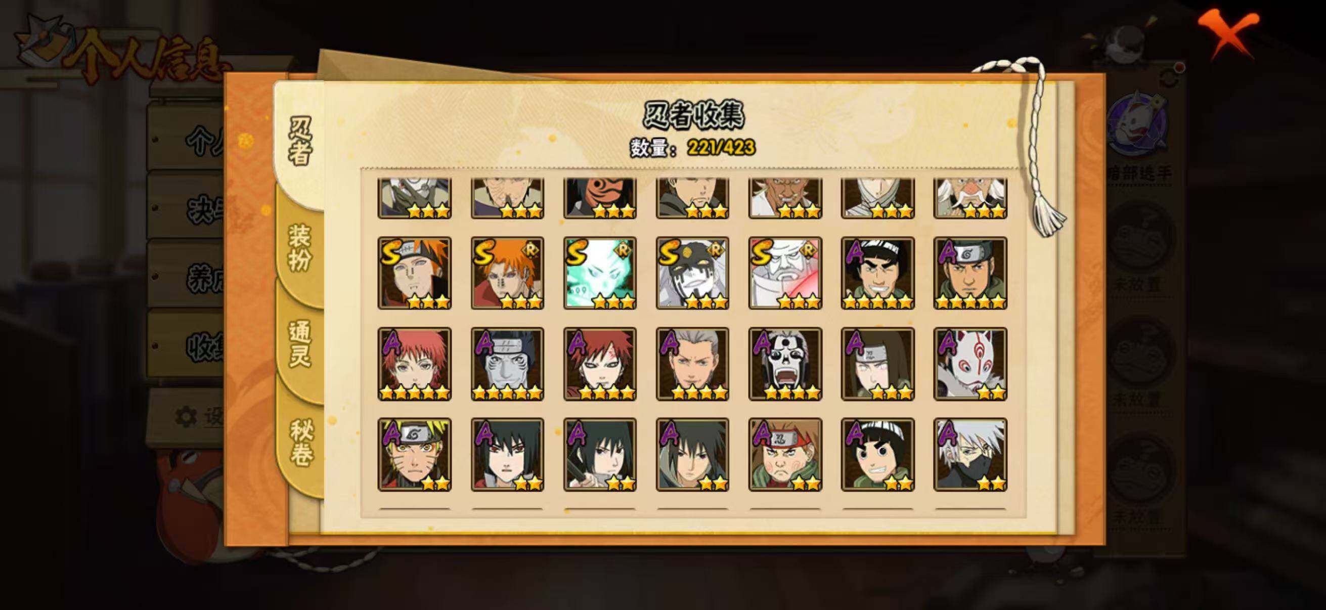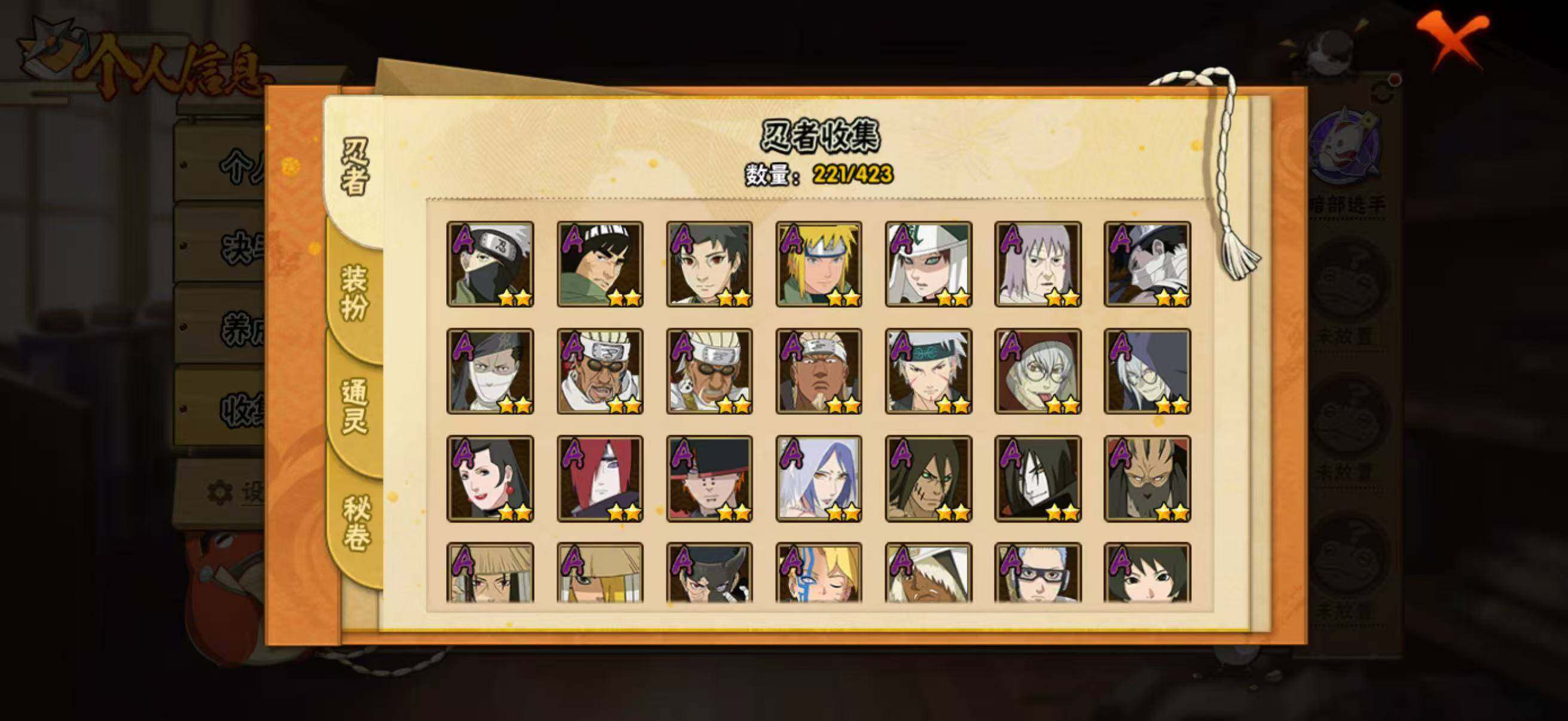 【A级忍者】:艾「青年」(2星),长门「青年」(2星),波风水门「青年」(2星),达鲁伊「博人传」(2星),迪达拉(2星),大蛇丸「晓」(2星),奇拉比(2星),奇拉比「忍界大战」(2星),飞段(4星),飞段「死司凭血」(4星),干柿鬼鲛(5星),漩涡博人「桃式显现」(2星),漩涡鸣人「仙人模式」(2星),迈特凯(5星),旗木卡卡西「忍界大战」(2星),旗木卡卡西「万花筒写轮眼」(2星),桃地再不斩「漂泊武士」(2星),桃地再不斩「秽土转生」(2星),我爱罗「疾风传」(4星),我爱罗「忍界大战」(2星),蝎(5星),蝎「绯流琥」(2星),小南「漂泊浪客」(2星),角都「秽土转生」(2星),猿飞阿斯玛(5星),宇智波止水「新春限定」(2星),宇智波鼬(2星),宇智波佐助「须佐能乎」(2星),宇智波佐助「万花筒写轮眼」(2星),药师兜「半蛇斗篷」(2星),药师兜「侠隐江湖」(2星),日向宁次「忍界大战」(3星),宇智波带土「漂泊浪客」(2星),长十郎「六代目水影」(2星),神秘面具男「忍者之路」(2星),佩恩·六道「漂泊浪客」(2星),李洛克「忍界大战」(2星),黑土「博人传」(2星),千手扉间「漂泊武士」(2星),秋道丁次「忍界大战」