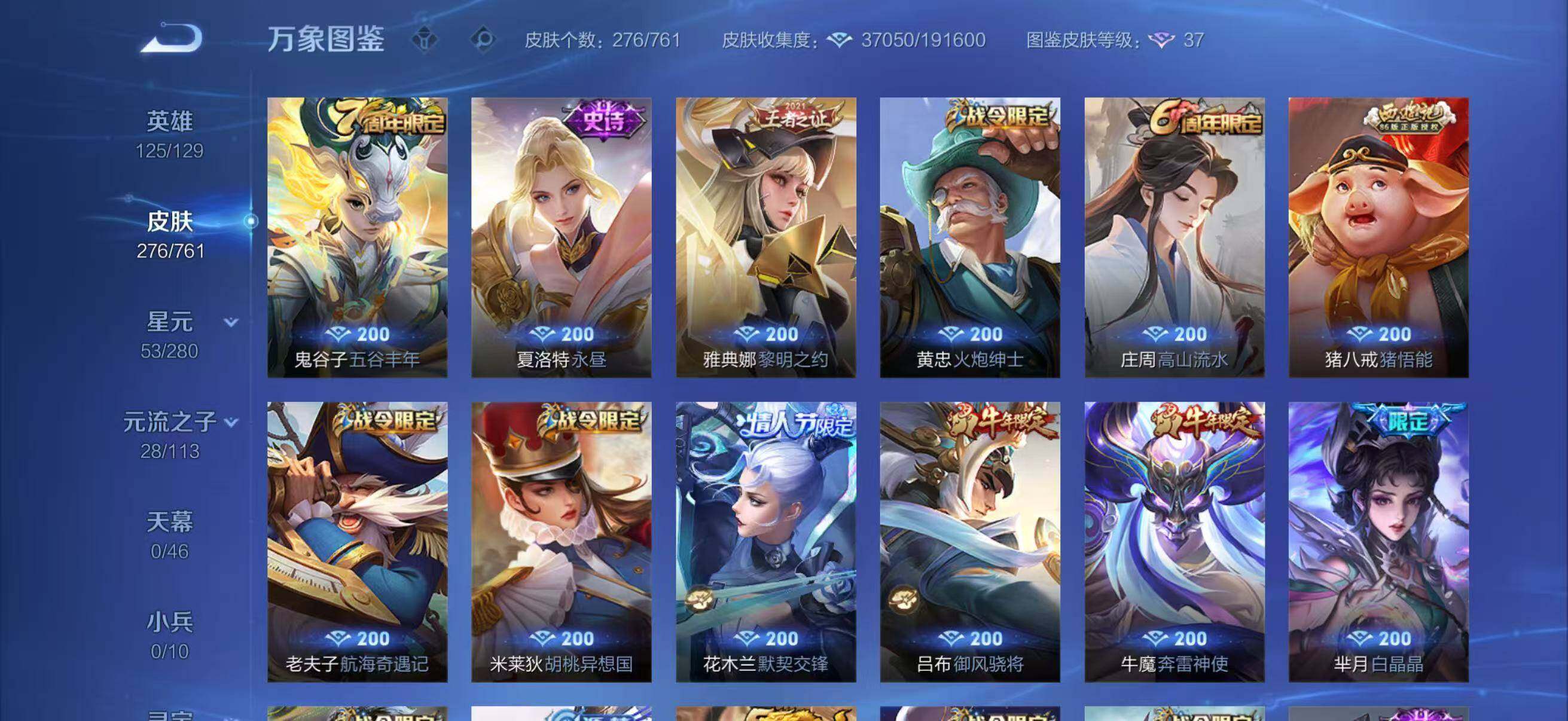 - PX_2040983-贵族等级: V5 英雄数: 90 皮肤数: 63 传说皮: 云鹰飞将,猫影幻舞 限定皮: 李小龙,飞衡,如梦令-后羿