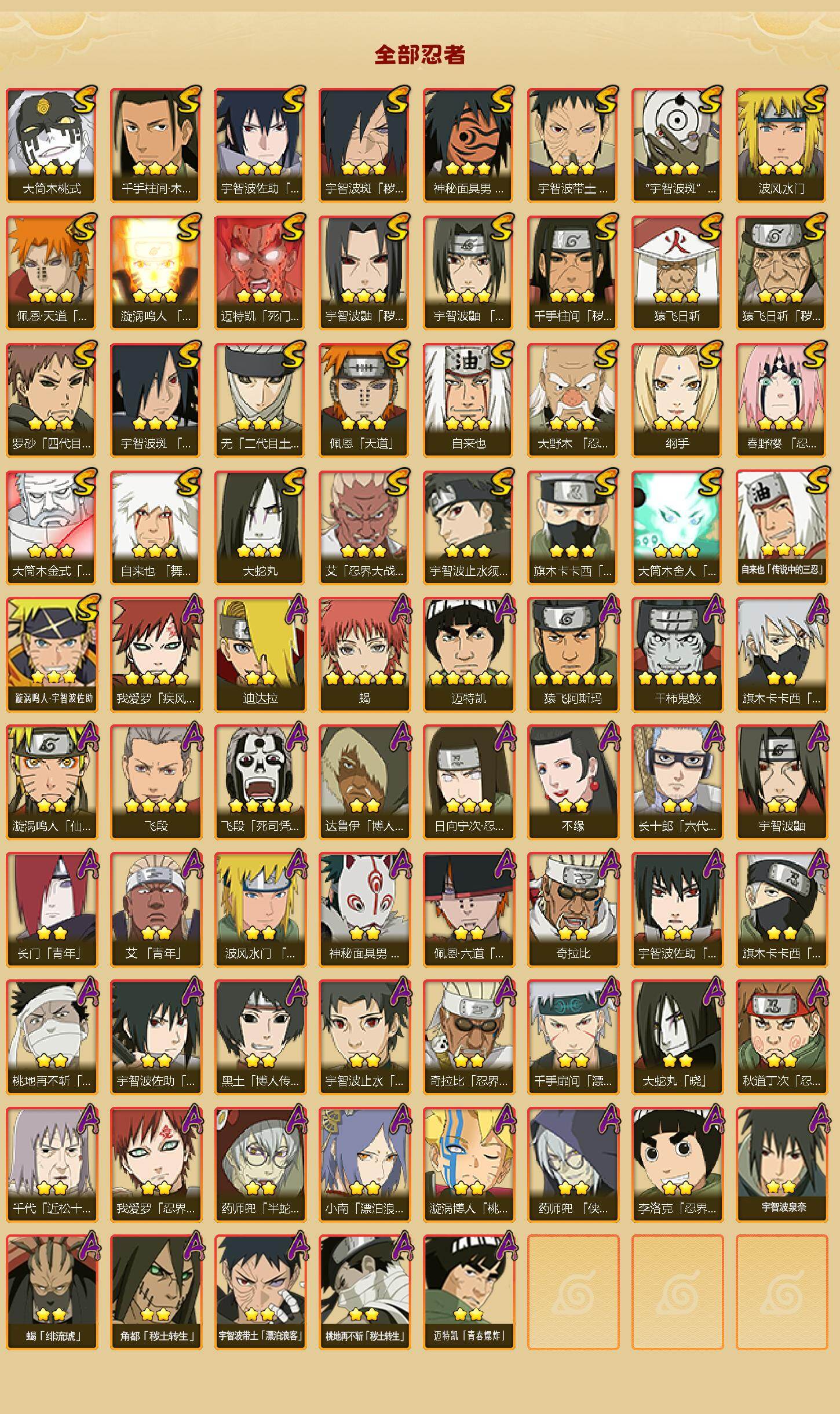 【S级忍者】:猿飞日斩「秽土转生」(3星),千手柱间「秽土转生」(3星),宇智波鼬「秽土转生」(3星),宇智波斑「秽土转生·解」(3星),大野木「忍界大战」(3星),春野樱「忍界大战」(3星),宇智波带土「忍界大战」(3星),艾「忍界大战」(3星),宇智波鼬「须佐能乎」(3星),宇智波止水「须佐能乎」(3星),旗木卡卡西「须佐能乎」(3星),宇智波斑「木叶创立」(3星),千手柱间「木叶创立」(3星),无「二代目土影」(3星),罗砂「四代目风影」(3星),自来也(3星),自来也「舞之豪杰」(3星),大蛇丸(3星),自来也「传说中的三忍」(3星),纲手(3星),猿飞日斩(3星),波风水门(3星),神秘面具男「红夜之刃」(3星),漩涡鸣人「九喇嘛连结」(3星),迈特凯「死门」(3星),佩恩「天道」(3星),佩恩·天道「超」(3星),宇智波佐助「永恒万花筒」(3星),宇智波斑 「白面具」(3星宇智波斑「白面具」),大筒木金式(3星),大筒木桃式(3星),大筒木舍人「最终章」(3星),漩涡鸣人·宇智波佐助(3星)