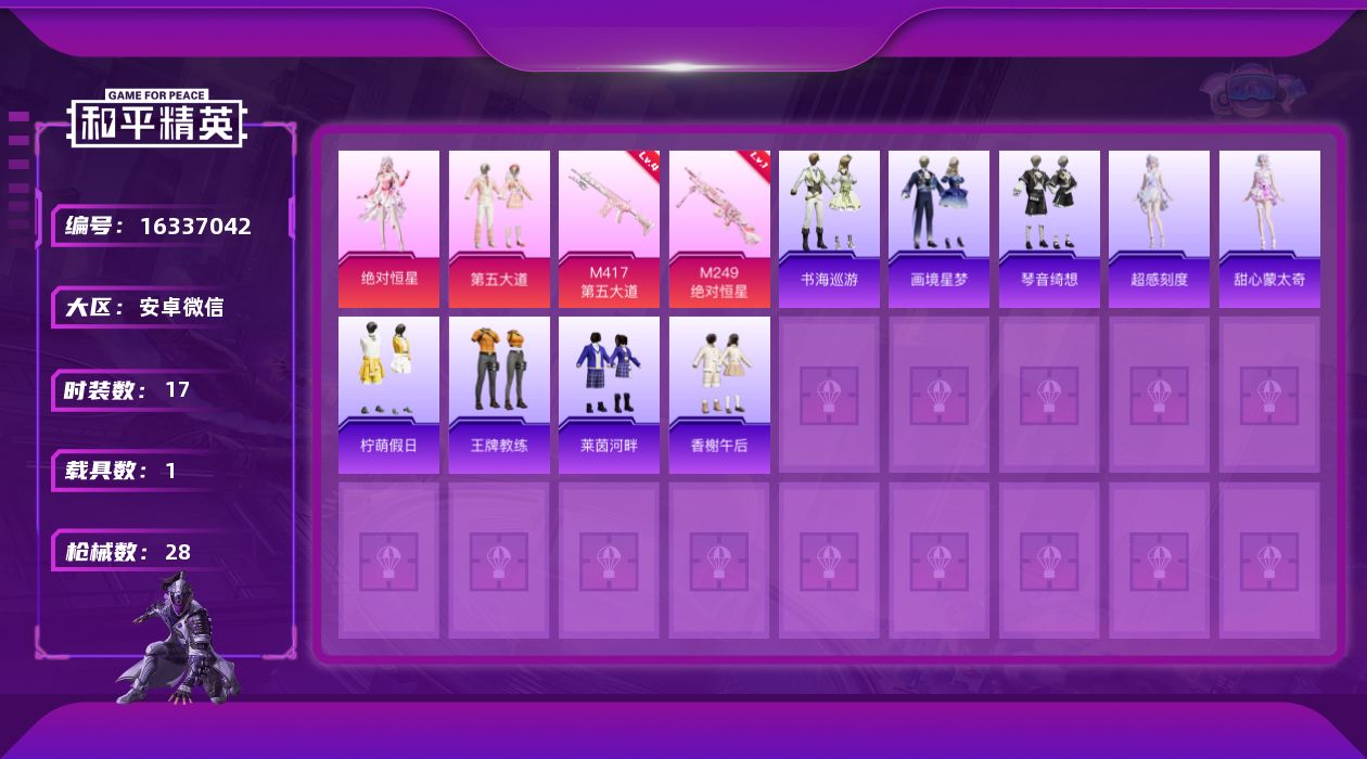 [16337042]【特价出售/店主推荐】安卓 微信-1神装-2粉装-2特效枪-1载具-3粉色飞行器-12282热力值-2王牌印记-17套装-28枪皮【红色神装等级】:暮色玫影-艾丽娅(二级)【红色角色神装】:暮色玫影-艾丽娅【粉色套装】:角色-绝对恒星,粉装-第五大道【粉色枪皮等级】:M417-第五大道(四级),M249-绝对恒星(一级)【粉色载具】:暮色幽蹄【粉色枪皮】:M417-第五大道,M249-绝对恒星【粉色飞行器】:绝对恒星飞行器,暮色之舞飞行器