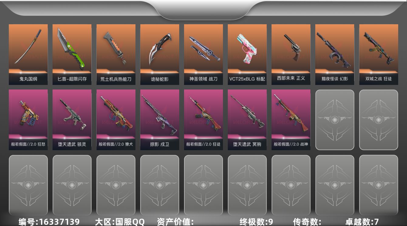[16337139]【套装】:般若假面//2.0套装 【英雄】:幻棱,炼狱,维斯,暮蝶,钛狐,壹决,铁臂,捷风,雷兹,幽影,不死鸟,贤者,猎枭,蝰蛇,零,芮娜,奇乐,尚勃勒,霓虹,斯凯,夜露,星礈,K/O,海神,盖可,黑梦,钢锁 【近战武器】:近战武器-鬼丸国纲,近战武器-超限闪存 匕首,近战武器-荒土机兵 热能刀,近战武器-诡秘蛇影 军刀,近战武器-神圣领域 战刀 【狂徒】:狂徒-双城之战,狂徒-般若假面//2.0,狂徒-荒土机兵,狂徒-诡秘蛇影 【幻影】:幻影-黯夜怪谈,幻影-超限闪存,幻影-神圣领域,幻影-纳米打击,幻影-末日之翼 【戍卫】:戍卫-掠影,戍卫-浮光跃金,戍卫-逆冲蛮牛,戍卫-月球哨兵,戍卫-折光棱晶 【獠犬】:獠犬-般若假面//2.0,獠犬-神圣领域,獠犬-模拟赫兹,獠犬-逆冲蛮牛 【冥驹】:冥驹-堕天遗武,冥驹-荒土机兵,冥驹-模拟赫兹,冥驹-星云暗涌 【飞将】:飞将-末日之翼 【莽侠】:莽侠-超限闪存,莽侠-诡秘蛇影,莽侠-月球哨兵 【战神】:战神-般若假面//2.0,战神-神圣领域,战神-浮光跃金 【奥丁】:奥丁-纳米打击,奥丁-末日之翼 【判官】:判官-诡秘蛇影,判官-纳米打击x 【雄鹿】:雄鹿-模拟赫兹,雄鹿-逆冲蛮牛,雄鹿-月球哨兵 【骇灵】:骇灵-堕天遗武,骇灵-荒土机兵,骇灵-浮光跃金,骇灵-星云暗涌 【蜂刺】:蜂刺-超限闪存,蜂刺-星云暗涌,蜂刺-折光棱晶 【标配】:标配-荒土机兵,标配-浮光跃金,标配-折光棱晶 【VCT手枪】:标配-VCT25 x BLG 【正义】:正义-西部未来,正义-超限闪存,正义-纳米打击,正义-月球哨兵 【鬼魅】:鬼魅-诡秘蛇影,鬼魅-模拟赫兹,鬼魅-星云暗涌 【狂怒】:狂怒-般若假面//2.0,狂怒-神圣领域,狂怒-逆冲蛮牛 【短炮】:短炮-末日之翼 【卡面】:终章:激斗汉堡 卡面,进入射程 卡面,分崩离析 卡面,纳米打击 卡面,抑制技术 卡面,激斗汉堡 卡面,瓦娃脸雪糕 P2 卡面,从黄昏到黎明 卡面,荒土机兵 卡面,银弹猎手 卡面,逆冲蛮牛 卡面,《双城之战》拥抱 卡面,精灵大战 卡面,欢迎来到底城 卡面,南瓜盛典 卡面,唱片的故事 卡面,钢弓与箭弦 卡面,排除故障 卡面,战术桌游 卡面,悠享食光 卡面,修车达人 卡面,模拟赫兹 卡面,浮光跃金 卡面,超限闪存 卡面,维斯工牌 卡面,正义的化身 卡面,红鳞松叶