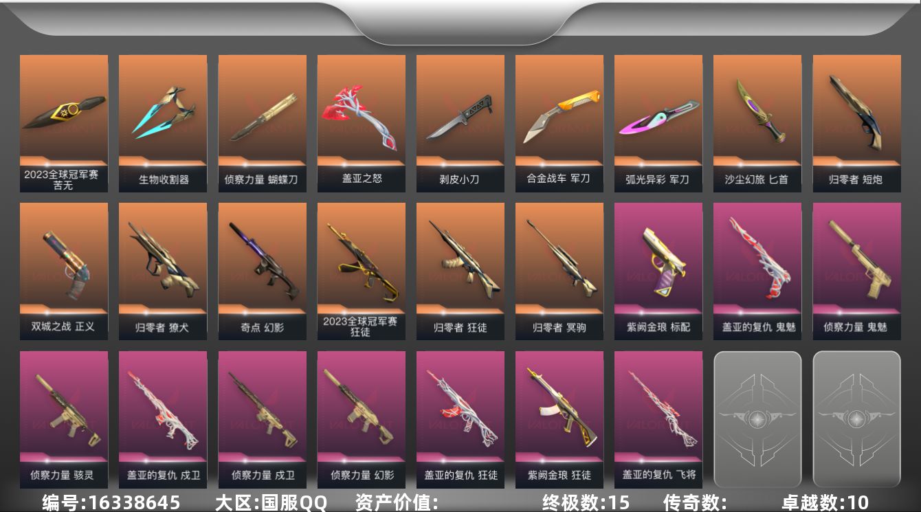 [16338645]【套装】:2023全球冠军赛套装,《英雄联盟:双城之战》套装,归零者套装,侦察力量套装,盖亚的复仇套装 【英雄】:炼狱,维斯,暮蝶,壹决,铁臂,捷风,雷兹,幽影,不死鸟,贤者,猎枭,蝰蛇,零,芮娜,奇乐,尚勃勒,霓虹,斯凯,夜露,星礈,K/O,海神,盖可,黑梦,钢锁 【近战武器】:近战武器-2023全球冠军赛 苦无,近战武器-侦察力量 蝴蝶刀,近战武器-剥皮小刀,近战武器-盖亚之怒,近战武器-合金战车 军刀,近战武器-弧光异彩 军刀,近战武器-沙尘幻旅 匕首,近战武器-生物收割器 【狂徒】:狂徒-2023全球冠军赛,狂徒-归零者,狂徒-盖亚的复仇,狂徒-紫阙金琅,狂徒-弧光异彩,狂徒-沙尘幻旅 【幻影】:幻影-奇点,幻影-侦察力量,幻影-合金战车,幻影-噬源兽防卫工程 【戍卫】:戍卫-盖亚的复仇,戍卫-侦察力量,戍卫-彩梦之城,戍卫-花漾粉红,戍卫-萌彩剪影 【獠犬】:獠犬-归零者,獠犬-弧光异彩,獠犬-胡桃狂想,獠犬-数码咒术 【冥驹】:冥驹-归零者,冥驹-胡桃狂想,冥驹-花漾粉红 【飞将】:飞将-盖亚的复仇,飞将-合金战车,飞将-沙尘幻旅,飞将-信手涂鸦 【战神】:战神-萌彩剪影,战神-数码咒术 【奥丁】:奥丁-信手涂鸦 【判官】:判官-萌彩剪影,判官-数码咒术 【雄鹿】:雄鹿-彩梦之城 【骇灵】:骇灵-侦察力量,骇灵-沙尘幻旅,骇灵-花漾粉红,骇灵-信手涂鸦 【蜂刺】:蜂刺-合金战车,蜂刺-弧光异彩,蜂刺-胡桃狂想 【标配】:标配-紫阙金琅,标配-彩梦之城 【正义】:正义-双城之战,正义-合金战车,正义-沙尘幻旅 【鬼魅】:鬼魅-盖亚的复仇,鬼魅-侦察力量,鬼魅-胡桃狂想,鬼魅-灵魂消声者,鬼魅-数码咒术,鬼魅-信手涂鸦 【狂怒】:狂怒-花漾粉红,狂怒-萌彩剪影 【短炮】:短炮-归零者,短炮-弧光异彩 【卡面】:南瓜盛典 卡面,正义的化身 卡面,梦幻奶茶 卡面,源能反应 卡面,零点嗅探设计图 卡面,清除名单 卡面,龍记 卡面,无垠星环 卡面,暗枪 卡面,铁臂vs雷兹 卡面,纪念照 P2 卡面,一击全倒 卡面,黑影先生的咖啡! 卡面,天台狂欢 卡面,胡桃狂想 卡面,沙尘幻旅 卡面,壹决工牌 卡面,萌彩剪影 卡面,势不可挡//K/O 卡面,夯实根基 卡面,"Luie" 卡面,热烈欢迎 卡面,铁臂设计图 卡面,代号红色 卡面,冰淇淋店 卡面,新兵报到 卡面,友军火