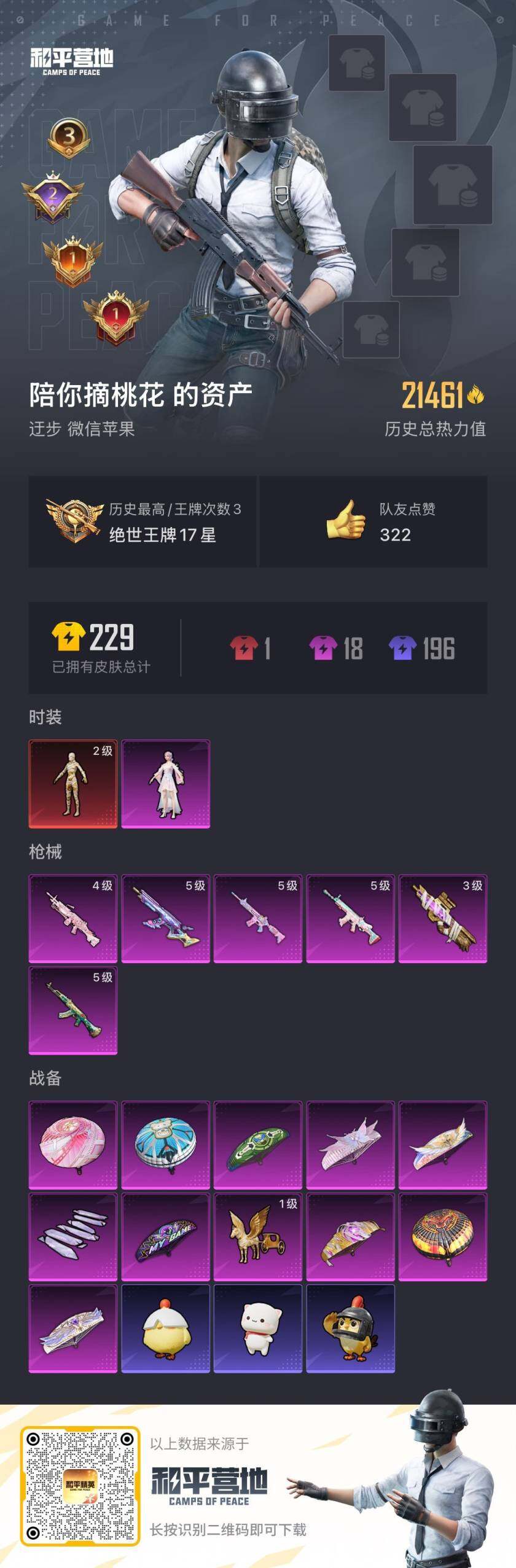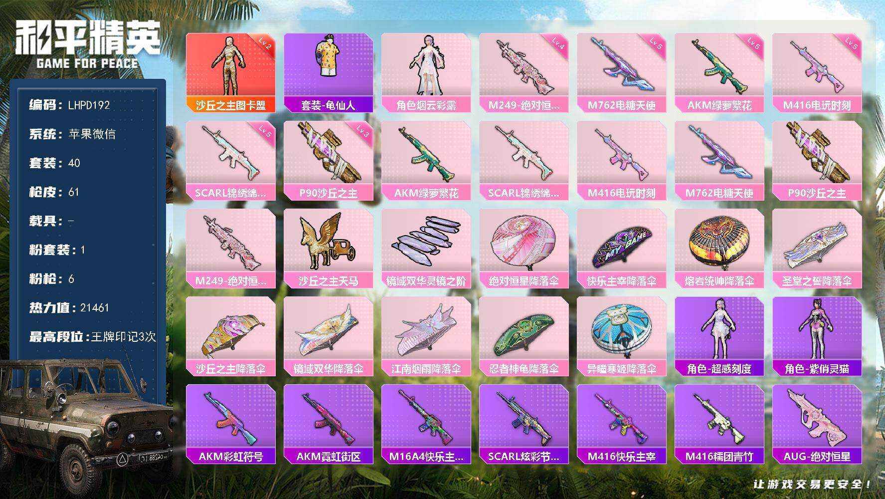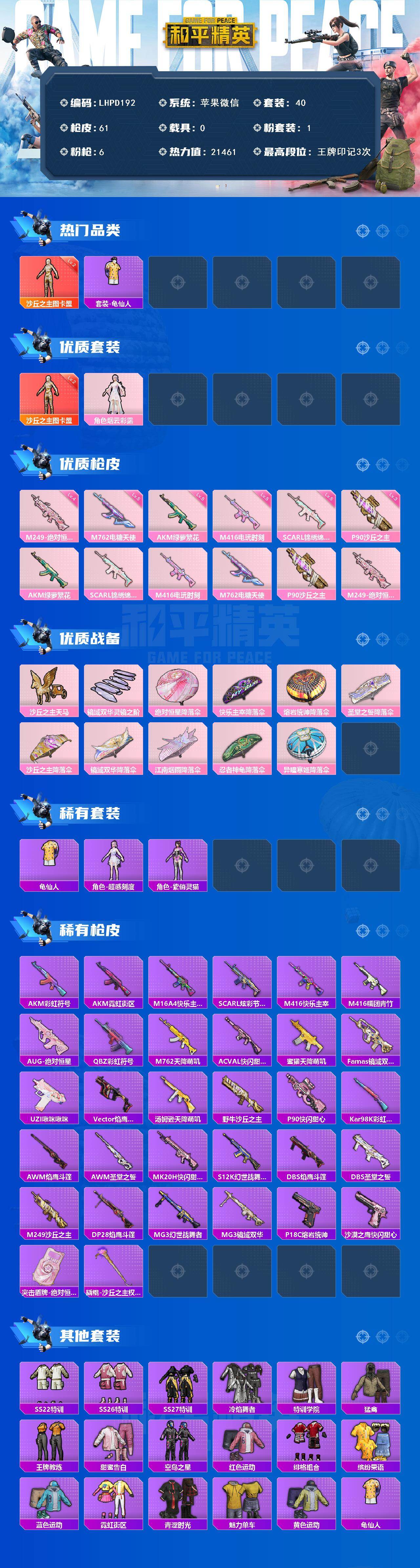 [16337054]【特价出售/店主推荐】苹果 微信-1神装-1粉装-6特效枪-0载具-2粉色飞行器-21461热力值-3王牌印记-40套装-61枪皮【红色神装等级】:沙丘之主-图卡盟(二级)【红色角色神装】:沙丘之主-图卡盟【热门品类】:套装-龟仙人【粉色套装】:角色-烟云彩露【粉色枪皮等级】:AKM-绿萝繁花(五级),SCAR-L-锦绣绵绵(五级),M416-电玩时刻(五级),M762-电糖天使(五级),P90-沙丘之主(三级),M249-绝对恒星(四级)【粉色枪皮】:AKM-绿萝繁花,SCAR-L-锦绣绵绵,M416-电玩时刻,M762-电糖天使,P90-沙丘之主,M249-绝对恒星【粉色飞行器】:沙丘之主天马,镜域双华-灵镜之阶