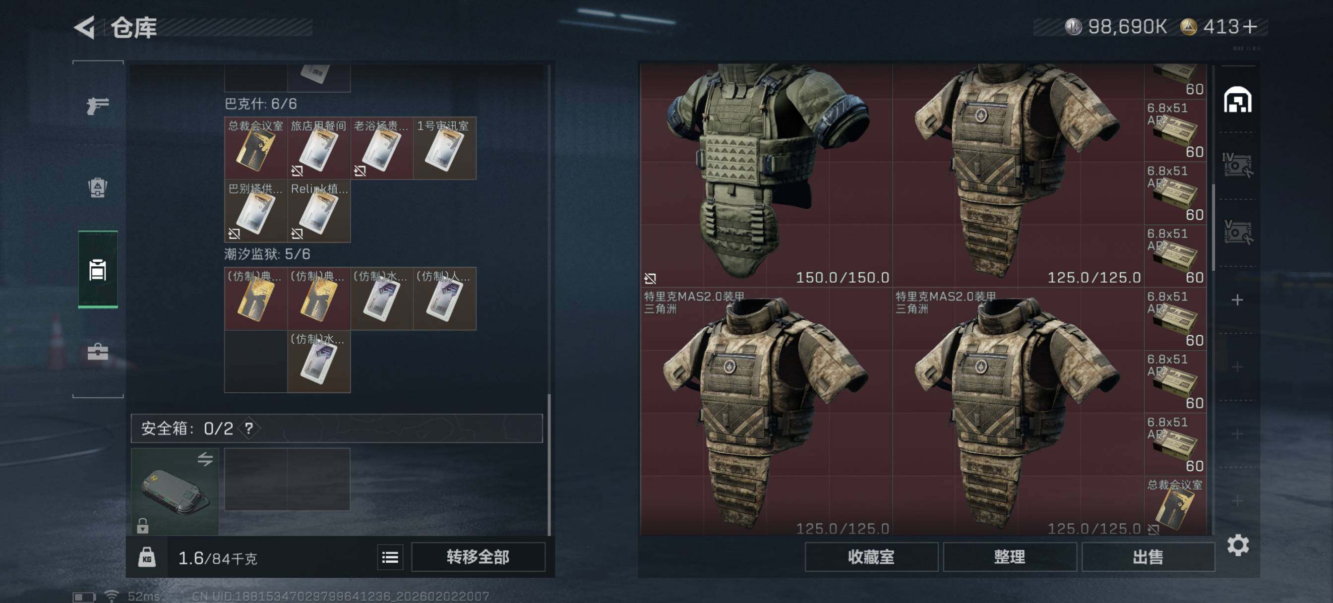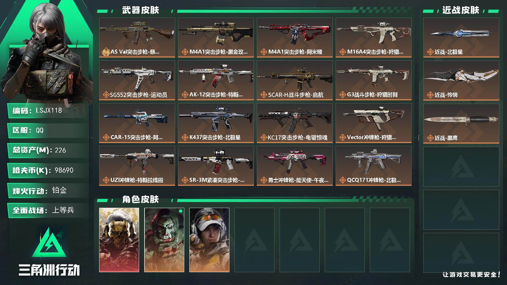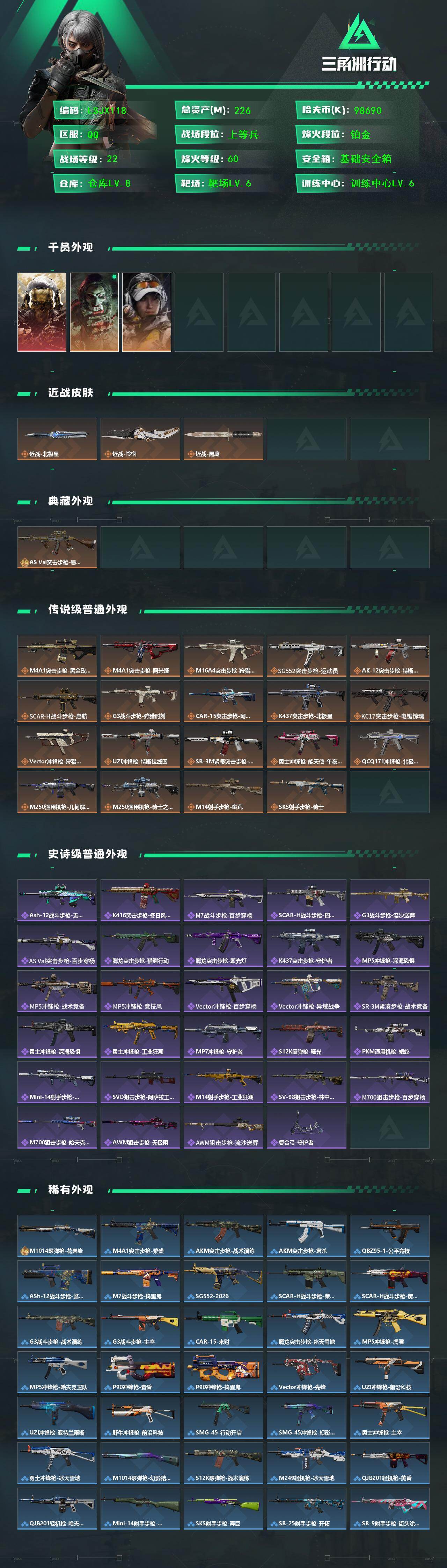[16337300]【特价出售/店主推荐】226m总资产-98690k哈伏币-60烽火等级-铂金-22战场等级-上等兵 【干员外观】:红狼-蚀金玫瑰,红狼-电锯惊魂,露娜-金牌射手 【近战皮肤】:近战-北极星,近战-怜悯,近战-黑鹰 【典藏外观】:AS Val突击步枪-悬赏令 【典藏外观成色】:AS Val突击步枪-悬赏令(优品S) 【传说外观】:M4A1突击步枪-蚀金玫瑰,M4A1突击步枪-阿米娅,M16A4突击步枪-狩猎时刻,SG552突击步枪-运动员,AK-12突击步枪-特斯拉线圈,SCAR-H战斗步枪-启航,G3战斗步枪-狩猎时刻,CAR-15突击步枪-阿米娅,K437突击步枪-北极星,KC17突击步枪-电锯惊魂,Vector冲锋枪-狩猎时刻,UZI冲锋枪-特斯拉线圈,SR-3M紧凑突击步枪-特斯拉线圈,勇士冲锋枪-能天使-午夜邮差,QCQ171冲锋枪-北极星,M250通用机枪-几何解构,M250通用机枪-骑士之心,M14射手步枪-蛮荒,SKS射手步枪-骑士 【史诗外观】:ASh-12战斗步枪-无极限,K416突击步枪-冬日风情,M7战斗步枪-百步穿杨,SCAR-H战斗步枪-囚徒,G3战斗步枪-流沙送葬,AS Val突击步枪-百步穿杨,腾龙突击步枪-猎鳄行动,腾龙突击步枪-聚光灯,K437突击步枪-守护者,MP5冲锋枪-深海恐惧,MP5冲锋枪-战术竞备,MP5冲锋枪-竞技风,Vector冲锋枪-百步穿杨,Vector冲锋枪-异域战争,SR-3M紧凑突击步枪-战术竞备,勇士冲锋枪-深海恐惧,勇士冲锋枪-工业狂潮,MP7冲锋枪-守护者,S12K霰弹枪-曙光,PKM通用机枪-蝮蛇,Mini-14射手步枪-守护者,SVD狙击步枪-阿萨拉工艺,M14射手步枪-工业狂潮,SV-98狙击步枪-林中猎手,M700狙击步枪-百步穿杨,M700狙击步枪-哈夫克警备,AWM狙击步枪-无极限,AWM狙击步枪-流沙送葬,复合弓-守护者 【稀有外观】:M1014霰弹枪-花岗岩,M4A1突击步枪-繁盛,AKM突击步枪-战术演练,AKM突击步枪-肃杀,QBZ95-1突击步枪-公平竞技,ASh-12战斗步枪-繁盛,M7战斗步枪-捣蛋鬼,SG552突击步枪-2026,SCAR-H战斗步枪-荣耀列队,SCAR-H战斗步枪-黄昏,G3战斗步枪-战术演练,G3战斗步枪-主宰*2,CAR-15突击步枪-来财,腾龙突击步