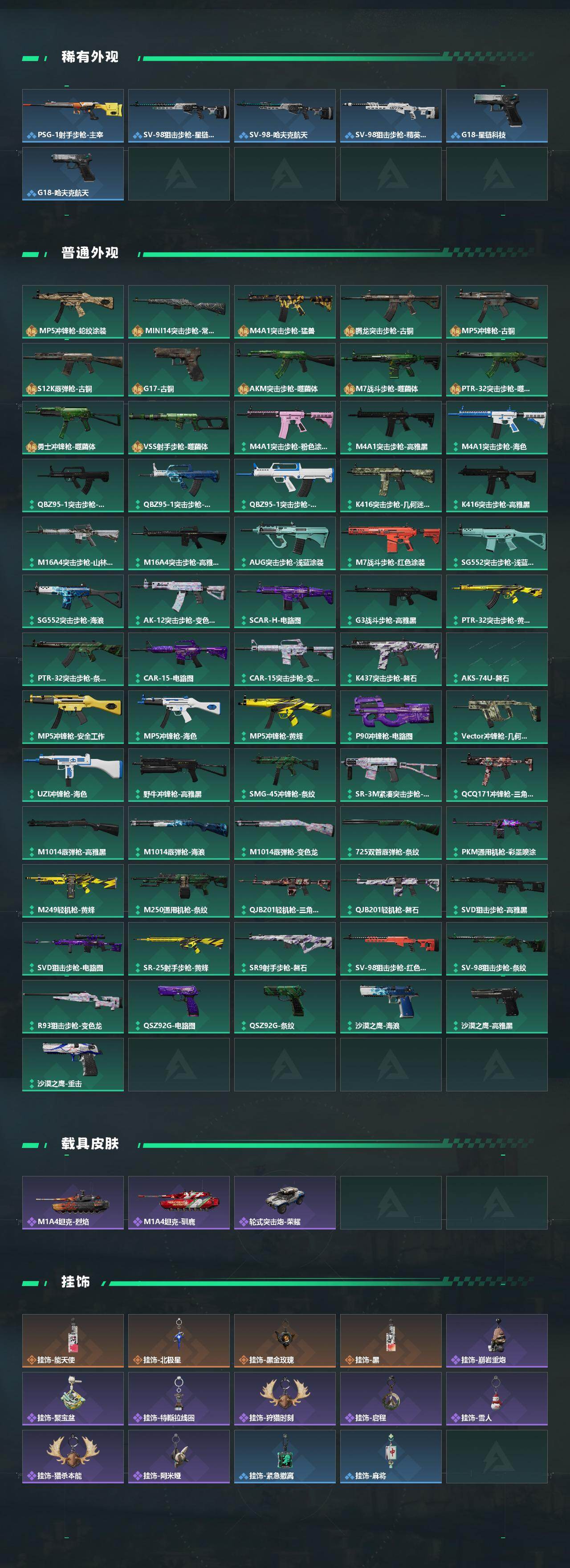 【稀有外观】:M1014霰弹枪-花岗岩,M4A1突击步枪-繁盛,AKM突击步枪-战术演练,AKM突击步枪-肃杀,QBZ95-1突击步枪-公平竞技,ASh-12战斗步枪-繁盛,M7战斗步枪-捣蛋鬼,SG552突击步枪-2026,SCAR-H战斗步枪-荣耀列队,SCAR-H战斗步枪-黄昏,G3战斗步枪-战术演练,G3战斗步枪-主宰*2,CAR-15突击步枪-来财,腾龙突击步