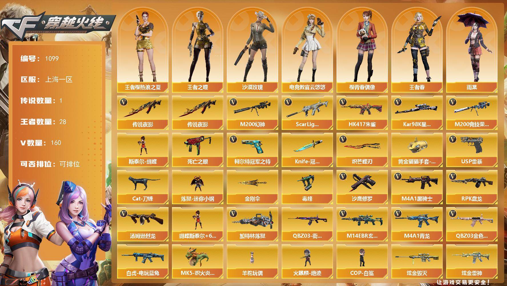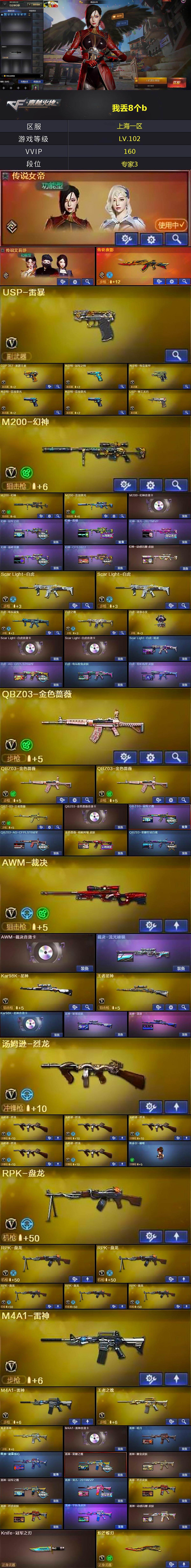 [16338836]上海一区-160V-28王者-4炫金 【传说武器】:传说夜影 【传说角色】:传说女帝,传说艾莉莎 【热门武器】:传说夜影,QBZ03-金色蔷薇*3,M14EBR-玄武,Scar Light-白虎*2,HK417-朱雀,M4A1-青龙,M200-幻神*2,M200-竞技荣光,死亡之眼,白虎-电玩蓝兔,QBZ03-街机,柯尔特-冠军之特,Kar98K-星神,Cat-刀锋,炼狱-迷你小钢,毒蜂*2,M4A1-黑骑士*2,汤姆逊-烈龙*6,RPK-盘龙*6,加特林-炼狱*2,斯泰尔-蝴蝶,MK5-炽火炎龙,羊驼玩偶,火麒麟-绝迹,COP-白鲨,USP-雷暴,沙鹰-修罗*6,Knife-冠军之刃,炽芒蝶刃,黄金猫猫手套-白鲨,金刚伞 【王者炫金武器】:炫金雷神,炫金武士*2,炫金毁灭,王者之魄高爆手雷,王者之魄闪光弹*2,王者之魄烟雾弹 【音效卡】:天神-动感闪耀 音效卡,烈火-动感闪耀 音效卡,M200-幻神音效卡,AK47-火麒麟音效卡,M4A1-雷神音效卡,M4A1-黑龙音效卡,M4A1-黑骑士音效卡,Barrett-毁灭音效卡,Barrett-极光音效卡,AWM-裁决音效卡,Scar Light-白虎音效卡*2,枪娘语音包-阿敏,Kar98K-星神音效卡,女战神梧桐语音包 【皮肤】:幻神-冠军之幻,幻神-青鹤,幻神-宠儿-2021MVP,幻神-巅峰荣耀,幻神-CFS2022,幻神-动感闪耀 皮肤,Scar Light-白虎-暗星,白虎-AG-CFPLS20冠军,白虎-电玩粉兔皮肤,白虎-霓虹机甲 皮肤,QBZ03-冠军之薇,QBZ03-AG-CFPLS19冠军,金色蔷薇-枪娘阿敏 皮肤,QBZ03-荣耀世冠白鲨,裁决-流光秘银,星神-璀璨皮肤,星神-漫游,雷神-暗月,雷神-能量核心,雷神-荣耀之魄,雷神-耀金皮肤,雷神-冠军之魄,雷神-宠儿-2019MVP,雷神-烈虎皮肤*2,雷神-宇航兔皮肤,雷神-动感闪耀 皮肤,火麒麟-雷神,火麒麟-冠军之心,AK47-火麒麟-传奇EVEN,火麒麟-轻羽皮肤,传奇石头-横秒之巅,火麒麟-盘古,火麒麟-心动糖果,毁灭-暗月,毁灭-荣耀之怒*2,毁灭-星空,毁灭-冠军之怒,毁灭-BEAN-2020MVP,毁灭-魔灵皮肤,毁灭-直播专属,毁灭-百城浙江 皮肤,黑龙-能量核心,黑龙-暗月,黑龙-墨子皮肤,黑骑士耀金皮肤,黑骑士-冠军之势