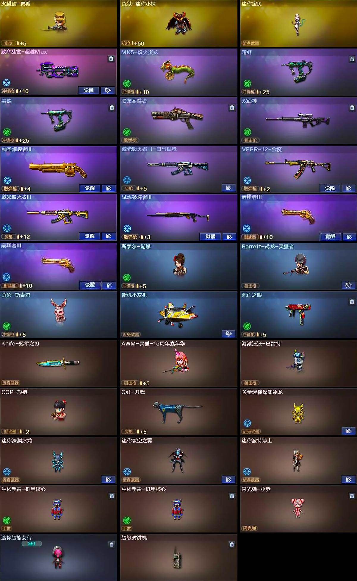 【热门武器】:传说夜影,QBZ03-金色蔷薇*3,M14EBR-玄武,Scar Light-白虎*2,HK417-朱雀,M4A1-青龙,M200-幻神*2,M200-竞技荣光,死亡之眼,白虎-电玩蓝兔,QBZ03-街机,柯尔特-冠军之特,Kar98K-星神,Cat-刀锋,炼狱-迷你小钢,毒蜂*2,M4A1-黑骑士*2,汤姆逊-烈龙*6,RPK-盘龙*6,加特林-炼狱*2,斯泰尔-蝴蝶,MK5-炽火炎龙,羊驼玩偶,火麒麟-绝迹,COP-白鲨,USP-雷暴,沙鹰-修罗*6,Knife-冠军之刃,炽芒蝶刃,黄金猫猫手套-白鲨,金刚伞