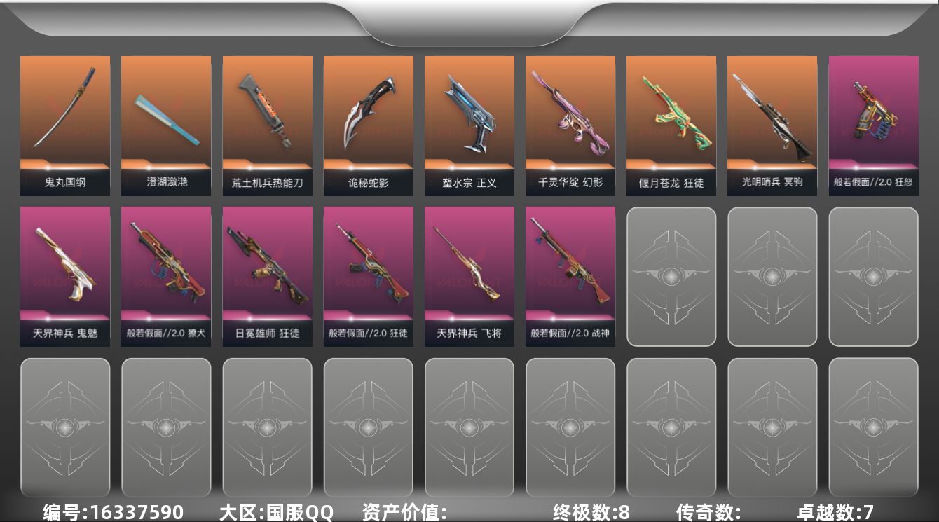 [16337590]【套装】:般若假面//2.0套装 【英雄】:幻棱,炼狱,维斯,暮蝶,壹决,铁臂,捷风,雷兹,幽影,不死鸟,贤者,猎枭,零,芮娜,尚勃勒,霓虹,斯凯,夜露,星礈,盖可,黑梦,钢锁 【近战武器】:近战武器-澄湖潋滟,近战武器-鬼丸国纲,近战武器-荒土机兵 热能刀,近战武器-诡秘蛇影 军刀 【狂徒】:狂徒-偃月苍龙,狂徒-般若假面//2.0,狂徒-日冕雄师,狂徒-荒土机兵,狂徒-诡秘蛇影 【幻影】:幻影-千灵华绽,幻影-超限闪存,幻影-纳米打击,幻影-末日之翼 【戍卫】:戍卫-浮光跃金,戍卫-逆冲蛮牛,戍卫-折光棱晶 【獠犬】:獠犬-般若假面//2.0,獠犬-模拟赫兹,獠犬-逆冲蛮牛 【冥驹】:冥驹-光明哨兵,冥驹-荒土机兵,冥驹-模拟赫兹 【飞将】:飞将-天界神兵,飞将-末日之翼 【莽侠】:莽侠-超限闪存,莽侠-诡秘蛇影 【战神】:战神-般若假面//2.0,战神-浮光跃金 【奥丁】:奥丁-纳米打击,奥丁-末日之翼 【判官】:判官-诡秘蛇影,判官-纳米打击x 【雄鹿】:雄鹿-模拟赫兹,雄鹿-逆冲蛮牛 【骇灵】:骇灵-荒土机兵,骇灵-浮光跃金 【蜂刺】:蜂刺-超限闪存,蜂刺-折光棱晶 【标配】:标配-荒土机兵,标配-浮光跃金,标配-折光棱晶 【正义】:正义-塑水宗,正义-纳米打击 【鬼魅】:鬼魅-天界神兵,鬼魅-诡秘蛇影,鬼魅-模拟赫兹 【狂怒】:狂怒-般若假面//2.0,狂怒-逆冲蛮牛 【短炮】:短炮-末日之翼 【卡面】:终章:激斗汉堡 卡面,进入射程 卡面,分崩离析 卡面,纳米打击 卡面,抑制技术 卡面,激斗汉堡 卡面,瓦娃脸雪糕 P2 卡面,从黄昏到黎明 卡面,荒土机兵 卡面,银弹猎手 卡面,逆冲蛮牛 卡面,《双城之战》拥抱 卡面,精灵大战 卡面,欢迎来到底城 卡面,南瓜盛典 卡面,钢弓与箭弦 卡面,排除故障 卡面,战术桌游 卡面,悠享食光 卡面,修车达人 卡面,模拟赫兹 卡面,浮光跃金 卡面,超限闪存 卡面,维斯工牌 卡面,正义的化身 卡面,无畏契约GO!第一卷:芮娜 卡面,无畏契约GO!第一卷:零 卡面,《双城之战》金克丝 卡面,势不可挡//盖可 卡面,代号红色 卡面,新兵报到 卡面,V契约 卡面,无畏契约 卡面 【喷漆】:小小心意 喷漆,战“素”兔 喷漆,宇宙的指引 喷漆,请求重启 喷漆,逆冲蛮牛 喷漆,纳米打击 喷漆,鼻尖上的蝴蝶 喷漆,简笔画黯兽 喷漆,独