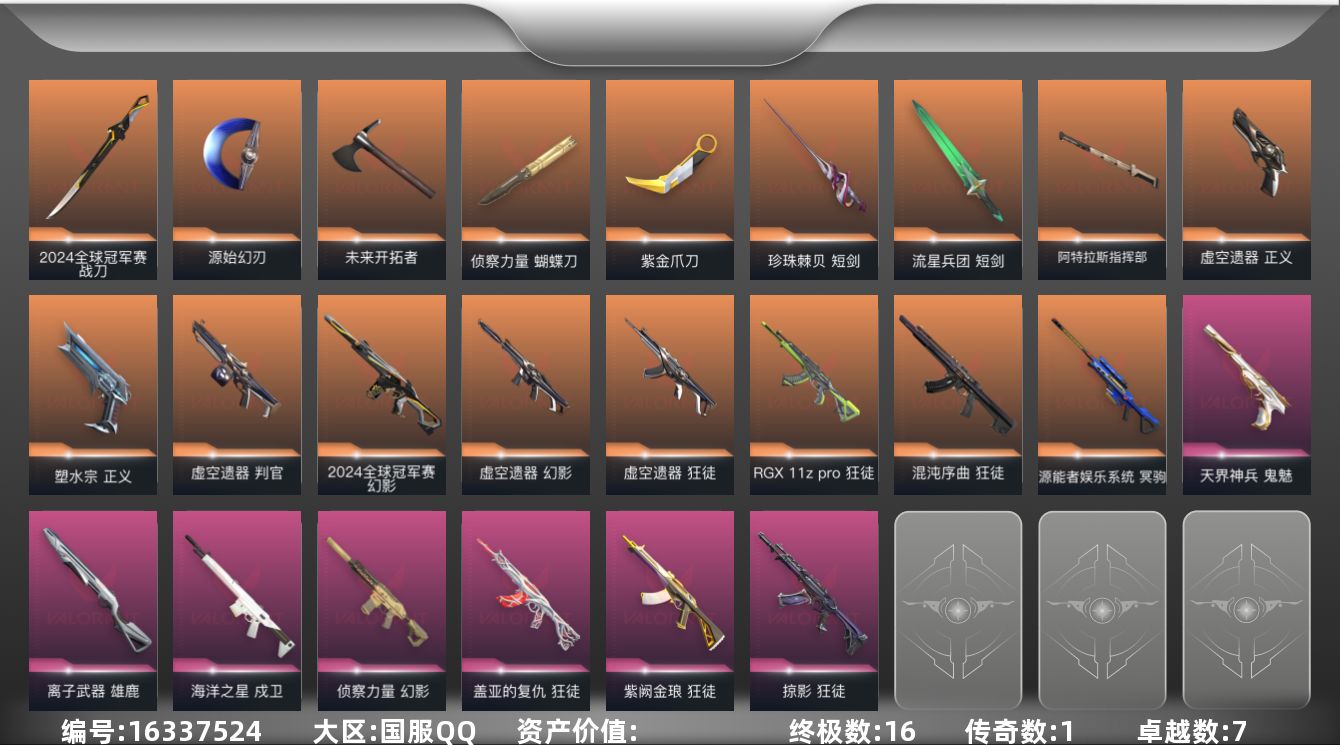 [16337524]【套装】:2024全球冠军赛套装,虚空遗器套装 【英雄】:幻棱,炼狱,维斯,暮蝶,钛狐,壹决,铁臂,捷风,雷兹,幽影,不死鸟,贤者,猎枭,蝰蛇,零,芮娜,奇乐,尚勃勒,霓虹,盖可 【近战武器】:近战武器-2024全球冠军赛 战刀,近战武器-侦察力量 蝴蝶刀,近战武器-紫金爪刀,近战武器-源始幻刃,近战武器-未来开拓者,近战武器-珍珠棘贝 短剑,近战武器-流星兵团 短剑,近战武器-阿特拉斯指挥部 甩棍 【狂徒】:狂徒-混沌序曲,狂徒-虚空遗器,狂徒-RGX 11z Pro,狂徒-掠影,狂徒-盖亚的复仇,狂徒-紫阙金琅,狂徒-流星兵团 【幻影】:幻影-2024全球冠军赛,幻影-虚空遗器,幻影-侦察力量,幻影-珍珠棘贝 【戍卫】:戍卫-海洋之星,戍卫-珍珠棘贝,戍卫-战术熊与伙伴们 【獠犬】:獠犬-复古浪潮 【冥驹】:冥驹-源能者娱乐系统,冥驹-复古浪潮 【飞将】:飞将-战术熊与伙伴们 【莽侠】:莽侠-深海水族,莽侠-纤云弄巧 【战神】:战神-深海水族 【奥丁】:奥丁-流星兵团 【判官】:判官-虚空遗器 【雄鹿】:雄鹿-离子武器,雄鹿-复古浪潮 【骇灵】:骇灵-流星兵团,骇灵-珍珠棘贝 【蜂刺】:蜂刺-深海水族,蜂刺-纤云弄巧 【标配】:标配-超能偶像,标配-战术熊与伙伴们 【正义】:正义-塑水宗,正义-虚空遗器,正义-超限闪存,正义-复古浪潮,正义-纤云弄巧 【鬼魅】:鬼魅-天界神兵,鬼魅-流星兵团,鬼魅-诡秘蛇影,鬼魅-星云暗涌 【狂怒】:狂怒-珍珠棘贝,狂怒-战术熊与伙伴们 【短炮】:短炮-深海水族,短炮-纤云弄巧 【卡面】:分崩离析 卡面,瓦娃脸雪糕 P2 卡面,《双城之战》拥抱 卡面,精灵大战 卡面,欢迎来到底城 卡面,南瓜盛典 卡面,修车达人 卡面,正义的化身 卡面,终章:生意人麦宝 卡面,铁之华 卡面,2024全球冠军赛 卡面,时间到 卡面,最高舞台 卡面,音熊登场 卡面,树懒大作战 卡面,声感陷阱设计图 卡面,霓帧牛蛙 卡面,战术小伙伴的夏日 卡面,梦幻奶茶 卡面,终章:打造专属狂徒 卡面,趁热吃 卡面,西装暴徒 卡面,失控边缘 卡面,哨卫者之领域 卡面,暮蝶工牌 卡面,战术熊与伙伴们 卡面,源能反应 卡面,流星兵团 卡面,纤云弄巧 卡面,暂别喧嚣 卡面,打造专属狂徒 卡面,零点嗅探设计图 卡面,表象之下 卡面,虹吸式咖啡壶 卡面,源能者美容 卡面,脚踝