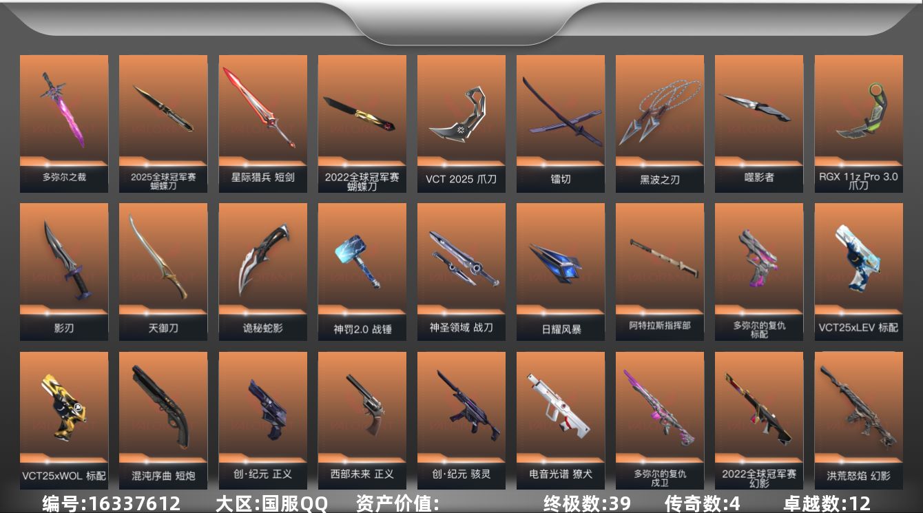 [16337612]【套装】:2025全球冠军赛套装,2022全球冠军赛套装,多弥尔的复仇套装,VCT 2025 赛季套装,创·纪元套装 【英雄】:幻棱,炼狱,维斯,暮蝶,钛狐,壹决,捷风,雷兹,幽影,不死鸟,贤者,猎枭,蝰蛇,零,芮娜,奇乐,尚勃勒,霓虹,盖可,钢锁 【近战武器】:近战武器-2025全球冠军赛 蝴蝶刀,近战武器-2022全球冠军赛 蝴蝶刀,近战武器-多弥尔之裁,近战武器-VCT 2025 爪刀,近战武器-RGX 11z Pro//3.0 爪刀,近战武器-黑波之刃,近战武器-噬影者 簇刃,近战武器-镭切,近战武器-天御刀,近战武器-影刃,近战武器-诡秘蛇影 军刀,近战武器-神罚//2.0 战锤,近战武器-神圣领域 战刀,近战武器-日耀风暴 遗器,近战武器-阿特拉斯指挥部 甩棍,近战武器-星际猎兵 短剑 【狂徒】:狂徒-艾沃莉的梦之翼,狂徒-2025全球冠军赛,狂徒-洪荒怒焰,狂徒-创·纪元,狂徒-虚空遗器,狂徒-RGX 11z Pro,狂徒-光荣异象,狂徒-多弥尔的复仇,狂徒-ORA x 颗秒,狂徒-掠影,狂徒-起源,狂徒-紫阙金琅,狂徒-离子武器//2.0,狂徒-荒土机兵,狂徒-永恒之砂,狂徒-诡秘蛇影,狂徒-神罚//2.0 【幻影】:幻影-源能者娱乐系统,幻影-2022全球冠军赛,幻影-洪荒怒焰,幻影-千灵华绽,幻影-侦察力量,幻影-神圣领域,幻影-神罚,幻影-末日之翼 【戍卫】:戍卫-多弥尔的复仇,戍卫-天界神兵,戍卫-紫阙金琅,戍卫-逆冲蛮牛,戍卫-月球哨兵,戍卫-折光棱晶 【獠犬】:獠犬-电音光谱,獠犬-神圣领域,獠犬-逆冲蛮牛,獠犬-电音光谱 【冥驹】:冥驹-偃月苍龙,冥驹-堕天遗武,冥驹-荒土机兵,冥驹-星云暗涌 【飞将】:飞将-末日之翼 【莽侠】:莽侠-创·纪元,莽侠-诡秘蛇影,莽侠-月球哨兵 【战神】:战神-盖亚的复仇//2.0,战神-神圣领域 【奥丁】:奥丁-多弥尔的复仇,奥丁-纳米打击,奥丁-神罚,奥丁-末日之翼 【判官】:判官-诡秘蛇影,判官-纳米打击x,判官-神罚 【雄鹿】:雄鹿-逆冲蛮牛,雄鹿-月球哨兵,雄鹿-神罚//2.0 【骇灵】:骇灵-创·纪元,骇灵-荒土机兵,骇灵-无限竞技,骇灵-星云暗涌 【蜂刺】:蜂刺-天界神兵,蜂刺-星云暗涌,蜂刺-折光棱晶 【标配】:标配-多弥尔的复仇,标配-堕天遗武,标配-荒土机兵,标配-折光棱晶 【VCT