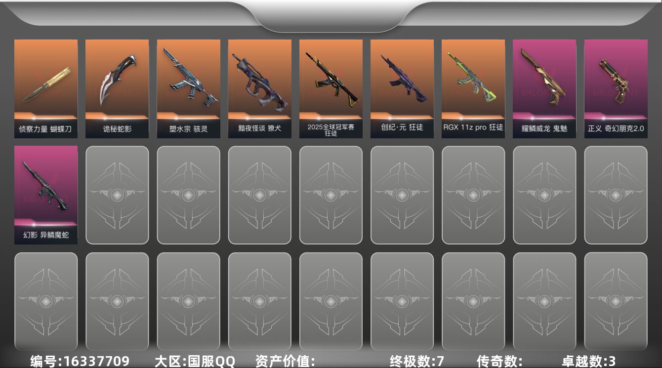 [16337709]【套装】:回火礼包// V25套装 【英雄】:幻棱,炼狱,维斯,暮蝶,壹决,铁臂,捷风,雷兹,幽影,不死鸟,贤者,猎枭,蝰蛇,零,芮娜,奇乐,尚勃勒,霓虹,斯凯,夜露,K/O,盖可,黑梦,钢锁 【近战武器】:近战武器-侦察力量 蝴蝶刀,近战武器-诡秘蛇影 军刀 【狂徒】:狂徒-2025全球冠军赛,狂徒-创·纪元,狂徒-RGX 11z Pro,狂徒-诡秘蛇影 【幻影】:幻影-异鳞魔蛇,幻影-末日之翼 【戍卫】:戍卫-折光棱晶 【獠犬】:獠犬-黯夜怪谈 【飞将】:飞将-末日之翼 【莽侠】:莽侠-诡秘蛇影 【奥丁】:奥丁-末日之翼 【判官】:判官-诡秘蛇影 【骇灵】:骇灵-塑水宗 【蜂刺】:蜂刺-折光棱晶 【标配】:标配-折光棱晶 【正义】:正义-奇幻朋克//2.0 【鬼魅】:鬼魅-耀鳞威龙,鬼魅-诡秘蛇影 【短炮】:短炮-末日之翼 【卡面】:无畏契约GO!第一卷:芮娜 卡面,复古浪潮 卡面,无畏契约GO!第一卷:零 卡面,无畏契约GO!第一卷:贤者 卡面,代号红色 卡面,新兵报到 卡面,V契约 卡面,无畏契约 卡面 【喷漆】:买装还是存钱 喷漆,无畏契约GO!第一卷:芮娜 喷漆,暴走萝莉 喷漆,胜利属于无畏契约 喷漆,GLHF 喷漆,无畏契约 喷漆 【挂饰】:天外飞客 挂饰,《双城之战》魄罗 挂饰,无畏契约 纪念币 挂饰