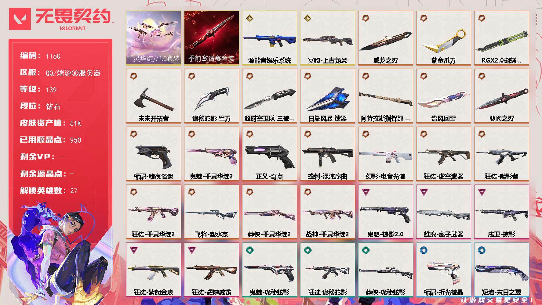 [16337589]【套装】:无畏契约季前邀请赛套装,千灵华绽//2.0套装 【英雄】:幻棱,炼狱,维斯,暮蝶,钛狐,壹决,铁臂,捷风,雷兹,幽影,不死鸟,贤者,猎枭,蝰蛇,零,芮娜,奇乐,尚勃勒,霓虹,斯凯,夜露,K/O,海神,盖可,黑梦,钢锁 【近战武器】:近战武器-无畏契约季前邀请赛 悲悯之刃,近战武器-流风回雪,近战武器-超时空卫队 三棱军刺,近战武器-RGX 11z Pro//2.0 蝴蝶刀,近战武器-紫金爪刀,近战武器-威龙之刃,近战武器-未来开拓者,近战武器-诡秘蛇影 军刀,近战武器-日耀风暴 遗器,近战武器-阿特拉斯指挥部 甩棍 【狂徒】:狂徒-虚空遗器,狂徒-噬影者,狂徒-千灵华绽//2.0,狂徒-耀鳞威龙,狂徒-紫阙金琅,狂徒-诡秘蛇影 【幻影】:幻影-源能者娱乐系统,幻影-电音光谱,幻影-末日之翼,幻影-电音光谱 【戍卫】:戍卫-掠影,戍卫-折光棱晶 【冥驹】:冥驹-上古龙炎 【飞将】:飞将-塑水宗,飞将-末日之翼 【莽侠】:莽侠-千灵华绽//2.0,莽侠-诡秘蛇影 【战神】:战神-千灵华绽//2.0 【奥丁】:奥丁-末日之翼 【判官】:判官-诡秘蛇影 【雄鹿】:雄鹿-离子武器 【蜂刺】:蜂刺-混沌序曲,蜂刺-折光棱晶 【标配】:标配-黯夜怪谈,标配-折光棱晶 【正义】:正义-奇点 【鬼魅】:鬼魅-千灵华绽//2.0,鬼魅-掠影//2.0,鬼魅-诡秘蛇影 【短炮】:短炮-末日之翼 【卡面】:梦幻奶茶 卡面,无畏契约GO!第一卷:芮娜 卡面,无畏契约GO!第一卷:零 卡面,比比看谁快? 卡面,势不可挡//盖可 卡面,别冒尖 卡面,代号红色 卡面,新兵报到 卡面,V契约 卡面,无畏契约 卡面 【喷漆】:超级粉丝 喷漆,捷风差距 喷漆,我的刀呢? 喷漆,不予置评 喷漆,买装还是存钱 喷漆,关门放狗 喷漆,红鳞 喷漆,胜利属于无畏契约 喷漆,GLHF 喷漆,无畏契约 喷漆 【挂饰】:V25第六幕:超凡 挂饰,袖珍捷风 挂饰,第九季//第一幕 纪念币 挂饰,天外飞客 挂饰,《双城之战》魄罗 挂饰,无畏契约 纪念币 挂饰