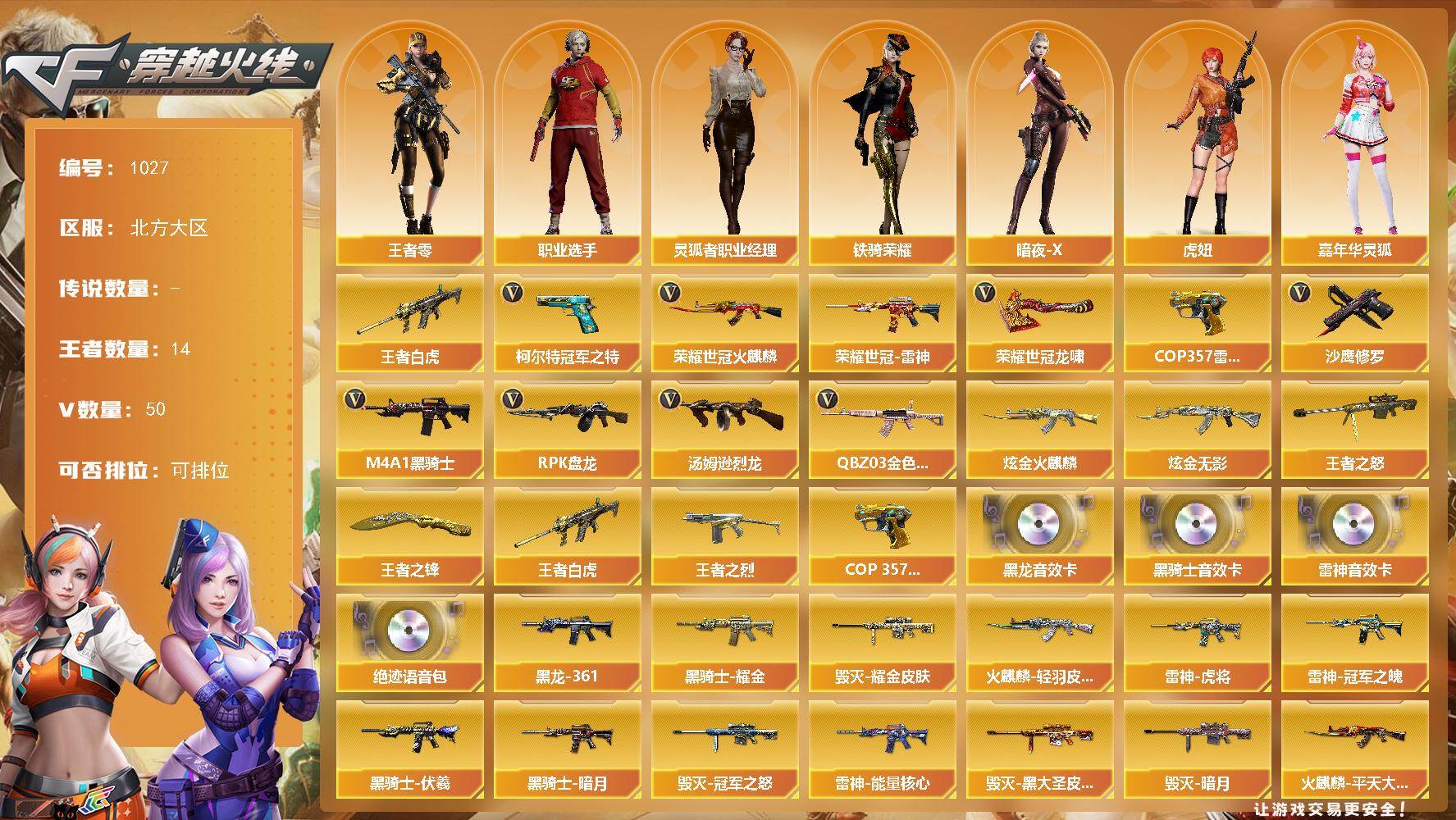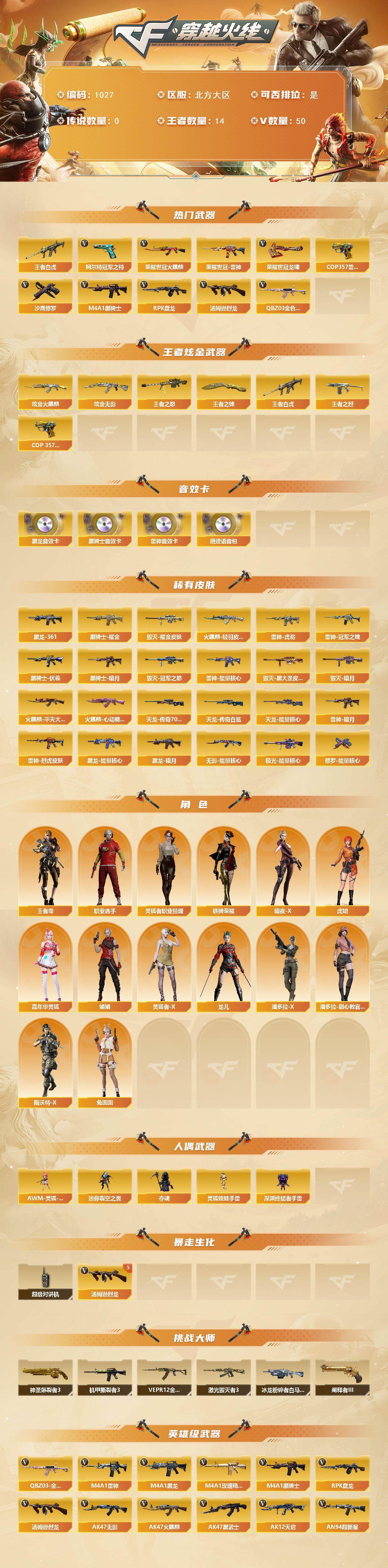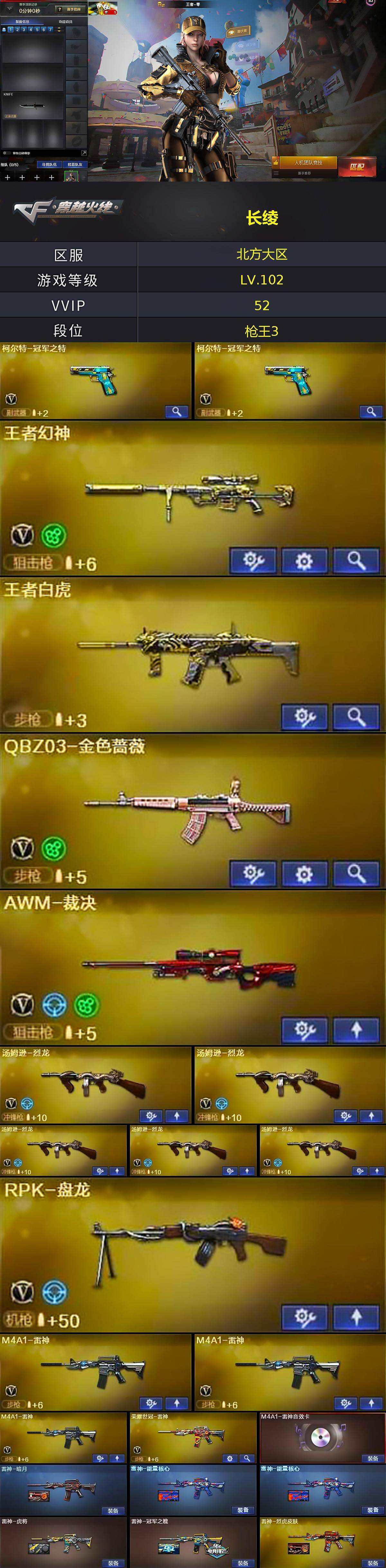 [16337697]北方大区-50V-14王者-2炫金 【热门武器】:王者白虎,QBZ03-金色蔷薇,荣耀世冠-火麒麟,荣耀世冠-雷神,柯尔特-冠军之特*2,M4A1-黑骑士*2,汤姆逊-烈龙*5,RPK-盘龙,COP 357-雷霆王者,沙鹰-修罗*4,荣耀世冠-龙啸 【王者炫金武器】:王者白虎,王者之烈,王者之怒*2,COP 357-雷霆王者,王者之锋*2,炫金火麒麟,炫金无影 【音效卡】:M4A1-雷神音效卡,M4A1-黑龙音效卡,M4A1-黑骑士音效卡,绝迹语音包 【皮肤】:雷神-暗月,雷神-能量核心*2,雷神-虎将,雷神-冠军之魄,雷神-烈虎皮肤,火麒麟-轻羽皮肤,火麒麟-平天大圣,火麒麟-心动糖果,毁灭-暗月,毁灭耀金皮肤,毁灭-冠军之怒,毁灭-黑大圣皮肤*2,黑龙-能量核心,黑龙-暗月,M4A1-黑龙-361,黑骑士-暗月*2,黑骑士耀金皮肤,黑骑士-伏羲,无影-能量核心,天龙-能量核心,AWM-天龙-传奇70KG,AWM-天龙-传奇白鲨,极光-能量核心,修罗-能量核心 【角色】:王者-零,暗夜-X,虎妞,嘉年华灵狐,娟娟,灵狐者-X,灵狐者-职业经理,龙儿,潘多拉-X,潘多拉-甜心教官,斯沃特-X,铁骑荣耀,兔囡囡,职业选手 【人偶武器】:AWM-灵狐-15周年嘉年华,迷你裂空之翼*8,夺魂,深渊终结者手雷,灵狐娃娃手雷 【暴走生化】:超级对讲机 【挑战大师】:神圣爆裂者III,冰龙粉碎者-白马银枪*2,VEPR-12-金魔,激光毁灭者III,机甲撕裂者III,阐释者III*2 【英雄级武器】:AK47-火麒麟*2,M4A1-黑龙,M4A1-雷神*3,M4A1-黑骑士*2,AK47-无影,AK47-黑武士,AK12-天启*2,AN94-超新星*2,无影-神兵利器,M4A1-玫瑰精灵,QBZ03-金色蔷薇,王者之势-觉醒版,王者炎心-觉醒版,荣耀世冠-火麒麟,荣耀世冠-雷神,AWM-天龙,Barrett-毁灭,Barrett-极光,AWM-裁决,王者幻神-觉醒版,RPK-盘龙,汤姆逊-烈龙*5,AA-12-雷霆,沙鹰-修罗*4,沙鹰-天神,柯尔特-冠军之特*2,屠龙,龙啸*2,擎天,麒麟刺,荣耀世冠-龙啸,高爆手雷-竞技荣光,闪光弹-竞技荣光,闪光弹-雷霆王者-觉醒版*2,烟雾弹-竞技荣光,烟雾弹-雷霆王者-觉醒版 【道具】:EDG炫彩背包,冰冰企鹅背包,战舰背包,炫彩背