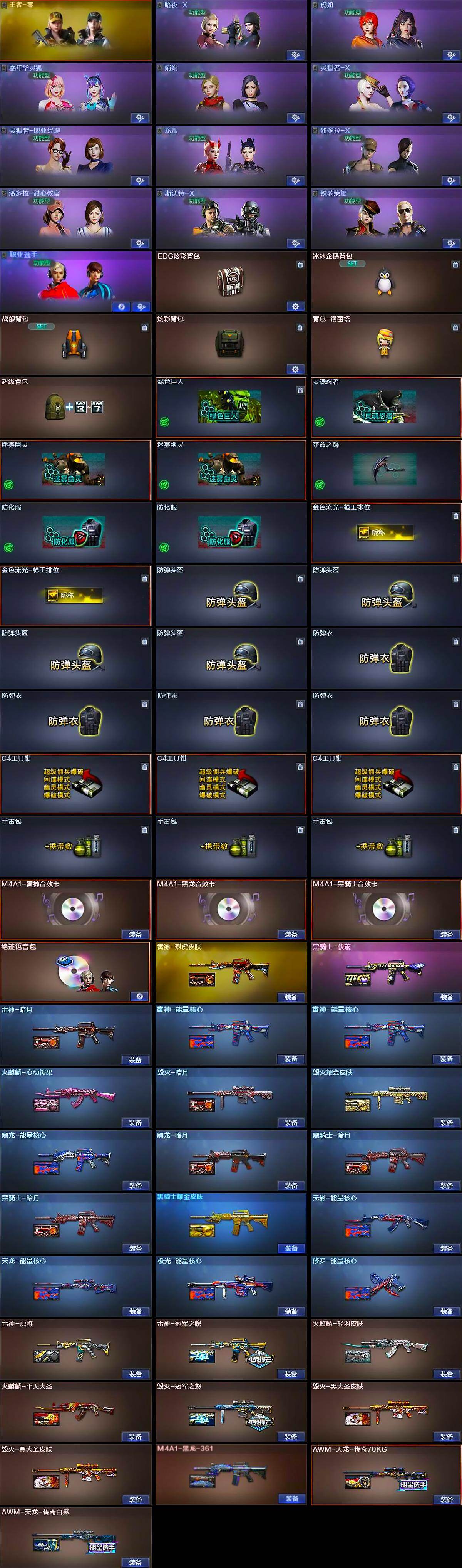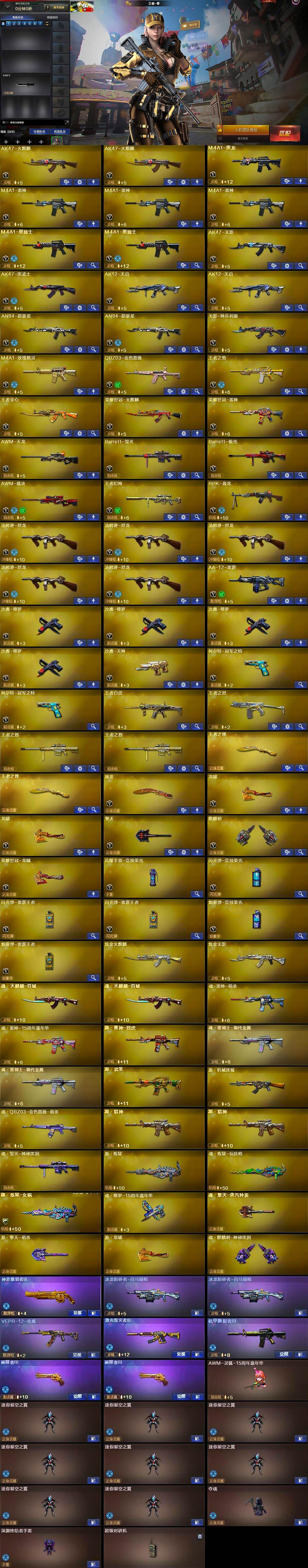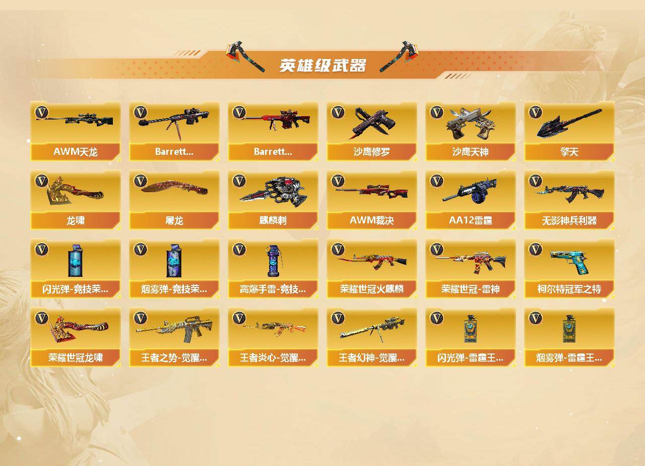 【英雄级武器】:AK47-火麒麟*2,M4A1-黑龙,M4A1-雷神*3,M4A1-黑骑士*2,AK47-无影,AK47-黑武士,AK12-天启*2,AN94-超新星*2,无影-神兵利器,M4A1-玫瑰精灵,QBZ03-金色蔷薇,王者之势-觉醒版,王者炎心-觉醒版,荣耀世冠-火麒麟,荣耀世冠-雷神,AWM-天龙,Barrett-毁灭,Barrett-极光,AWM-裁决,王者幻神-觉醒版,RPK-盘龙,汤姆逊-烈龙*5,AA-12-雷霆,沙鹰-修罗*4,沙鹰-天神,柯尔特-冠军之特*2,屠龙,龙啸*2,擎天,麒麟刺,荣耀世冠-龙啸,高爆手雷-竞技荣光,闪光弹-竞技荣光,闪光弹-雷霆王者-觉醒版*2,烟雾弹-竞技荣光,烟雾弹-雷霆王者-觉醒版