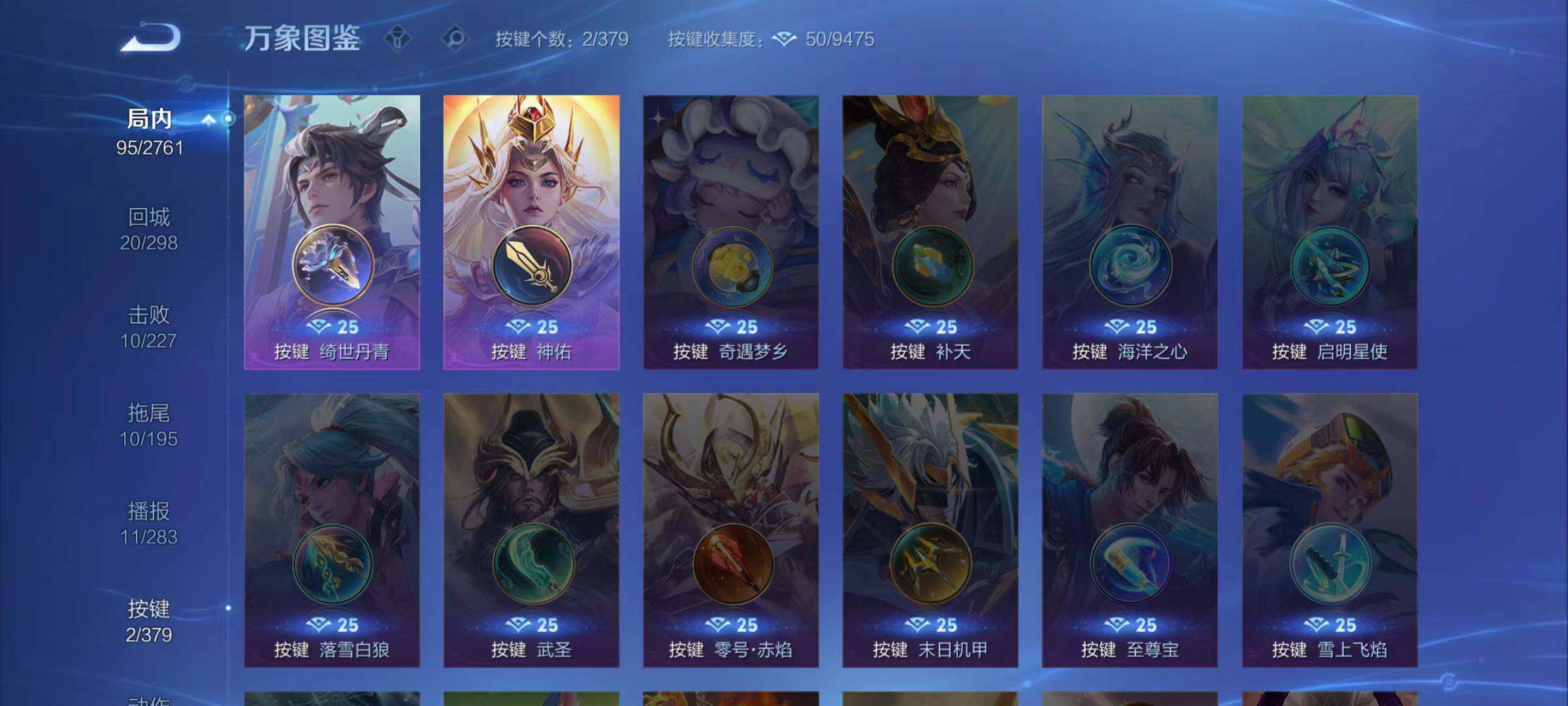 伽罗箭羽风息,李元芳逐浪之夏,公孙离无限星赏官,孙策猫狗日记,墨子龙骑士,嬴政摇滚巨星,刘禅天才门将,白起星夜王子,宫本武藏鬼剑武藏,钟馗乐园奇幻夜,蔡文姬舞动绿茵,墨子金属风暴,吕布圣诞狂欢,百里守约特工魅影,李白千年之狐,夏洛特永昼,澜赏金猎手,百里守约真我赫兹,高渐离燃音魔法,狄仁杰绮世丹青