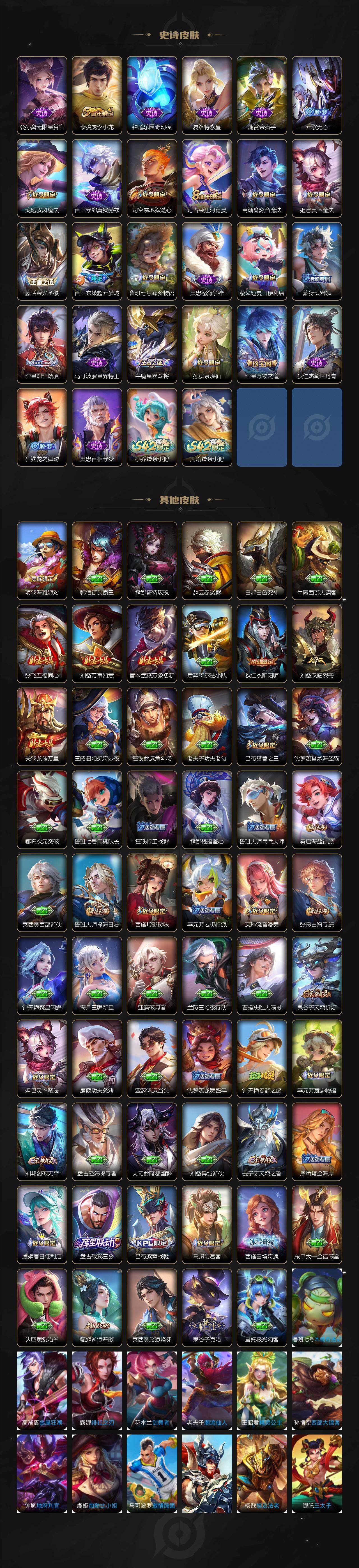【史诗皮肤】:赵云皇家上将,甄姬冰雪圆舞曲,狄仁杰魔术师,宫本武藏鬼剑武藏,孙尚香水果甜心,嬴政摇滚巨星,墨子龙骑士,墨子金属风暴,吕布圣诞狂欢,李白千年之狐,百里守约特工魅影,蔡文姬舞动绿茵,刘禅天才门将,李元芳逐浪之夏,白起星夜王子,孙策猫狗日记,伽罗箭羽风息,狄仁杰鹰眼统帅,公孙离无限星赏官,裴擒虎李小龙,钟馗乐园奇幻夜,夏洛特永昼,澜赏金猎手,元歌无心,戈娅驭风魔法,百里守约真我赫兹,司空震地狱燃心,阿古朵江河有灵,妲己灵卜魔法,高渐离燃音魔法,蒙恬荣光圣徽,百里玄策超元猎域,鲁班七号蔬乡物语,黄忠怒海争锋,蔡文姬夏日便利店,蒙犽顽岩魄,弈星炽弈燎原,马可波罗星界特工,牛魔星界战将,孙膑茶境仙,弈星万物之道,狄仁杰绮世丹青,狂铁龙之律动,黄忠百相守梦,小乔线条小狗,周瑜线条小狗
