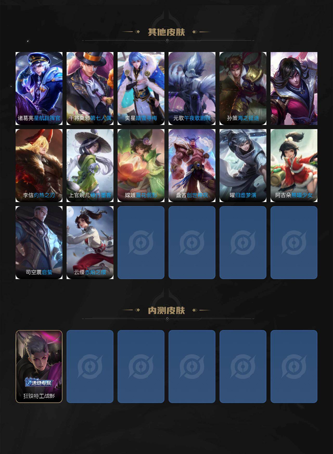 【其他皮肤】:项羽海滩派对,韩信街头霸王,露娜哥特玫瑰,赵云忍炎影,白起白色死神,牛魔西部大镖客,张飞五福同心,刘备万事如意,宫本武藏万象初新,后羿阿尔法小队,狄仁杰阴阳师,