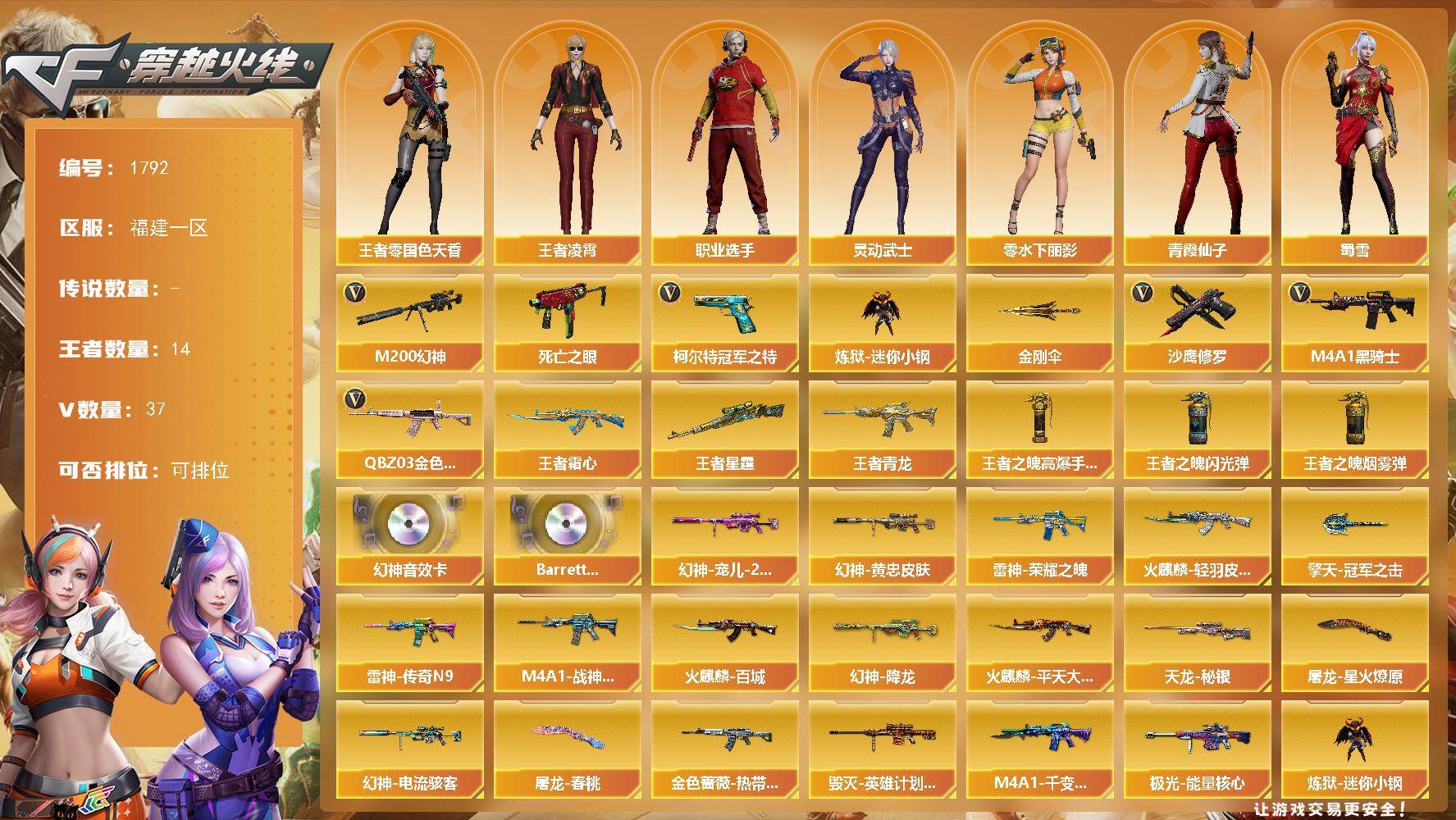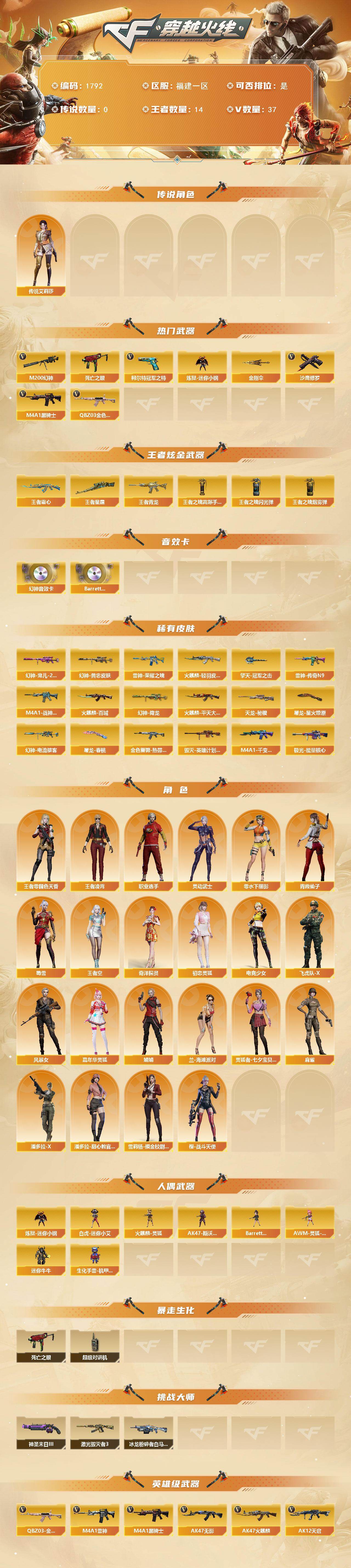 [16323102]福建一区-37V-14王者-0炫金 【传说角色】:传说艾莉莎 【热门武器】:QBZ03-金色蔷薇,M200-幻神,死亡之眼,柯尔特-冠军之特,炼狱-迷你小钢,M4A1-黑骑士,沙鹰-修罗*4,金刚伞 【王者炫金武器】:王者青龙,王者霜心,王者星霆,王者之魄高爆手雷*3,王者之魄闪光弹*3,王者之魄烟雾弹*2 【音效卡】:M200-幻神音效卡,Barrett-碧霄极光音效卡 【皮肤】:M200-幻神-黄忠皮肤,幻神-宠儿-2021MVP,幻神-降龙,幻神-电流骇客 皮肤,金色蔷薇-热带奇洋 皮肤,雷神-荣耀之魄,雷神-传奇N9,M4A1-战神赵云,火麒麟-轻羽皮肤,火麒麟-平天大圣,火麒麟-百城,毁灭-英雄计划 皮肤,M4A1-千变-孔明皮肤,天龙-秘银,极光-能量核心,屠龙-星火燎原,屠龙-春桃 皮肤,擎天-冠军之击 【角色】:王者-零-国色天香,王者凌霄,王者空,奇洋探员,初恋灵狐,电竞少女,飞虎队-X,风暴女,嘉年华灵狐,娟娟,兰-海滩派对,灵动武士,零-水下丽影,灵狐者-七夕宝贝,麻雀,潘多拉-X,潘多拉-甜心教官,青霞仙子,蜀雪,雪莉杨-摸金校尉,樱-战斗天使,职业选手 【人偶武器】:白虎-迷你小艾,火麒麟-灵狐,炼狱-迷你小钢,AWM-灵狐-15周年嘉年华,迷你牛牛,生化手雷-机甲核心,AK47-斯沃特,Barrett-夜玫瑰 【暴走生化】:死亡之眼,超级对讲机 【挑战大师】:冰龙粉碎者-白马银枪,激光毁灭者III,神圣爆裂者-末日III 【英雄级武器】:AK47-火麒麟,M4A1-雷神,M4A1-黑骑士,AK47-无影,AK12-天启,AN94-超新星,AK47-黑鲨,无影-神兵利器,QBZ03-云龙,黑武士-锦绣游龙,超新星-热带奇洋,QBZ03-金色蔷薇,王者之魄-觉醒版,白虎之魄-觉醒版,AWM-天龙,Barrett-毁灭,Barrett-极光,M200-幻神,王者之光-觉醒版,沙鹰-修罗*4,柯尔特-冠军之特,COP 357-云龙,USP-神工天巧,屠龙*2,擎天,麒麟刺,龙啸-热带奇洋,高爆手雷-神工天巧,高爆手雷-云龙,手雷-热带奇洋,闪光弹-神工天巧,闪光弹-云龙,烟雾弹-神工天巧,M4A1-赤狱骑士 【道具】:奇洋探员-海龟背包,炫彩背包,热带奇洋炫彩背包,黄金巨石泰坦-魔花研究所背包,黄金生化钩,绿色巨人,灵魂忍者,变异宝贝,迷雾幽灵