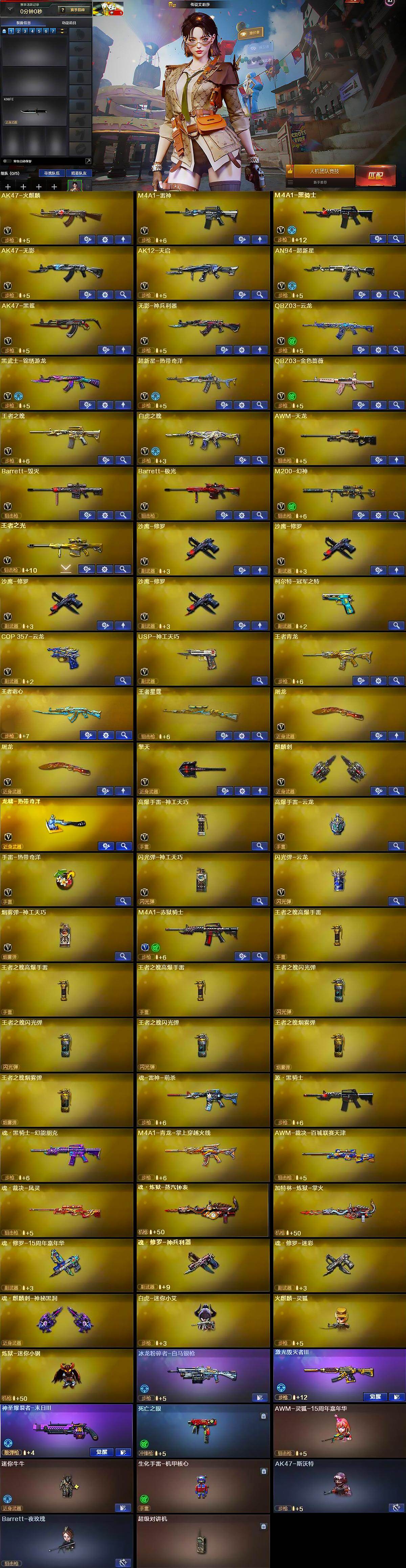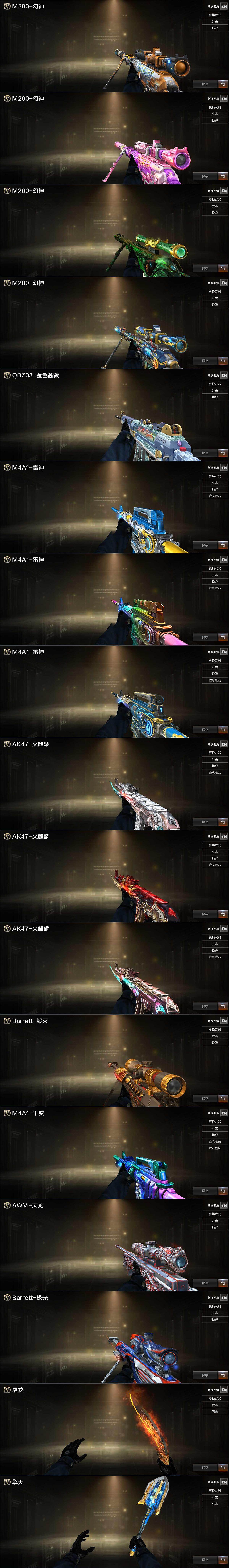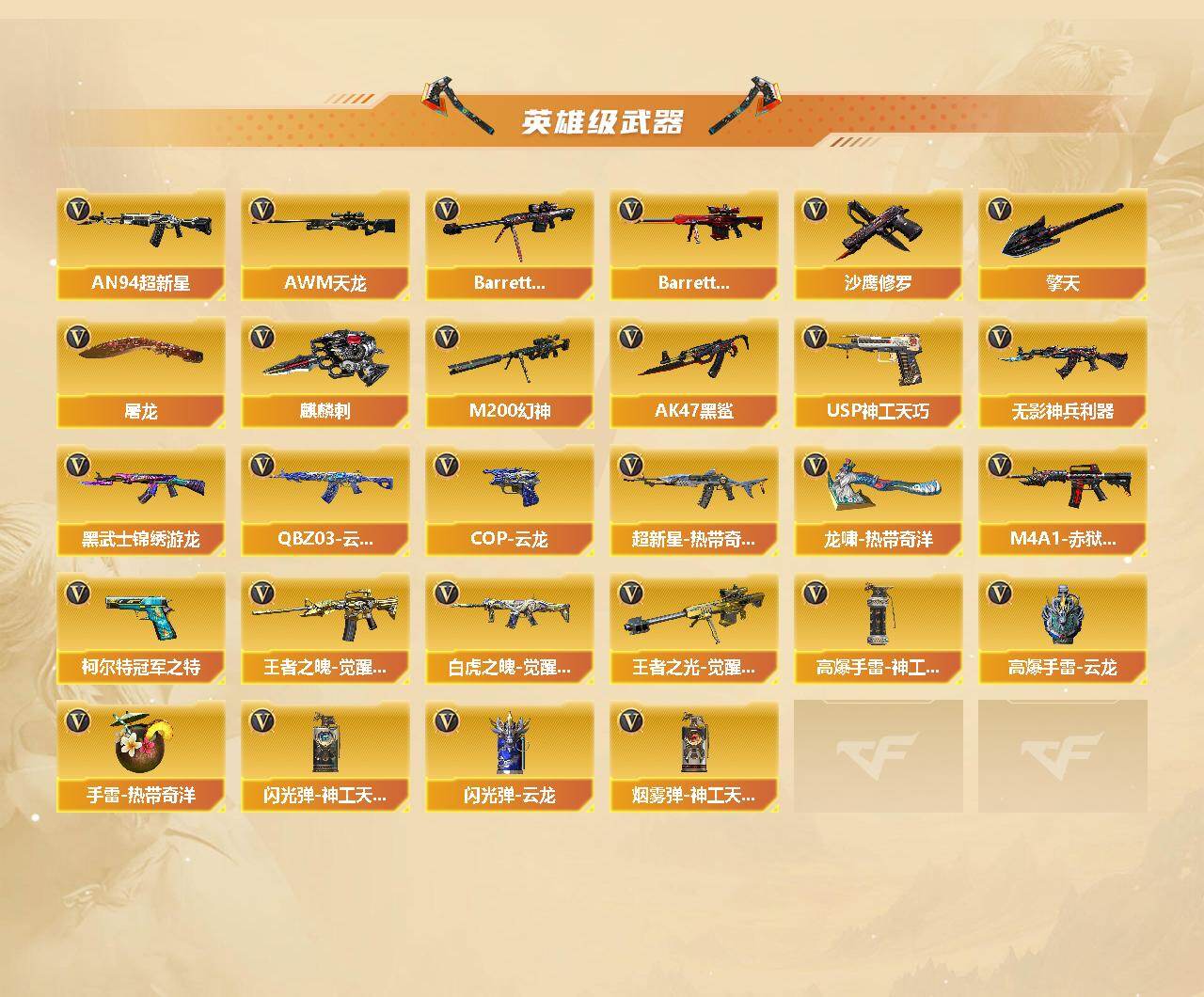 【英雄级武器】:AK47-火麒麟,M4A1-雷神,M4A1-黑骑士,AK47-无影,AK12-天启,AN94-超新星,AK47-黑鲨,无影-神兵利器,QBZ03-云龙,黑武士-锦绣游龙,超新星-热带奇洋,QBZ03-金色蔷薇,王者之魄-觉醒版,白虎之魄-觉醒版,AWM-天龙,Barrett-毁灭,Barrett-极光,M200-幻神,王者之光-觉醒版,沙鹰-修罗*4,柯尔特-冠军之特,COP 357-云龙,USP-神工天巧,屠龙*2,擎天,麒麟刺,龙啸-热带奇洋,高爆手雷-神工天巧,高爆手雷-云龙,手雷-热带奇洋,闪光弹-神工天巧,闪光弹-云龙,烟雾弹-神工天巧,M4A1-赤狱骑士