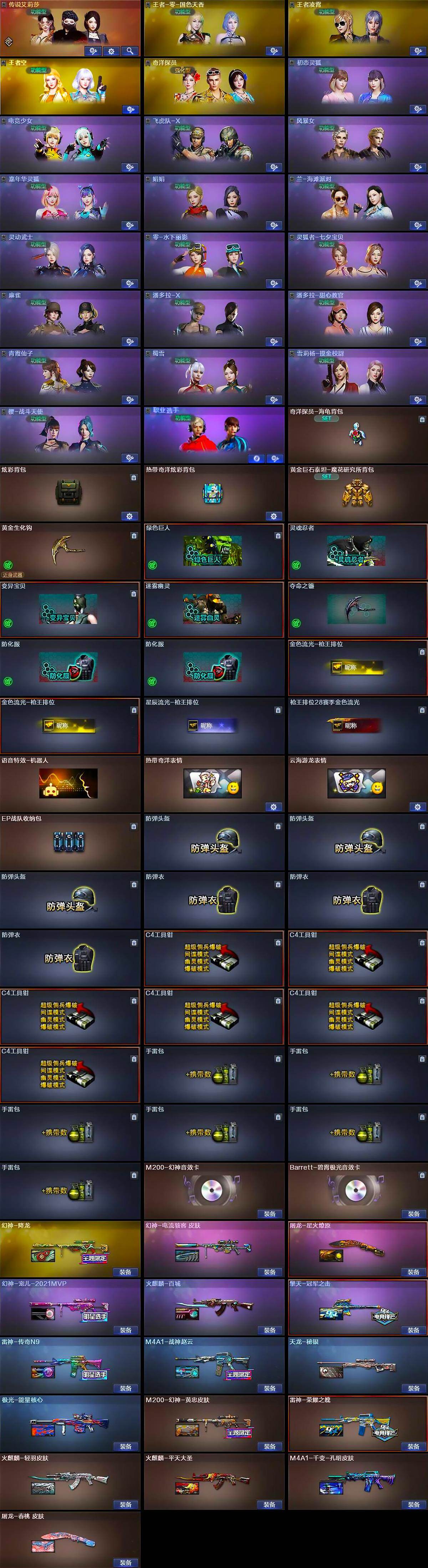 - [15246957]重庆一区-34V-1王者-1炫金 【传说武器】:传说破晓 【热门武器】:传说破晓,G36C-幻影,QBZ03-金色蔷薇,M200-幻神,M200-竞技荣光,炼狱-迷你小钢,加特林-炼狱,USP-雷暴 【王者炫金武器】:王者凤吟,炫金天龙 【音效卡】:炼狱-百战金芒-庆典舞曲音效卡 【皮肤】:幻神-丹凤,金色蔷薇-电竞之星 皮肤,雷神-荣耀之魄,雷神-脉冲核心,M4A1-再燃火线,火麒麟-白虎,火麒麟-心动糖果,战神-流金岁月皮肤,屠龙-荣耀之锋,轻型军用手斧-再燃火线 【角色】:电竞教官-云悠悠,乔伊教练,暗夜-X,嘉年华灵狐,娟娟,猎狐者-追月,零-热舞青春,灵狐者-X,灵狐者-七夕宝贝,麻雀,潘多拉-甜心教官,斯沃特-X,蜀雪,樱-缤纷夏日 【人偶武器】:炼狱-迷你小钢,AWM-灵狐-15周年嘉年华,生化手雷-机甲核心,迷你超能女侍 【暴走生化】:超级对讲机 【挑战大师】:冰龙粉碎者-白马银枪,激光毁灭者III-白马银枪,神圣爆裂者-末日III 【英雄级武器】:AK47-火麒麟,M4A1-雷神,AK12-天启,无影-神兵利器,G36C-幻影,QBZ03-金色蔷薇,M4A1-猎神,AK-47-猩红传说*3,Barrett-毁灭,M200-幻神,M200-竞技荣光,加特林-炼狱,炼狱-百战金芒,USP-雷暴,柯尔特-竞技荣光,擎天-竞技荣光*2,麒麟刺-百战金芒,高爆手雷-竞技荣光*2,闪光弹-竞技荣光*3,烟雾弹-竞技荣光*2,M4A1-赤狱骑士 【道具】:亚洲杯纪念炫彩背包,百战金芒炫彩背包,超级背包,女皇终结者-魔龙之吻,绿色巨人,灵魂忍者,变异宝贝,迷雾幽灵*2,生化弹匣,夺命之镰*2,防化服*3,金色流光-枪王排位*2,巅峰赛先锋-金色流光,流光-鎏金之域,枪王排位28赛季金色流光,枪王排位29赛季金色流光,语音特效-盛典烟火,萌萌小葵表情,电玩兔兔表情,C4-红龙,防弹头盔*3,防弹衣*3,C4工具钳*3,手雷包*3 【特殊枪械】:1炼狱
