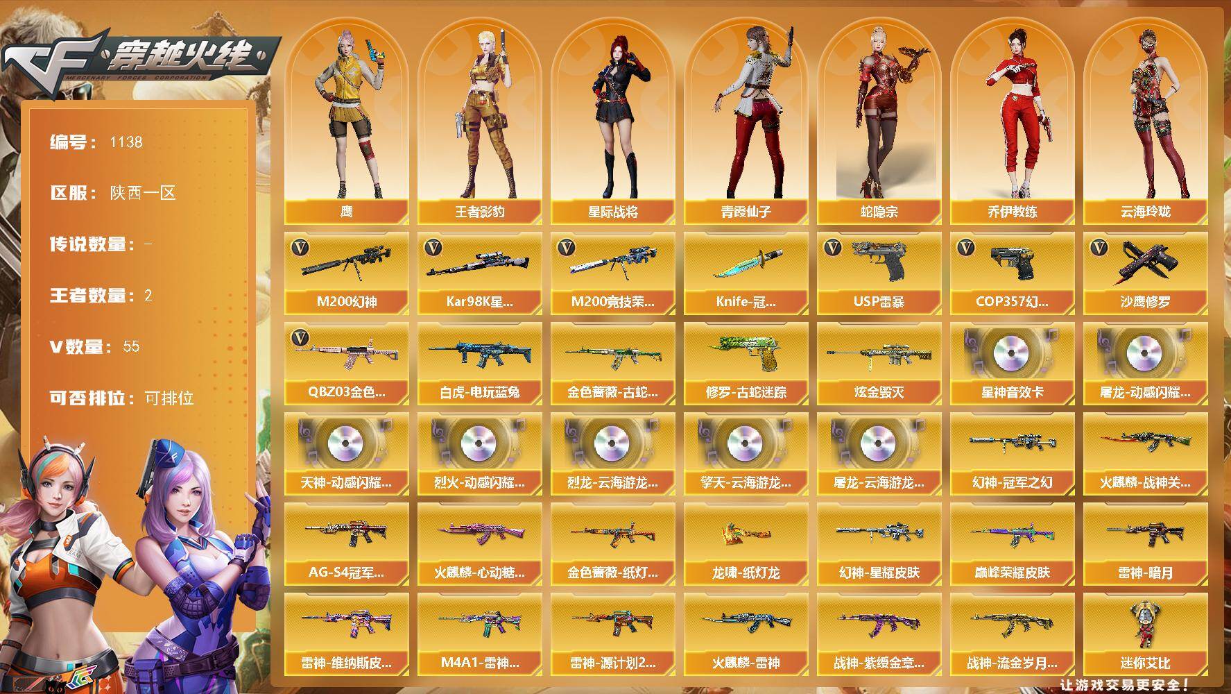 [16320651]陕西一区-55V-2王者-1炫金 【热门武器】:QBZ03-金色蔷薇,M200-幻神,金色蔷薇-古蛇迷踪,修罗-古蛇迷踪,M200-竞技荣光,白虎-电玩蓝兔,Kar98K-星神,USP-雷暴,COP 357-幻灵,沙鹰-修罗,Knife-冠军之刃 【王者炫金武器】:炫金毁灭 【音效卡】:屠龙-动感闪耀 音效卡,天神-动感闪耀 音效卡,烈火-动感闪耀 音效卡,烈龙-云海游龙音效卡,擎天-云海游龙音效卡,屠龙-云海游龙音效卡,Kar98K-星神音效卡 【皮肤】:幻神-冠军之幻,幻神-星耀 皮肤,金色蔷薇-纸灯龙皮肤,QBZ03-巅峰荣耀皮肤,雷神-暗月,雷神-维纳斯皮肤,M4A1-雷神-巅峰荣耀皮肤,雷神-源计划2.0专属 皮肤,火麒麟-雷神*2,火麒麟-战神关羽,火麒麟-心动糖果,黑骑士-AG-S4冠军典藏,战神-紫绶金章皮肤,战神-流金岁月皮肤,龙啸-纸灯龙皮肤 【角色】:鹰,星际战将,王者影豹,蛇隐宗,奇洋探员,乔伊教练,云海玲珑,暗夜-X,飞虎队-X,风暴女,嘉年华灵狐,兰-新年限定,灵狐者-X,曼陀罗-X,潘多拉-X,青霞仙子,蛇姬,斯沃特-X,新娜塔莎,游珑儿 【人偶武器】:AWM-灵狐-15周年嘉年华,海滩汪汪-巴雷特,迷你牛魔王,夺魂,迷你火种,迷你艾比,迷你超能女侍 【暴走生化】:黑龙吞噬者 【挑战大师】:冰龙粉碎者-白马银枪,试炼破坏者III,神圣爆裂者-末日III 【英雄级武器】:AK47-火麒麟,M4A1-雷神,AN94-超新星,无影-神兵利器,黑武士-锦绣游龙,超新星-热带奇洋,金色蔷薇-古蛇迷踪,QBZ03-金色蔷薇,烈火-动感闪耀,AK-47-猩红传说,AK47-B-战神*2,白虎-电玩蓝兔,Barrett-毁灭,M200-幻神,Kar98K-星神,M200-竞技荣光,烈龙-云海游龙,沙鹰-修罗,USP-雷暴,COP 357-幻灵,柯尔特-竞技荣光,天神-动感闪耀,修罗-古蛇迷踪,龙啸,幻灵之锋,擎天-竞技荣光,屠龙-动感闪耀,擎天-云海游龙,龙啸-热带奇洋,屠龙-云海游龙,高爆手雷-幻灵*5,高爆手雷-竞技荣光*2,手雷-动感闪耀,手雷-云海游龙,手雷-热带奇洋,高爆手雷-古蛇迷踪,闪光弹-幻灵*4,闪光弹-竞技荣光*3,烟雾弹-幻灵*4,烟雾弹-竞技荣光*3,烟雾弹-古蛇迷踪,烟雾弹-雷霆王者-觉醒版*2,M4A1-赤狱骑士 【道具】