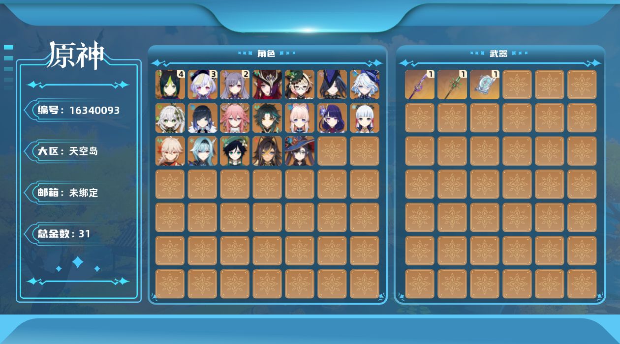 [16340093]58级/31黄/男主/19个五星角色/3个五星武器 0命克洛琳德,0命芙宁娜,0命迪希雅,0命纳西妲,4命提纳里,0命夜兰,0命八重神子,0命优菈,0命雷电将军,0命枫原万叶,0命神里绫华,0命魈,0命温迪,0命珊瑚宫心海,2命刻晴,3命七七,0命莫娜,0命艾梅莉埃,0命恰斯卡,精1薙草之稻光,精1四风原典,精1和璞鸢