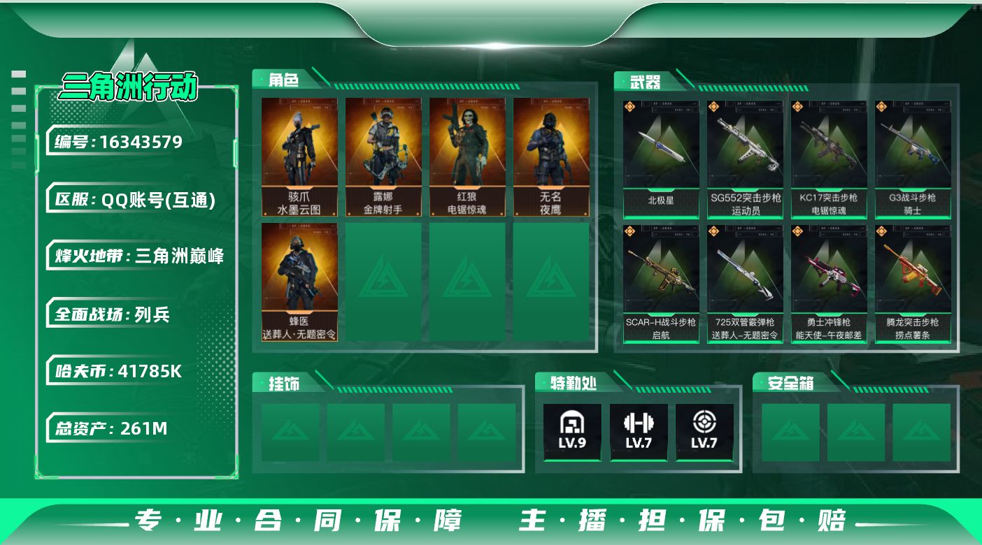 [16343579]可二次【店主推荐捡漏号】261m总资产-41785k哈伏币-60烽火等级-三角洲巅峰-17战场等级-列兵 【干员外观】:骇爪-水墨云图,蜂医-送葬人·无题密令,无名-夜鹰,红狼-电锯惊魂,露娜-金牌射手 【近战皮肤】:近战-北极星,近战-黑鹰 【传说外观】:M4A1突击步枪-蚀金玫瑰,M4A1突击步枪-阿米娅,SG552突击步枪-运动员,AK-12突击步枪-夜鹰,AK-12突击步枪-特斯拉线圈,SCAR-H战斗步枪-水墨云图,SCAR-H战斗步枪-启航,G3战斗步枪-骑士,CAR-15突击步枪-阿米娅,腾龙突击步枪-捞点薯条,K437突击步枪-北极星,KC17突击步枪-电锯惊魂,UZI冲锋枪-特斯拉线圈,SMG-45冲锋枪-骑士,SR-3M紧凑突击步枪-特斯拉线圈,勇士冲锋枪-能天使-午夜邮差,QCQ171冲锋枪-北极星,725双管霰弹枪-送葬人-无题密令,SR-25射手步枪-水墨云图,AWM狙击步枪-捞点薯条,93R-捞点薯条,复合弓-黑·天际线 【史诗外观】:AKM突击步枪-林中猎手,QBZ95-1突击步枪-曙光,ASh-12战斗步枪-守夜人,M16A4突击步枪-竞赛选手,M7战斗步枪-百步穿杨,SG552突击步枪-尖端治疗,SG552突击步枪-深海恐惧,SCAR-H战斗步枪-囚徒,G3战斗步枪-流沙送葬,AS Val突击步枪-尖端治疗,AS Val突击步枪-百步穿杨,腾龙突击步枪-无垢,腾龙突击步枪-猎鳄行动,MP5冲锋枪-深海恐惧,MP5冲锋枪-战术竞备,MP5冲锋枪-竞技风,Vector冲锋枪-阿萨拉文明,Vector冲锋枪-百步穿杨,SR-3M紧凑突击步枪-荒野求生,SR-3M紧凑突击步枪-战术竞备,勇士冲锋枪-深海恐惧,勇士冲锋枪-工业狂潮,MP7冲锋枪-无垢,M1014霰弹枪-林中猎手,PKM通用机枪-蝮蛇,PKM通用机枪-守夜人,PKM通用机枪-荒野求生,M250通用机枪-囚徒,SVD狙击步枪-暗夜猎手,SVD狙击步枪-荒野求生,M14射手步枪-黑鹰坠落,M14射手步枪-工业狂潮,SR-25射手步枪-尖端治疗,PSG-1射手步枪-无垢,SV-98狙击步枪-林中猎手,SV-98狙击步枪-囚徒,M700狙击步枪-守夜人,M700狙击步枪-百步穿杨,AWM狙击步枪-流沙送葬,QSZ92G-风林火山,.357左轮-幸运时刻 【稀有外观】:M4A1突击步枪