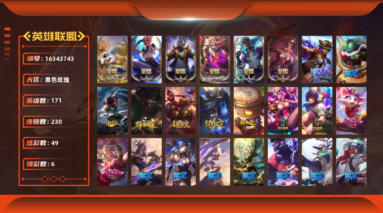 未定级段位-171英雄-230皮肤-49炫彩-0终极-8神话-27限定-26传说-50史诗